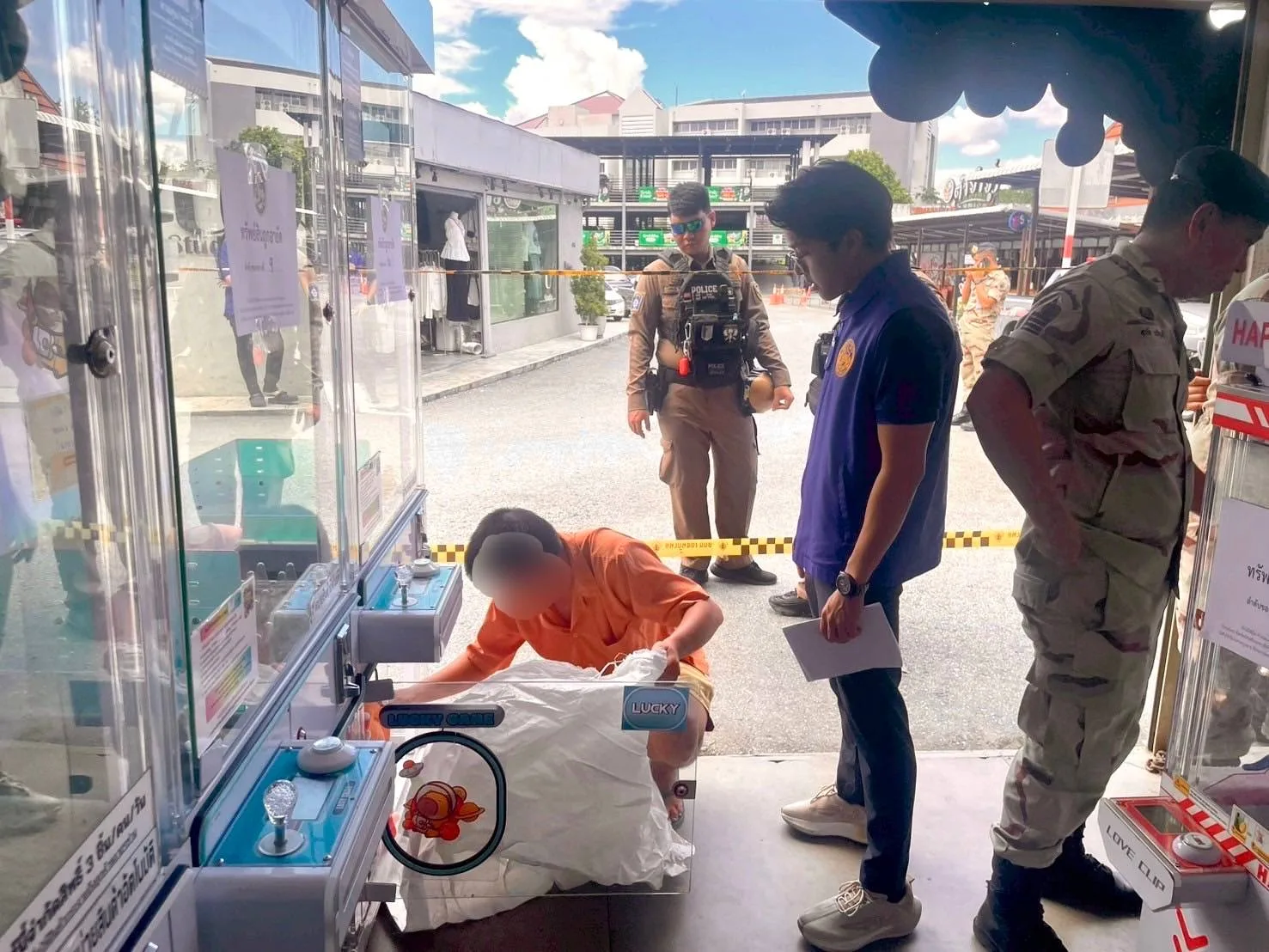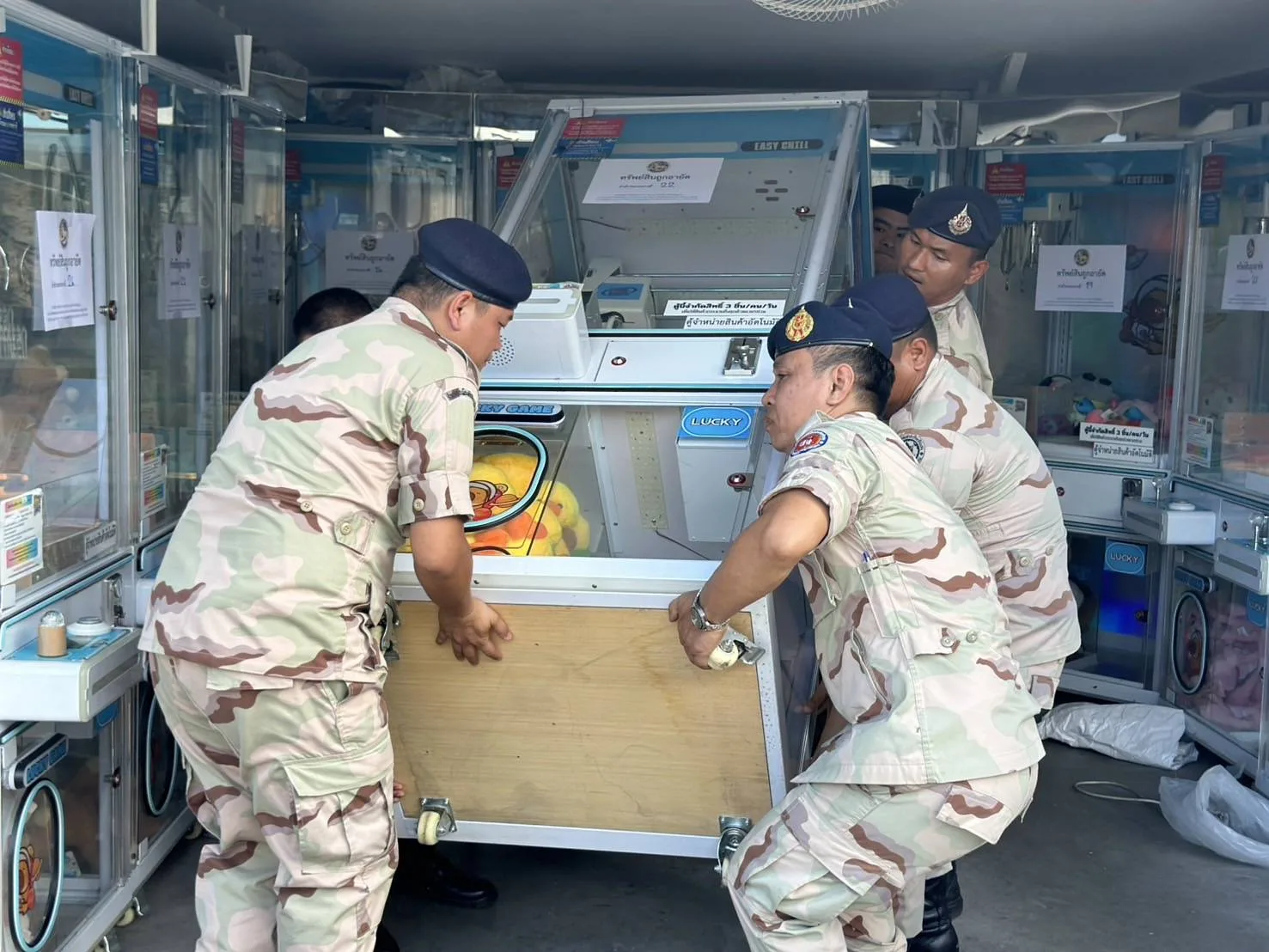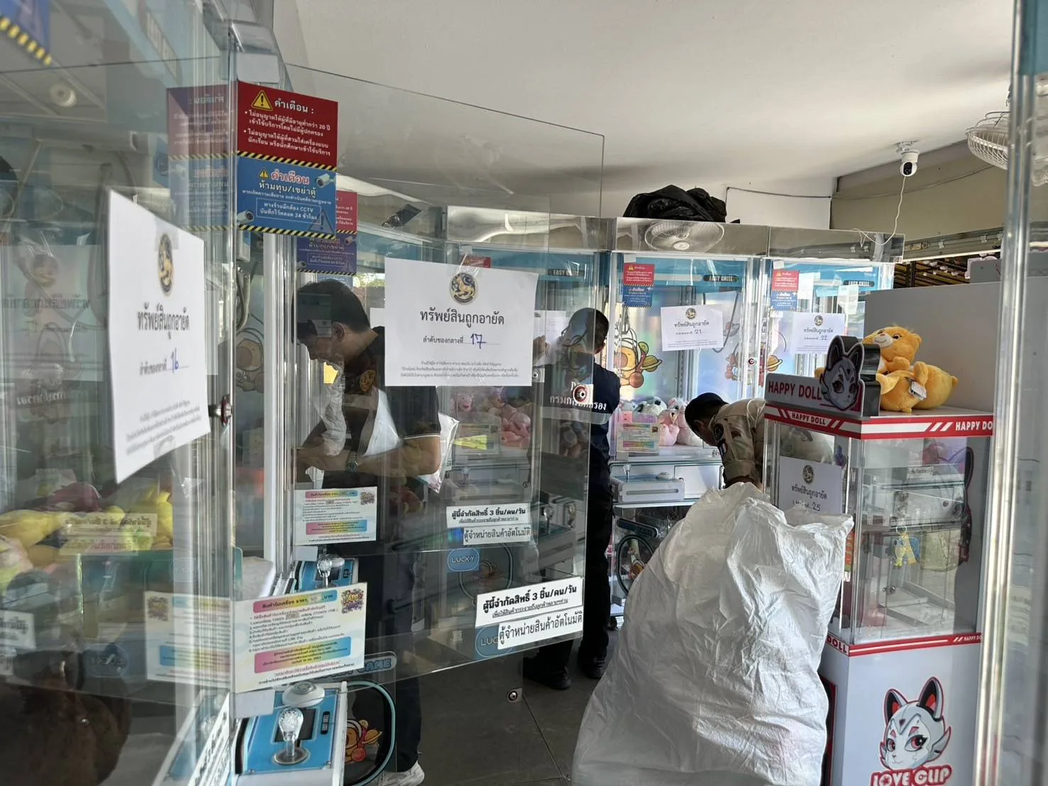 จากการตรวจค้นของเจ้าหน้าที่ชุดจับกุมพบว่า ภายในสถานประกอบการ ประกอบไปด้วย ตู้คีบตุ๊กตาแบบหยอดเหรียญ 26 เครื่อง ตู้แลกเหรียญ 1 เครื่อง และตู้กดตุ๊กตาแบบล้อหมุน 2 เครื่อง ที่เปิดให้บริการอยู่ เจ้าหน้าที่ชุดจับกุมจึงได้ติดต่อเจ้าของร้าน ผู้ดูแลมารับทราบการตรวจค้น โดยให้สาธิตวิธีการเล่นตู้คีบตุ๊กตาภายในร้าน