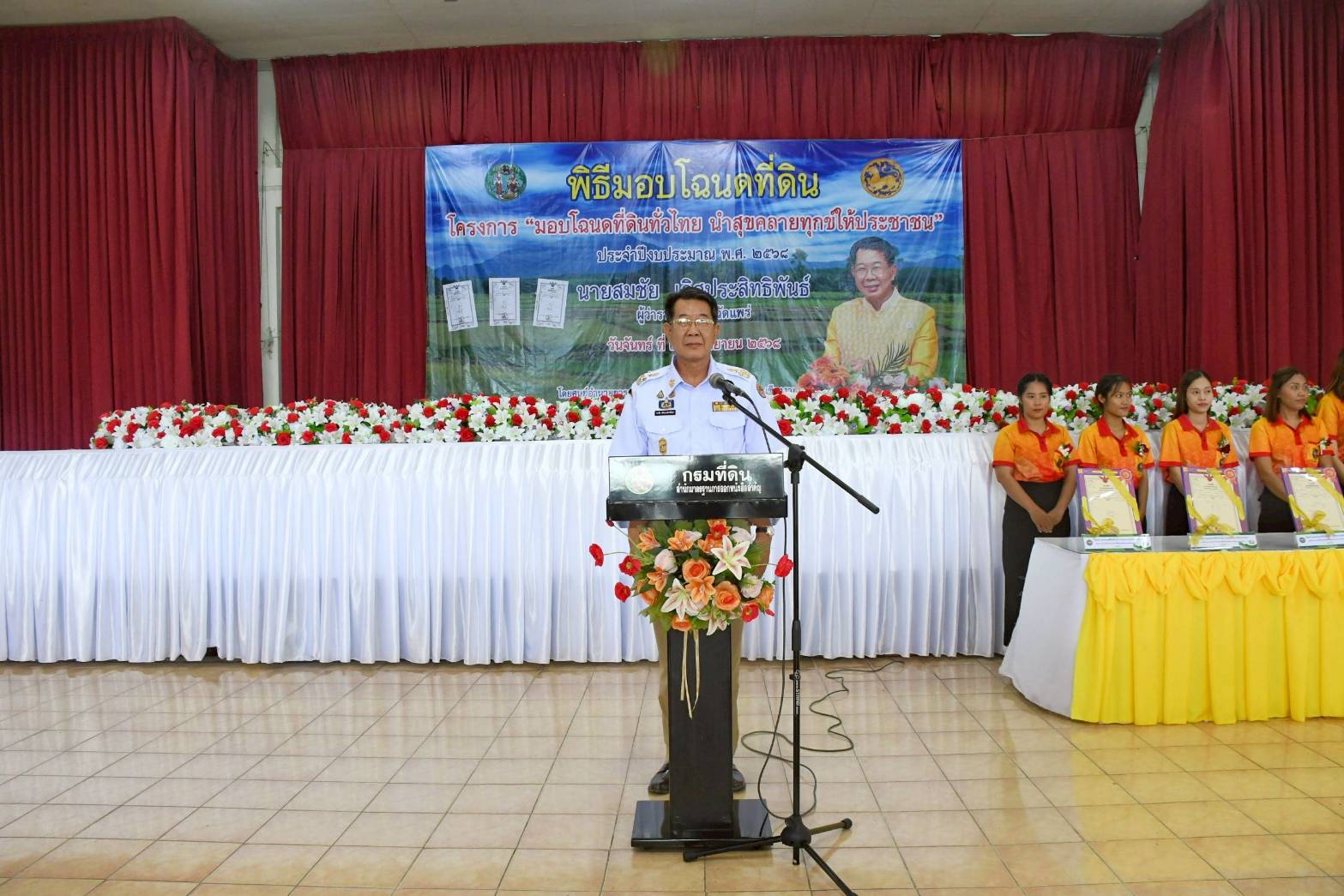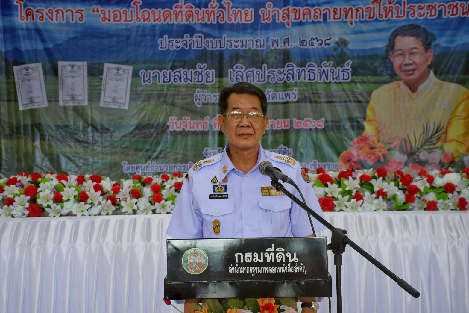 **นายสุพจน์ เพ็งประพันธ์ เจ้าพนักงานที่ดินจังหวัดแพร่ กล่าวว่ากรมที่ดินมีภารกิจสำคัญในการออกหนังสือสิทธิในที่ดินให้แก่ประชาชน เพื่อแก้ไขปัญหาความเดือดร้อนด้านที่ดินทำกินและตอบสนองต่อนโยบายรัฐบาลในการลดความเหลื่อมล้ำทางสังคม รวมถึงสร้างโอกาสในการเข้าถึงทรัพยากรของรัฐอย่างเป็นธรรม โดยการใช้เทคโนโลยีรังวัดด้วยดาวเทียมที่ช่วยกำหนดแนวเขตที่ดินได้อย่างชัดเจน ป้องกันการบุกรุกที่ดินของรัฐ และคุ้มครองสิทธิในที่ดินของประชาชน
