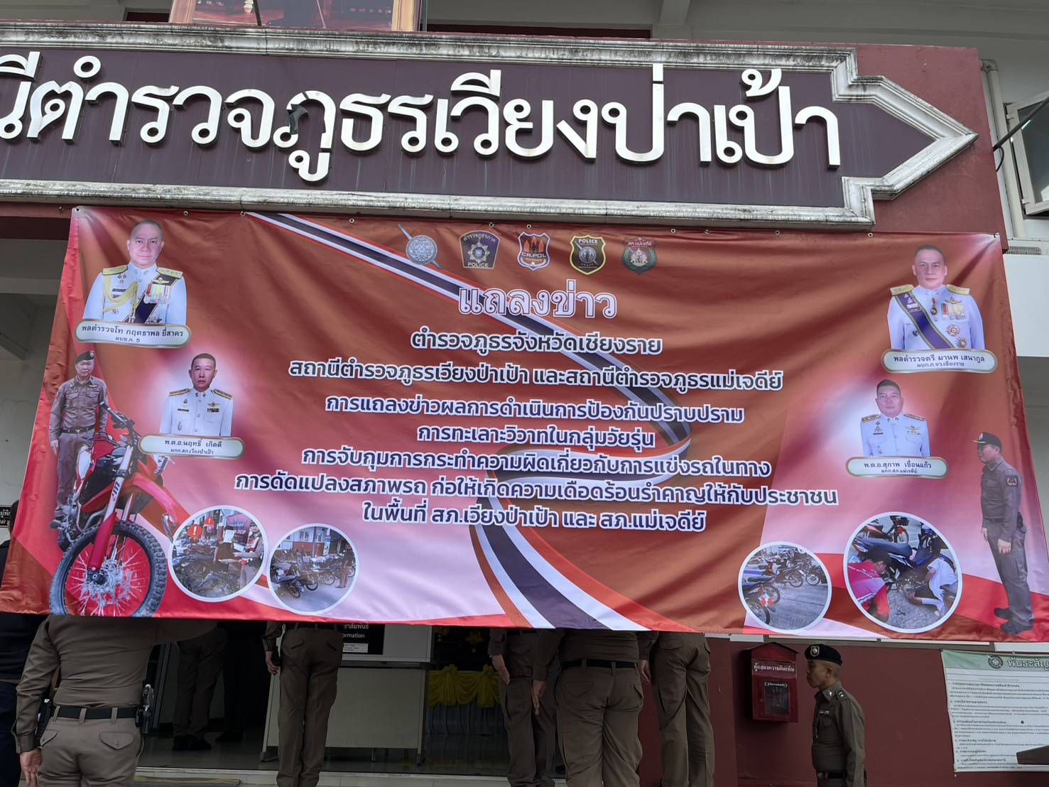 พล.ต.ต.มานพ เสนากูล ผบก.ภ.จว.เชียงราย เผยว่า สาเหตุที่ต้องมีการแถลงข่าวในวันนี้ก็เนื่องมาจาก ทางเจ้าหน้าที่ตำรวจได้รับการร้องเรียนหลายครั้ง ว่าในเขต อ.เวียงป่าเป้า มีกลุ่มวัยรุ่นขับขี่รถจักรยานยนต์ที่รบกวนความสงบสุขของพี่น้องประชาชน และมีความเสี่ยงที่จะเกิดอุบัติเหตุ ทำให้พี่น้องประชาชนรวมไปถึงนักท่องเที่ยวที่ใช้รถใช้ถนนมีความรู้สึกไม่ปลอดภัยในการใช้รถใช้ถนน ทาง สภ.เวียงป่าเป้า และ สภ.แม่เจดีย์ ก็ได้มีการบูรณาการกันลงพื้นที่และตรวจยึดรถที่เข้าข่ายกระทำผิดกฏหมาย ไม่ว่าจะเป็นการดัดแปลงสภาพรถ การใช้ท่อไอเสียเสียงดัง รวมถึงนำตัวผู้ขับขี่มาดำเนินการตามกฏหมาย ในจำนวนผู้ขับขี่ที่ถูกจับกุมในครั้งนี้มีทั้งหมด 14 ราย และในจำนวนนี้มีเยาวชนอายุไม่ถึง 18 ปี จำนวน 2 ราย ซึ่งเจ้าหน้าที่ตำรวจจะต้องมีการดำเนินคดีกับผู้ปกครองตาม พรบ.คุ้มครองเด็ก ซึ่งถือเป็นนโยบายที่ขยายครอบคลุมไปถึงตัวผู้ปกครอง มีการดำเนินคดีกันไปตามกฏหมาย เกี่ยวกับการปล่อยปละละเลยเด็กและเยาวชนที่อยู่ภายใต้การปกครอง แล้วแต่ดุลยพินิจของศาลจะตัดสิน