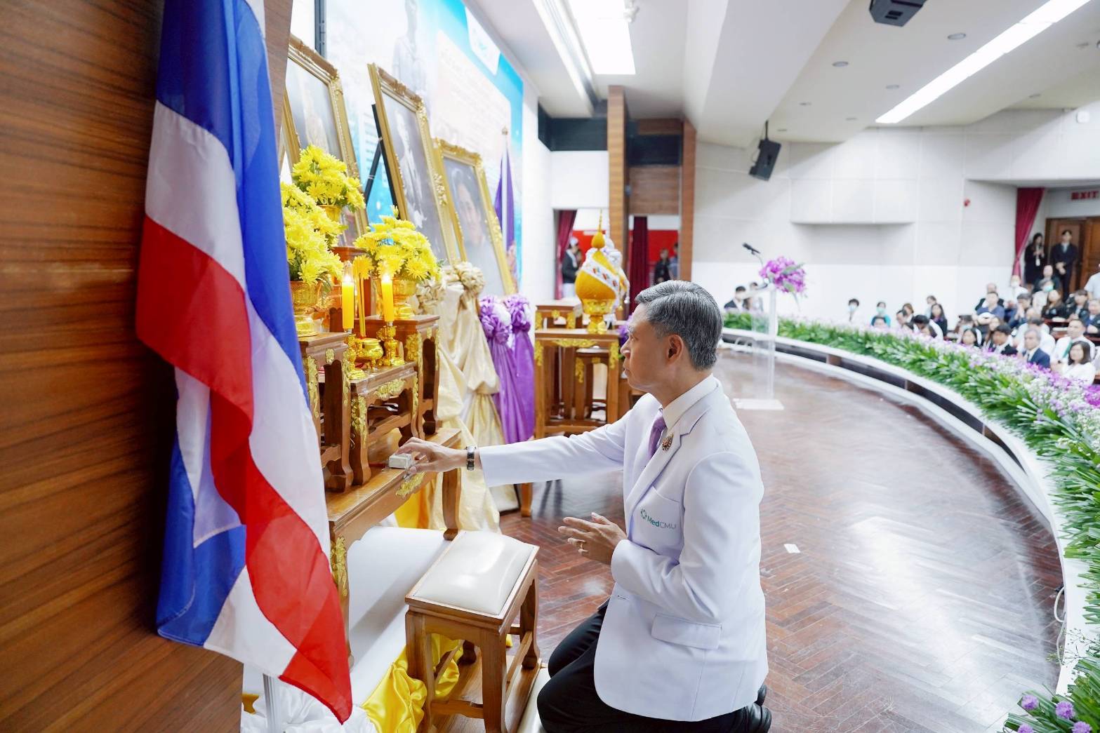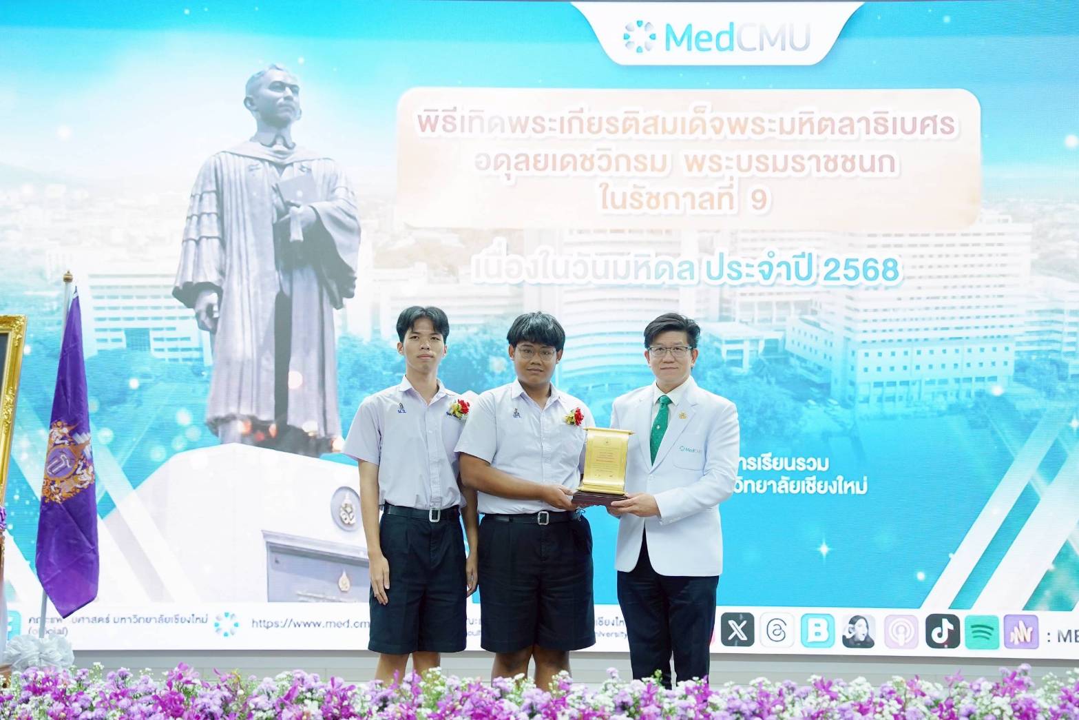 ศ.ดร.นพ.พงษ์รักษ์ ศรีบัณฑิตมงคล อธิการบดีมหาวิทยาลัยเชียงใหม่ เป็นประธานในพิธี และกล่าวถวายราชสดุดีพระเกียรติคุณสมเด็จพระมหิตลาธิเบศร อดุลยเดชวิกรม พระบรมราชชนก ในรัชกาลที่ 9 เนื่องในวัน “มหิดล” ประจำปี 2568 พระบิดาแห่งการแพทย์แผนปัจจุบันของไทย และพระบิดาแห่งการอุดมศึกษาไทย และ รศ.นพ.กิตติภัต เจริญขวัญ ประธานคณะอนุกรรมการฝ่ายพิธีการฯ กล่าวรายงาน