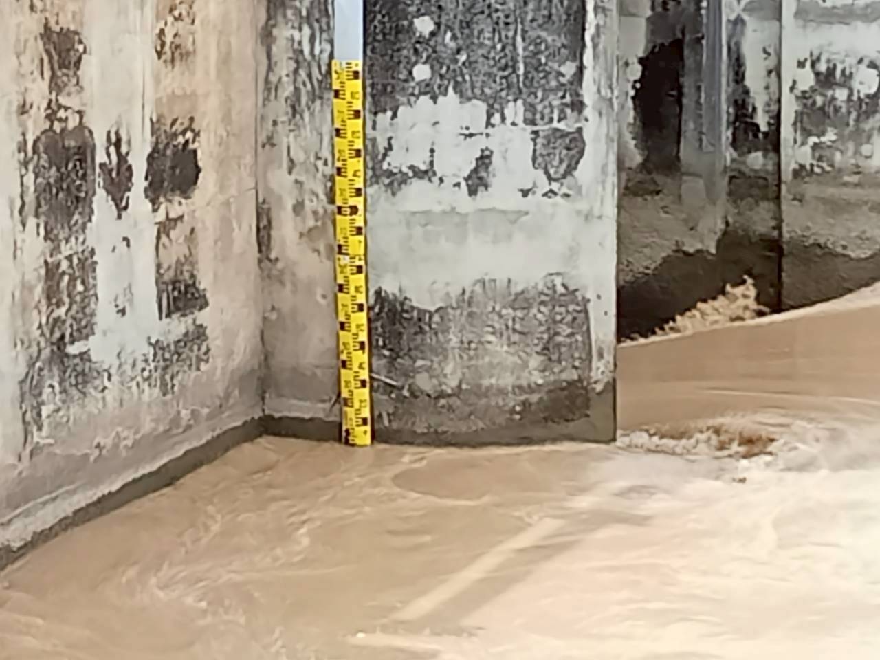 2.3 ฝายหนองสลีก ต.บ้านเรือน ประตูระบายทรายเปิดทุกบานประตู 4 ประตู / ประตูบานพับ พับทุกบานประตู จำนวน 5 ประตู ระดับน้ำ 3.88 ม.
