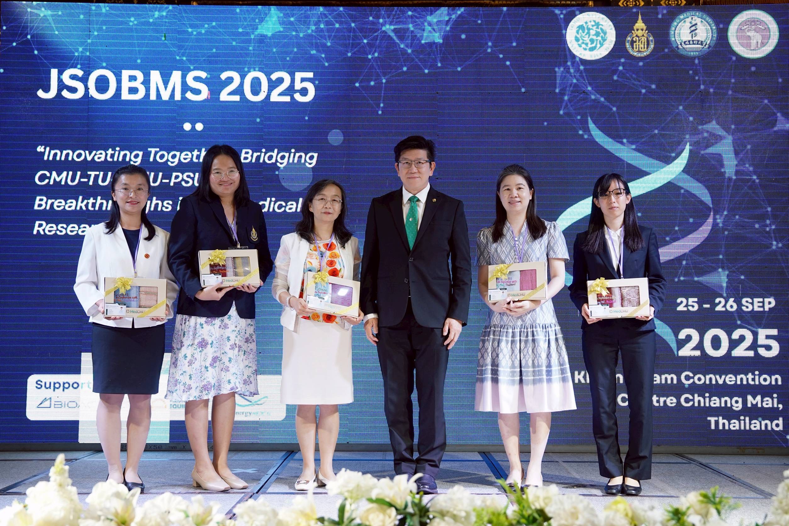 เมื่อวันที่ 26 กันยายน 2568 ณ ศูนย์ประชุมนานาชาติคุ้มคำ จ.เชียงใหม่ รศ.นพ.นเรนทร์ โชติรสนิรมิต คณบดีคณะแพทยศาสตร์ มช. เป็นประธานในพิธีปิดการประชุมวิชาการ Joint Seminar on Biomedical Science (JSOBMS) ครั้งที่ 13 ภายใต้หัวข้อ Innovating Together: Bridging CMU-TU-KMU-PSU for Breakthroughs in Biomedical Research ที่จัดขึ้นในวัน 25-26 กันยายน 2568