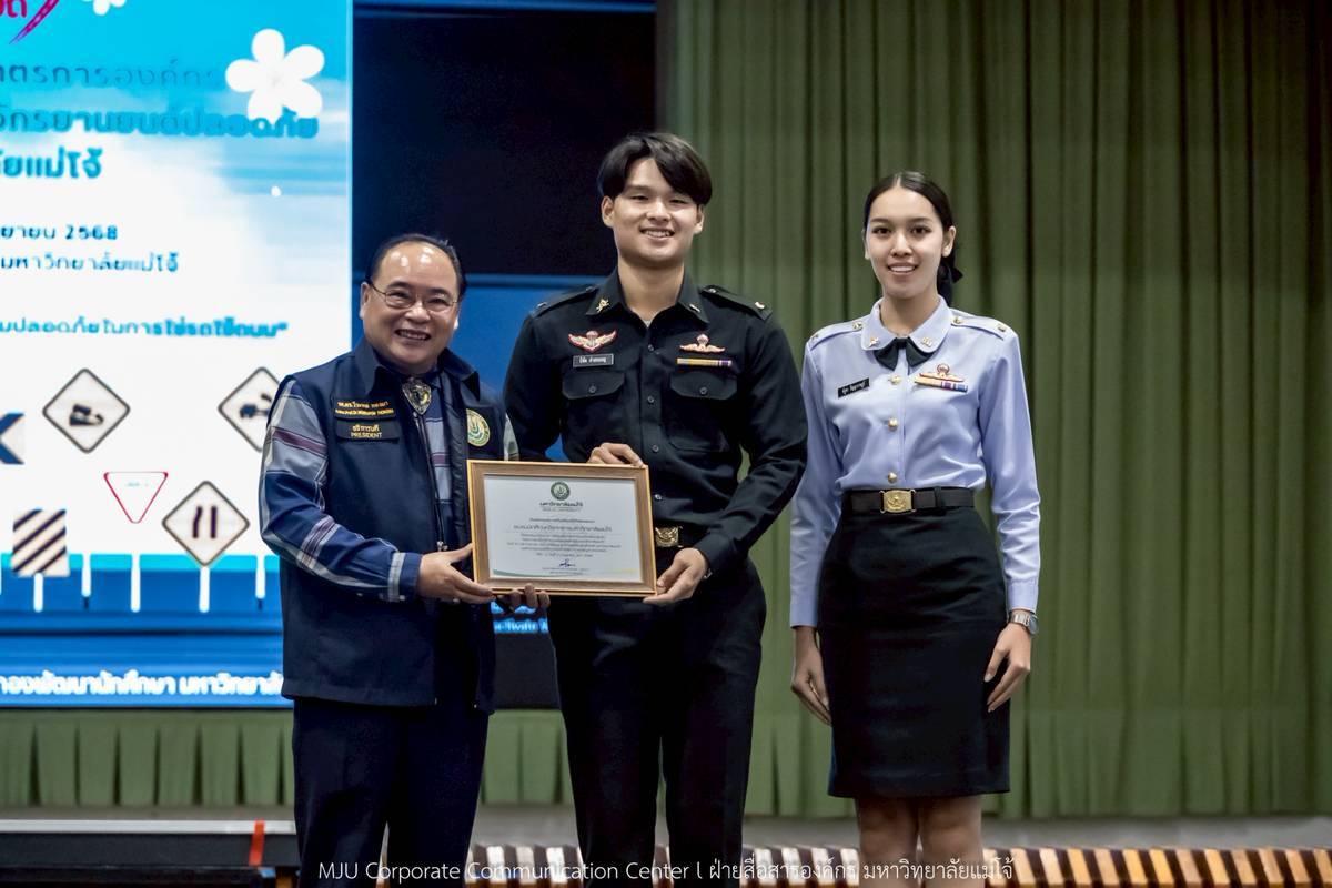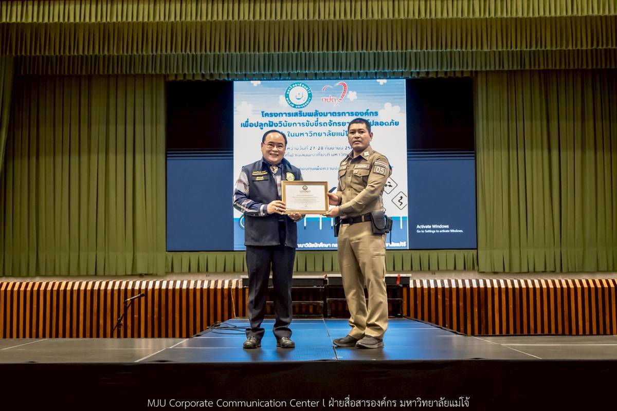 มหาวิทยาลัยแม่โจ้ ได้ดำเนินกิจกรรมด้านความปลอดภัยมาอย่างต่อเนื่อง เช่น การส่งเสริมการสวมหมวกนิรภัย 100 เปอร์เซ็นต์ เฝ้าระวังบังคับใช้วิจัยจราจรในมหาวิทยาลัยอย่างเคร่งครัด รวมถึงอบรมให้ความรู้ด้านวิจัยจราจรแก่นักศึกษาและบุคลากรอย่างต่อเนื่อง รวมถึงการสร้างสภาพแวดล้อมที่ปลอดภัย เพื่อลดอุบัติเหตุทางถนนในกลุ่มผู้ใช้รถจักรยานยนต์ ทั้งภายในและรอบรั้วมหาวิทยาลัย ได้รับรางวัล Prime Minister Road Safety Award และ รางวัล “หน่วยงานที่มีผลงานเด่นด้านความปลอดภัยทางถนน” จาก ศูนย์อำนวยการความปลอดภัยทางถนน สสส. เป็นโมเดลต้นแบบสถาบันการศึกษาที่ดำเนินงานด้านความปลอดภัยและส่งเสริมวิจัยจราจรอย่างเป็นรูปธรรม