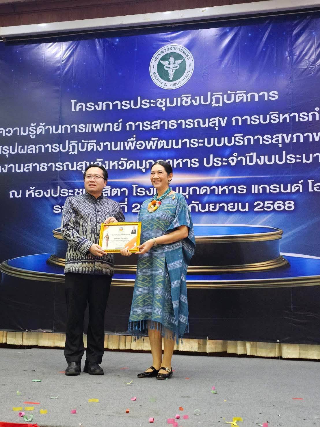 มุกดาหาร – เมื่อวันที่ 29 กันยายน 2568 นางอัญชลี กัลมาพิจิตร ประธานชมรมแม่บ้านมหาดไทยจังหวัดมุกดาหาร เข้ารับมอบรางวัลอันทรงเกียรติจาก นายแพทย์ณรงค์ จันทร์แก้ว นายแพทย์สาธารณสุขจังหวัดมุกดาหาร ณ สำนักงานสาธารณสุขจังหวัดมุกดาหาร