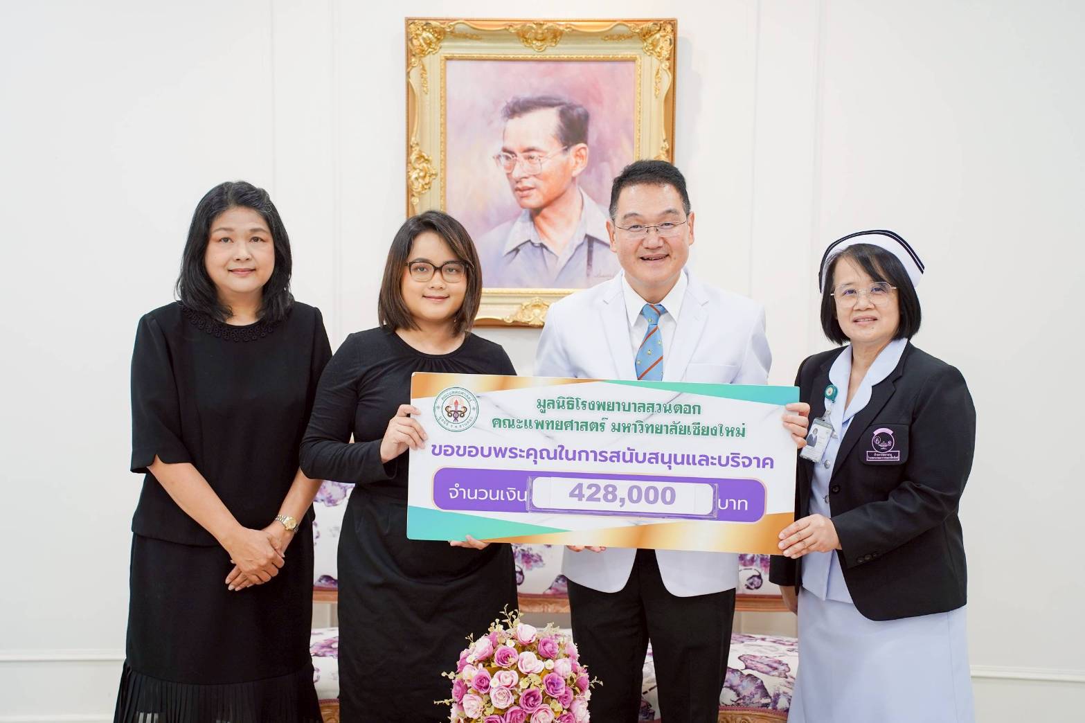 โดย สมทบทุนมูลนิธิโรงพยาบาลสวนดอก เพื่อการบริการและการศึกษา วิจัยโรคมะเร็งหน่วยมะเร็งวิทยา จำนวน 148,000 บาท, เพื่อสนับสนุนการดูแลผู้ป่วยฉุกเฉิน จำนวน 140,000 บาท, เพื่อผู้ป่วยประคับประคอง และผู้ป่วยระยะท้าย จำนวน 140,000 บาท
