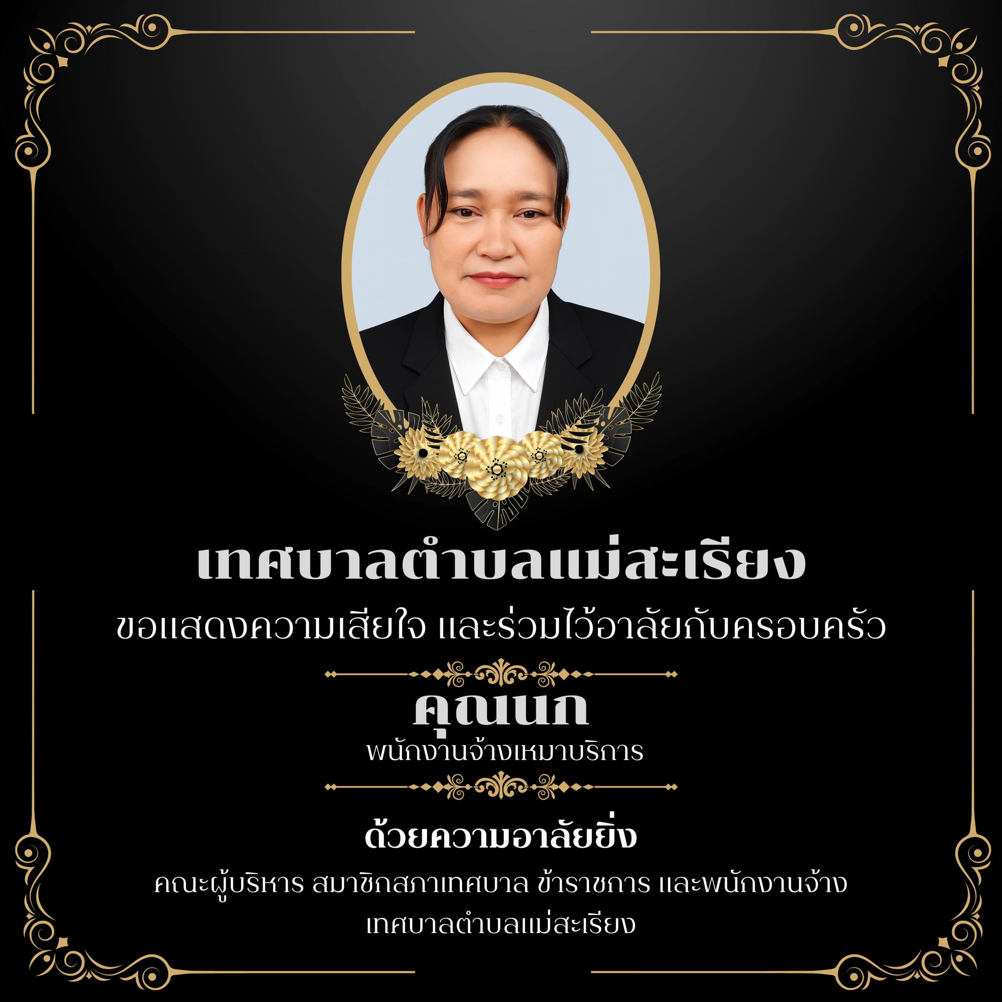 สำหรับนางนกฯ ผู้เสียชีวิตในเหตุการณ์ครั้งนี้ มีสามีชื่อ นายบุญมี ไม่มีนามสกุล มีบุตร 2คน เป็นผู้ปฏิบัติงานทำงานด้านสาธารณสุขและสิ่งแวดล้อม(พนักงานกวาดขยะ) เทศบาลตำบลแม่สะเรียงด้วยกันที่มีความตั้งใจ มุ่งมั่นทุ่มเทในการทำงานอีกทั้งยังเป็นผู้ที่มีน้ำใจ เสียสละ และเป็นที่รักของเพื่อนร่วมงานและคนรอบข้าง การจากไปในครั้งนี้นับเป็นการสูญเสียที่สร้างความโศกเศร้าแก่ครอบครัว หน่วยงาน และชุมชนเป็นอย่างยิ่ง กิ่งกาชาดอำเภอแม่สะเรียง ขอส่งกำลังใจและความห่วงใยไปยังครอบครัวผู้เสียชีวิต ได้ตั้งศพสวดอภิธรรม ที่สุสานบ้านน้ำดิบ ต.แม่ยวม อ.แม่สะเรียง จ.แม่ฮ่องสอน และฌาปนกิจในวันที่ 2 ตุลาคม 2568
