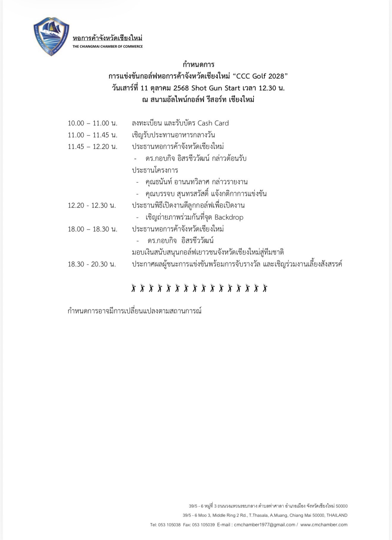 เรียนกรรมการหอการค้าฯ เชิญร่วมพิธีเปิด กิจกรรมการแข่งขันกอล์ฟ “CCC Golf 2025”