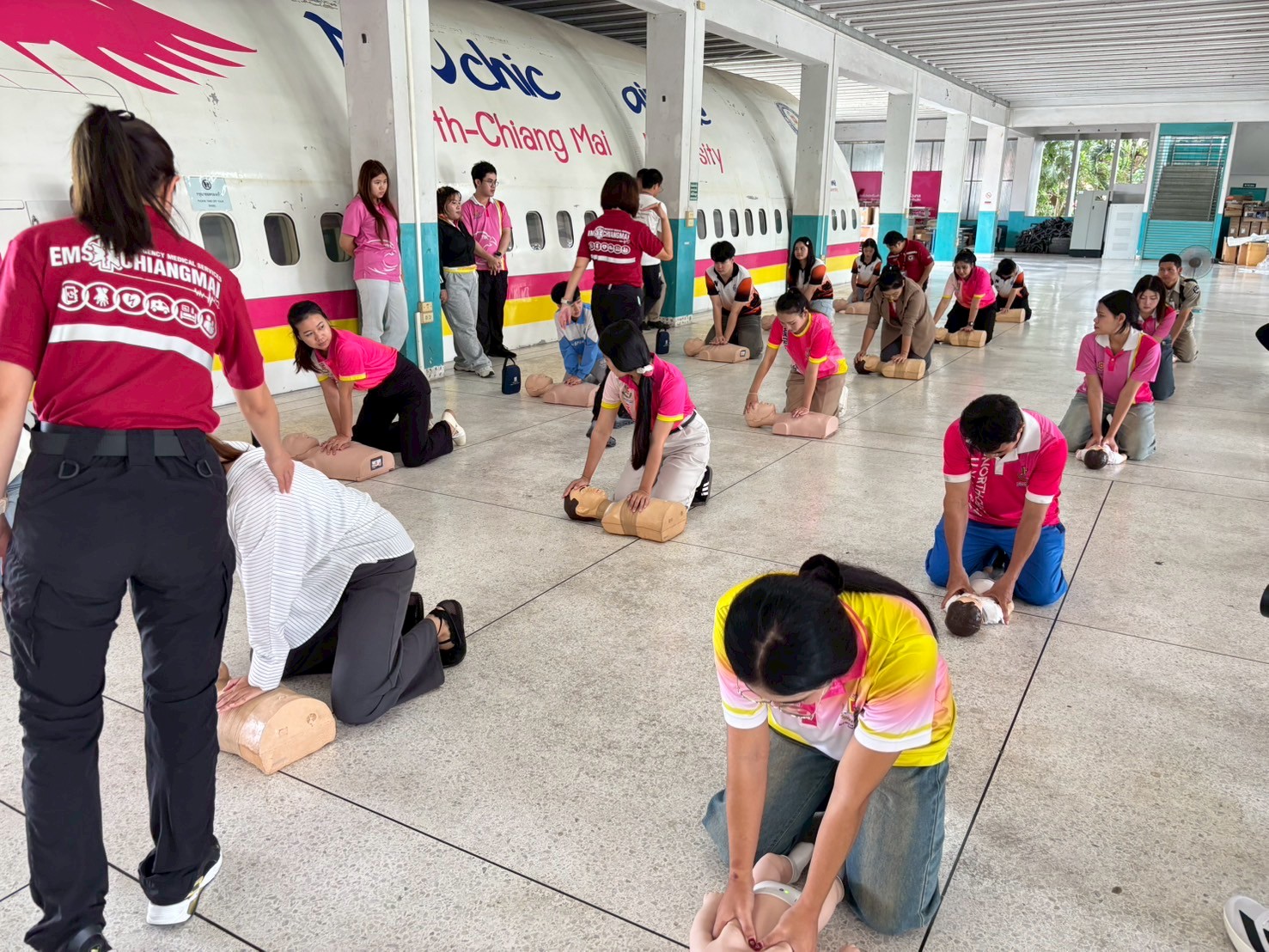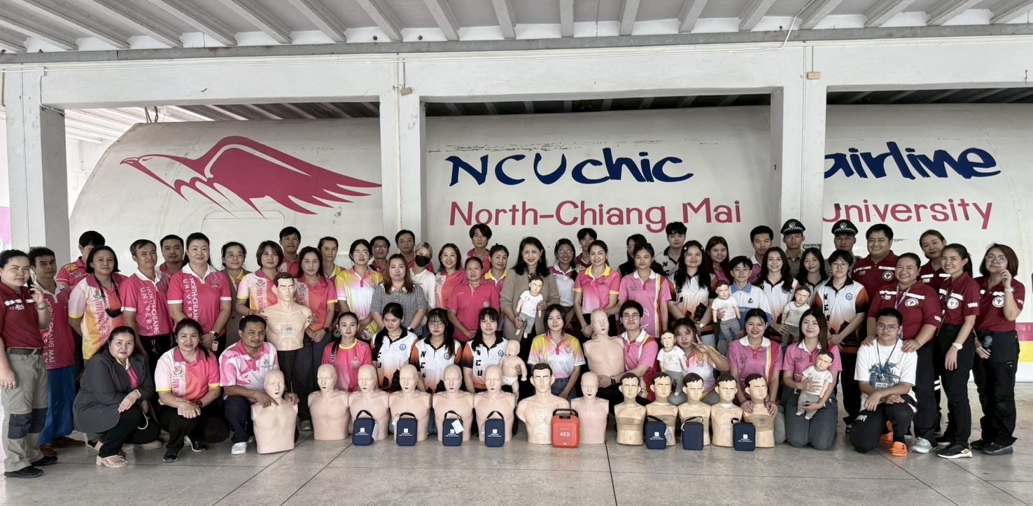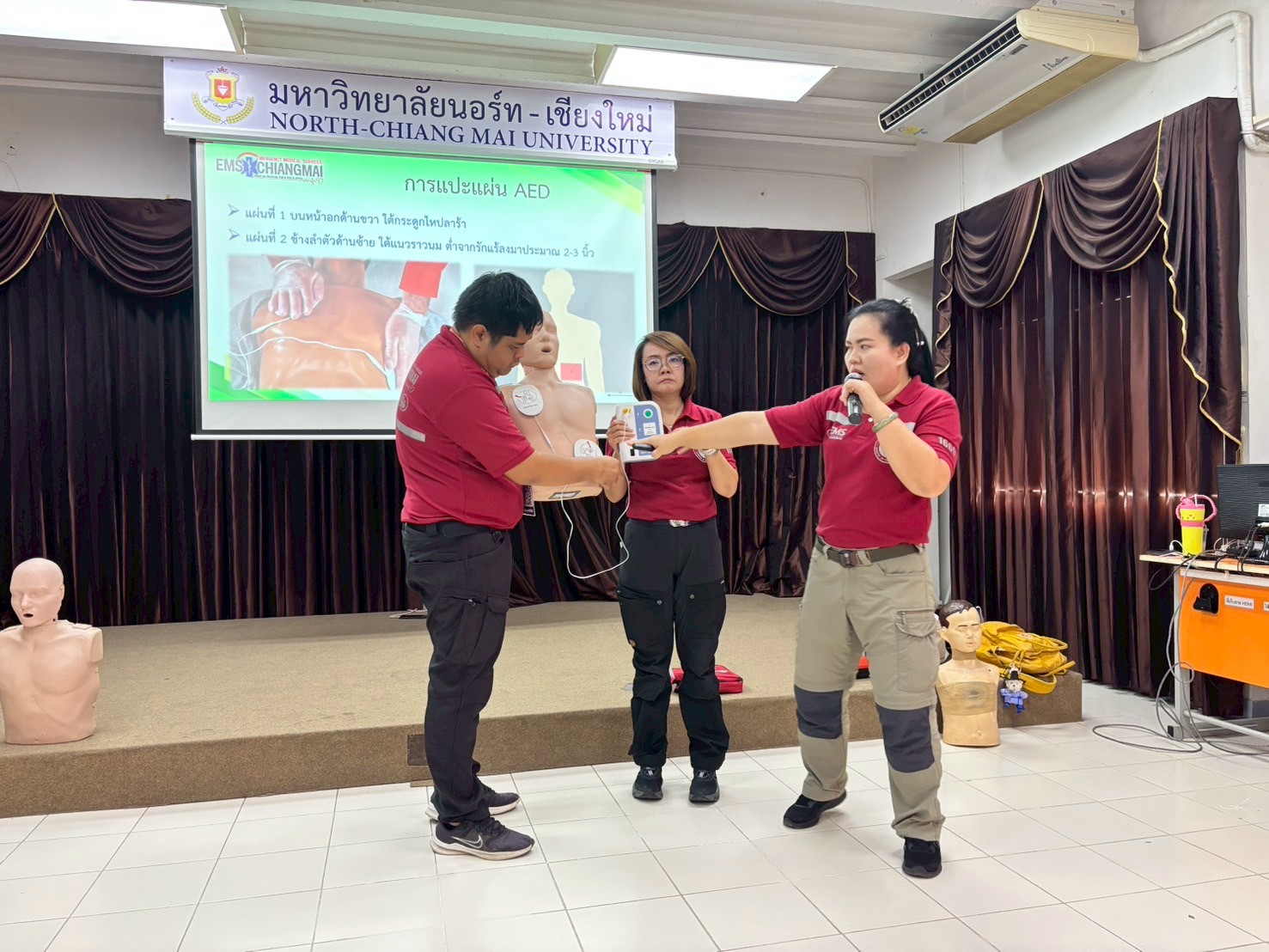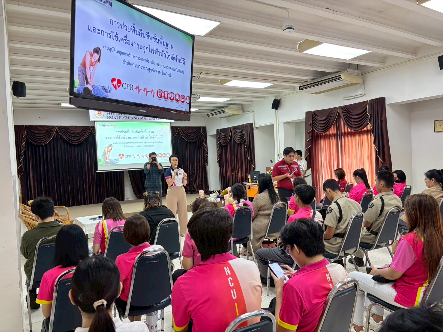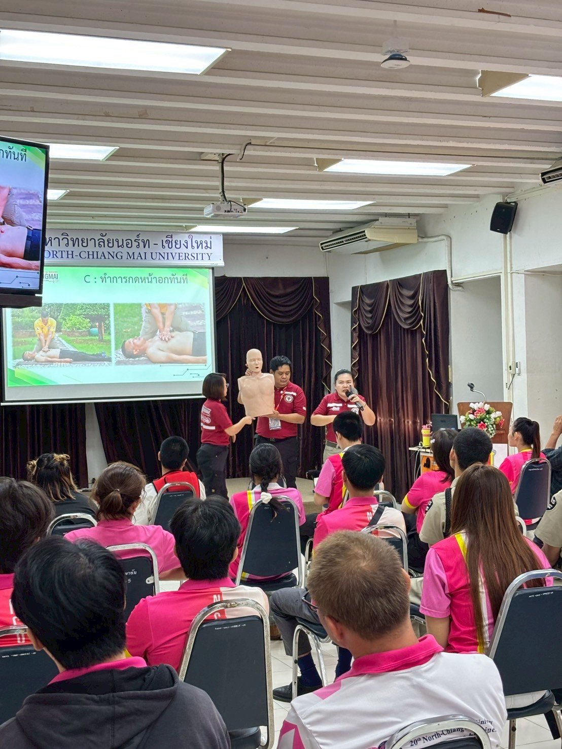 เมื่อวันที่ 30 กันยายน 2568 มหาวิทยาลัยนอร์ท-เชียงใหม่ ร่วมกับ สำนักงานสาธารณสุขจังหวัดเชียงใหม่ จัดอบรม “การปฐมพยาบาลเบื้องต้น & CPR พร้อมการใช้เครื่องกระตุกหัวใจ AED” เพื่อเสริมพลังบุคลากรและนักศึกษา ให้พร้อมรับมือกับสถานการณ์ฉุกเฉินได้อย่างมั่นใจ ทบทวนความรู้และทักษะการช่วยชีวิต การปฐมพยาบาลเบื้องต้น การปั๊มหัวใจ การใช้เครื่องกระตุกหัวใจ AED เพื่อลดความสูญเสีย และเพิ่มโอกาสให้ผู้ประสบเหตุได้กลับมามีลมหายใจอีกครั้ง การอบรมจัดขึ้น ณ ห้องรัฐมนตรี และลานกิจกรรม อาคาร 3 มหาวิทยาลัยนอร์ท-เชียงใหม่