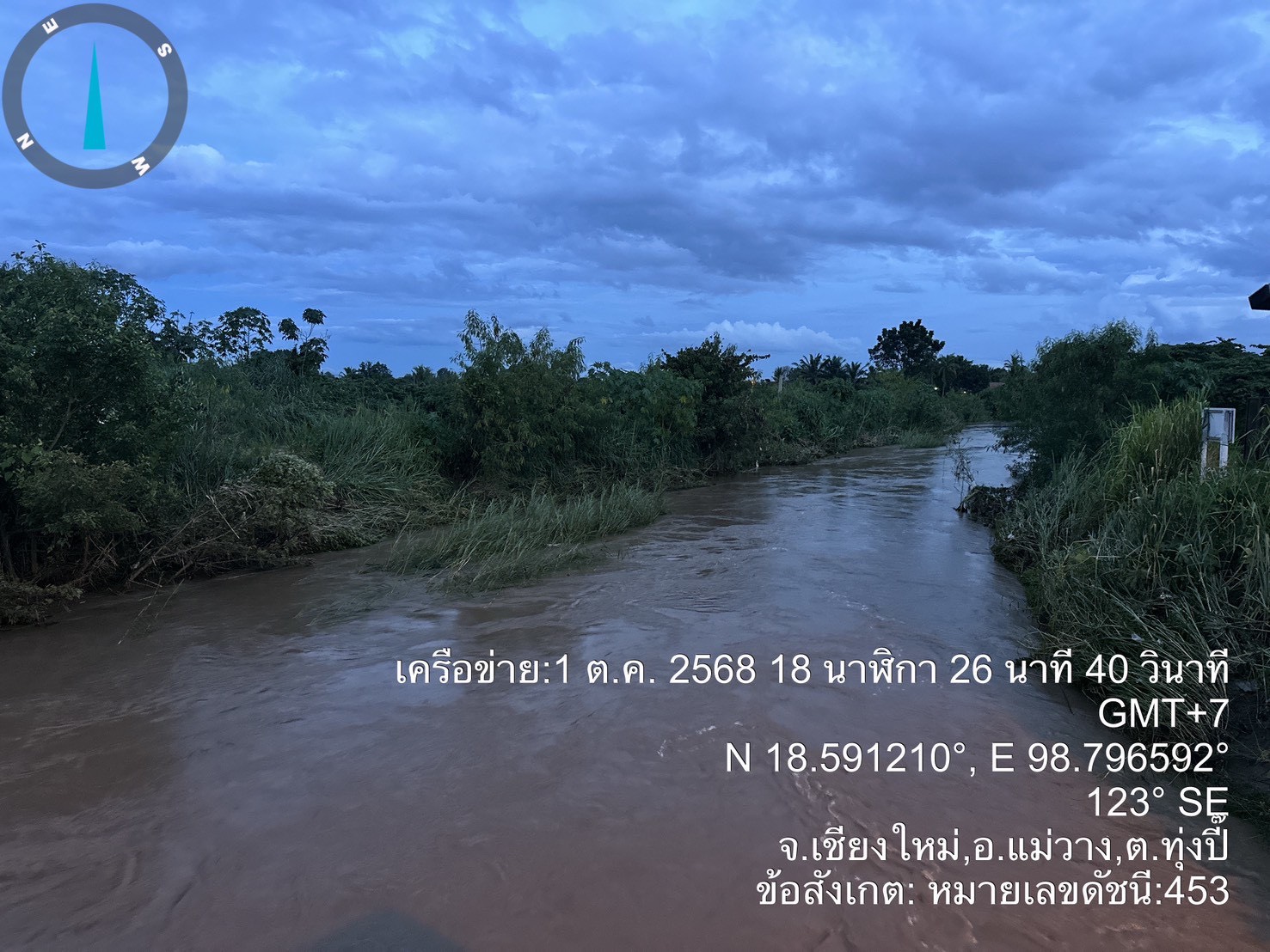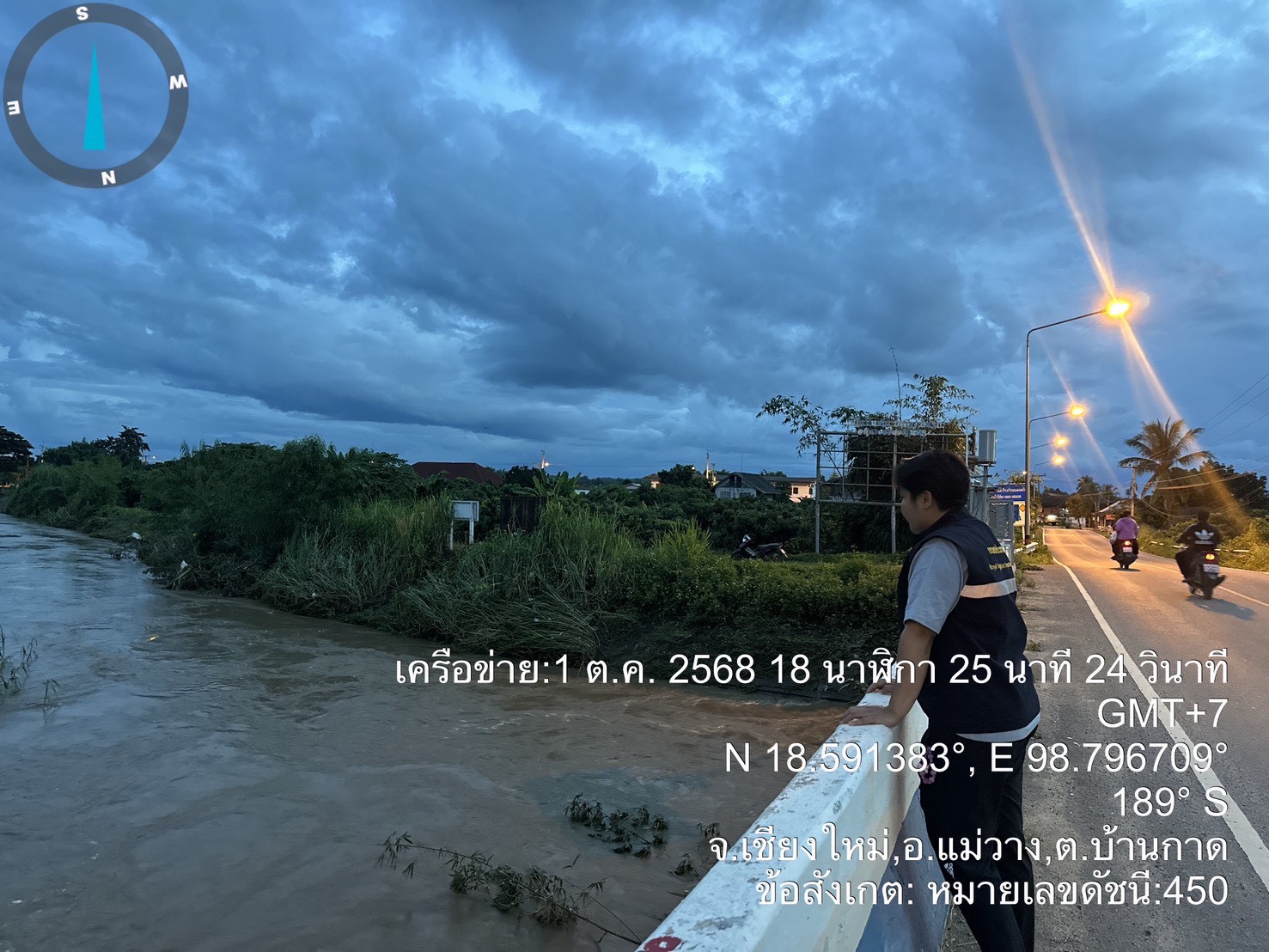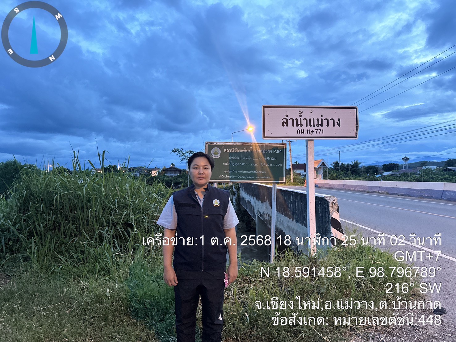 วันที่ 1 ต.ค. 68 นางสาวชลมาศ ทองคำ หัวหน้าฝ่ายส่งน้ำและบำรุงรักษาที่ 6 โครงการชลประทานเชียงใหม่ ลงพื้นที่ติดตามสถานการณ์น้ำแม่แจ่ม น้ำแม่ขาน น้ำแม่วาง ที่มีมวลน้ำล้นตลิ่งเข้าท่วมพื้นที่ลุ่มต่ำ พร้อมสนับสนุนในการประสานฝ่ายส่งน้ำฯที่ 7 ลดระดับน้ำปิงหน้าฝายดอยน้อย เพื่อให้น้ำแม่ขานไหลลงสู่น้ำปิงได้ดีขึ้น บรรเทาผลกระทบของน้ำเอ่อล้นตลิ่ง ซึ่งขณะนี้น้ำแม่วาง สถานีวัดน้ำ P.84 บ้านพันตน ต.ทุ่งปี้ อ.แม่วาง เชียงใหม่อ่านค่าระดับได้ 3.39 ม. (ระดับน้ำ สูงสุด 4.00 เมตร) ระดับน้ำมีแนวโน้มลดลง หากไม่มีมวลน้ำเพิ่มเติมคาดว่าจะเข้าสู่ภาวะปกติภายใน 1 – 2 วัน ส่วนสถานี P.71A น้ำแม่ขาน ต.บ้านกลาง อ.สันป่าตอง จ.เชียงใหม่ ระดับน้ำ 5.58 ม. มีแนวโน้มเพิ่มขึ้น เอ่อล้นตลิ่งและถนนเข้าท่วมพื้นที่ลุ่มต่ำตามแนวลำน้ำ