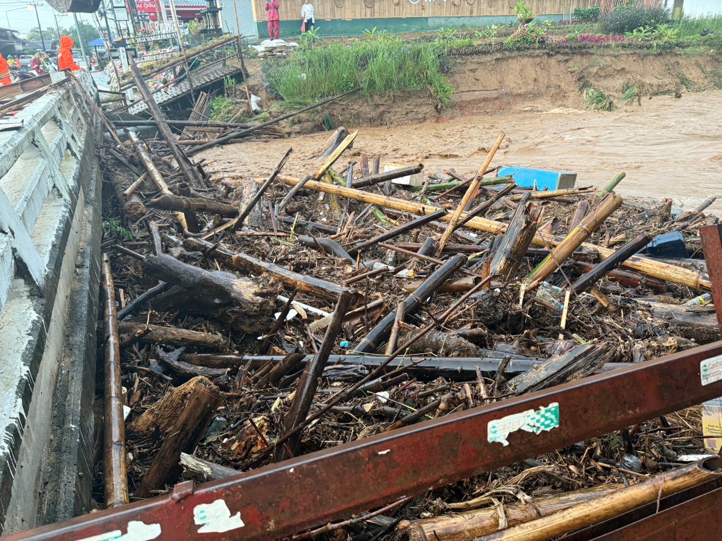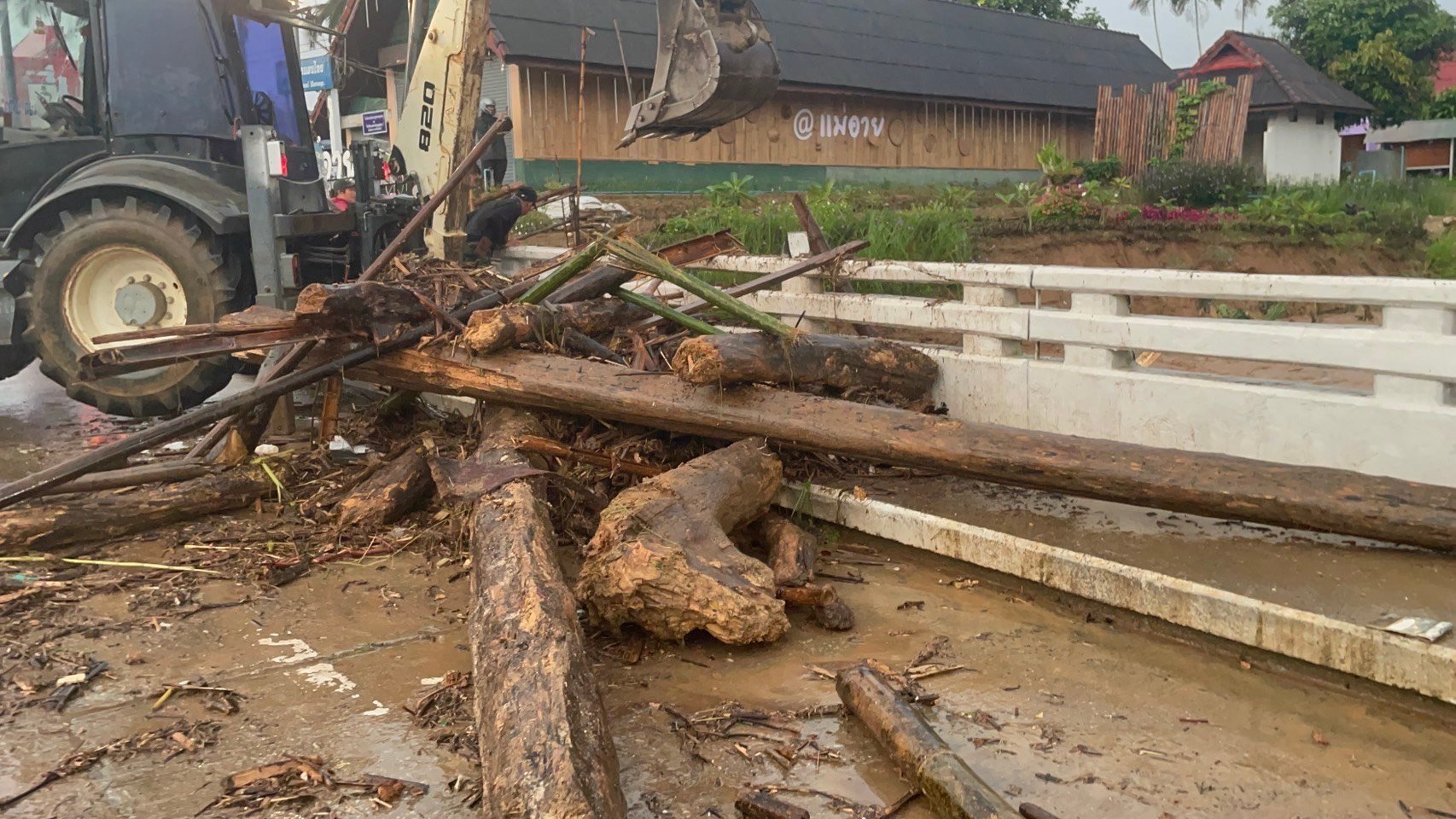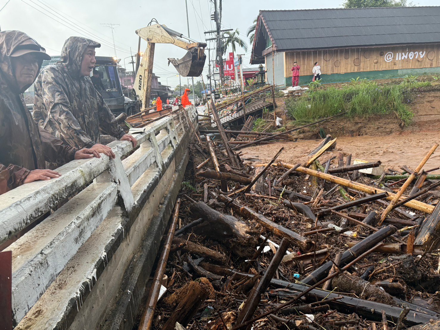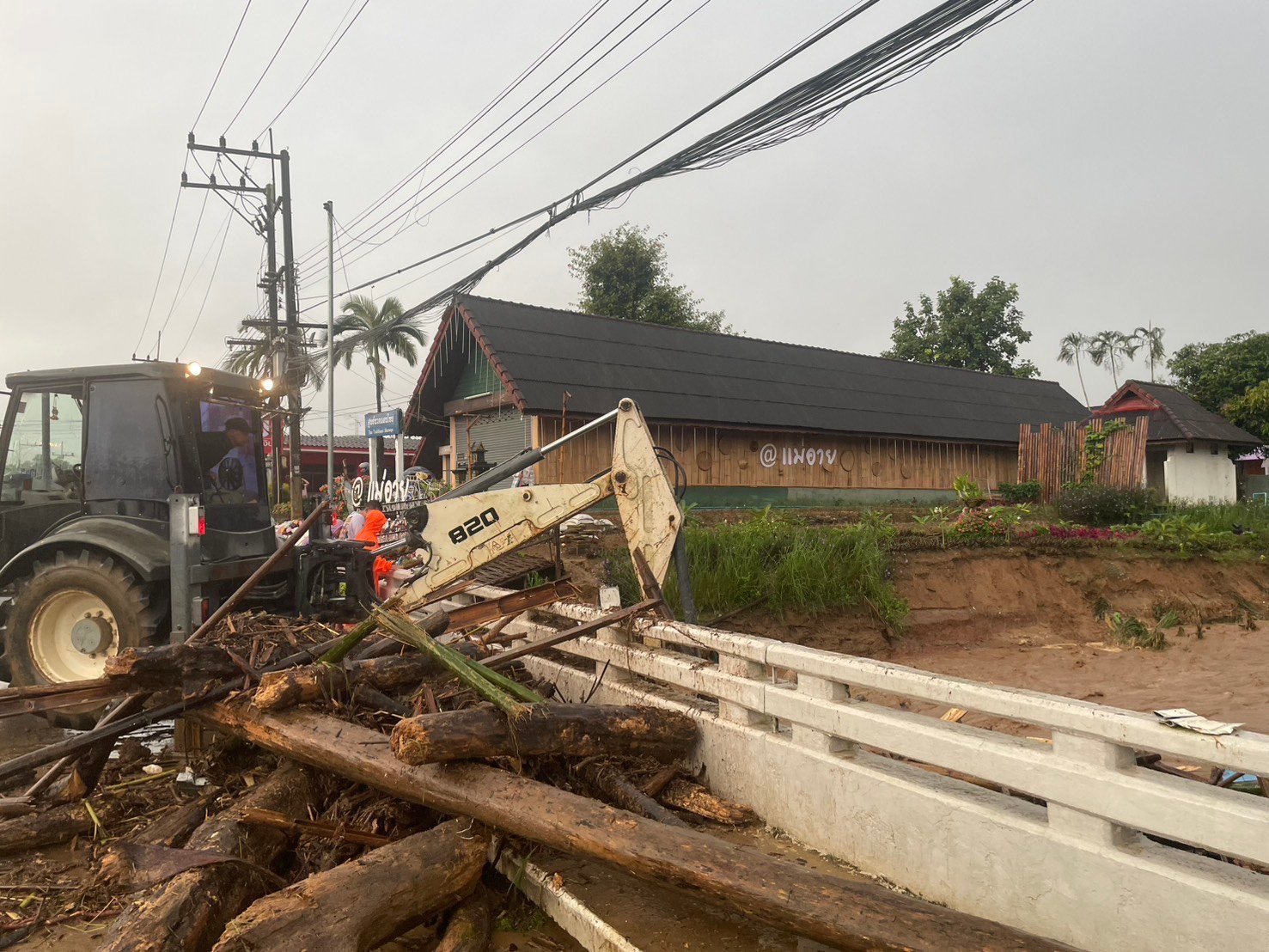 ฝนหนัก น้ำหลากท่วม อ.แม่อาย 3 ตำบล ได้รับผลกระทบ เศษไม้ไหลมากับน้ำอย่างเยอะ ติดค้างสะพานแม่อาย ทต.แม่อาย เร่งกำจัดเศษไม้ที่อุดตันออกเพื่อเปิดทางน้ำไหลผ่านสะดวก