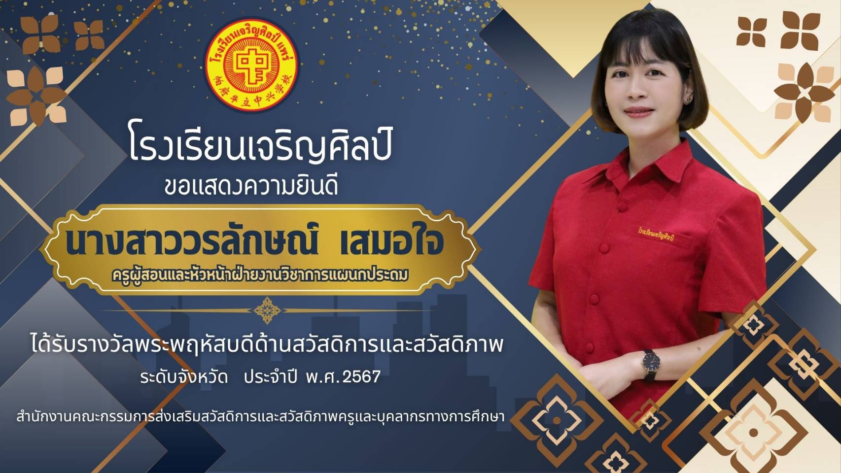 นายเอกชัย วงศ์วีกุล ประธานมูลนิํเพื่อการศึดษาโรงเรียนเจริญศิลป์ อ.เมือง จ.แพร่และคณะครูขอแสดงความภาคภูมิใจและความยินดีอย่างยิ่งกับ นางสาววรลักษณ์ เสมอใจ ครูผู้สอนและหัวหน้าฝ่ายงานวิชาการของโรงเรียนที่ได้รับ รางวัลพระพฤหัสบดีด้านสวัสดิการและสวัสดิภาพ ระดับจังหวัด ประจำปี พ.ศ. 2567