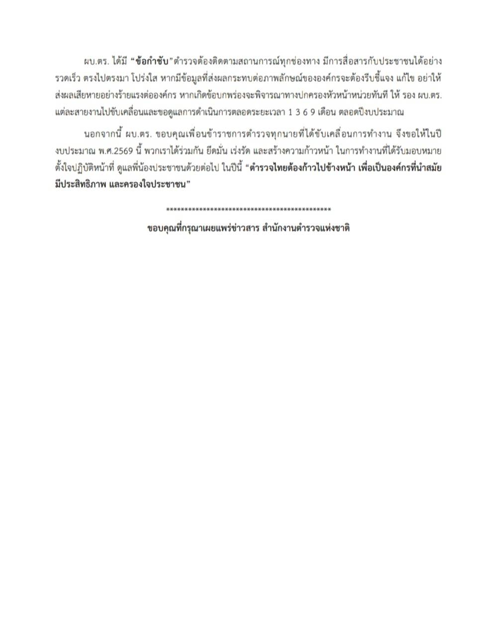 นอกจากนี้ ผบ.ตร. ขอบคุณเพื่อนข้าราชการตำรวจทุกนายที่ได้ขับเคลื่อนการทำงาน จึงขอให้ในปีงบประมาณ พ.ศ.2569 นี้ พวกเราได้ร่วมกัน ยึดมั่น เร่งรัด และสร้างความก้าวหน้า ในการทำงานที่ได้รับมอบหมาย ตั้งใจปฏิบัติหน้าที่ ดูแลพี่น้องประชาชนด้วยต่อไป ในปีนี้ “ตำรวจไทยต้องก้าวไปข้างหน้า เพื่อเป็นองค์กรที่นำสมัย มีประสิทธิภาพ และครองใจประชาชน”