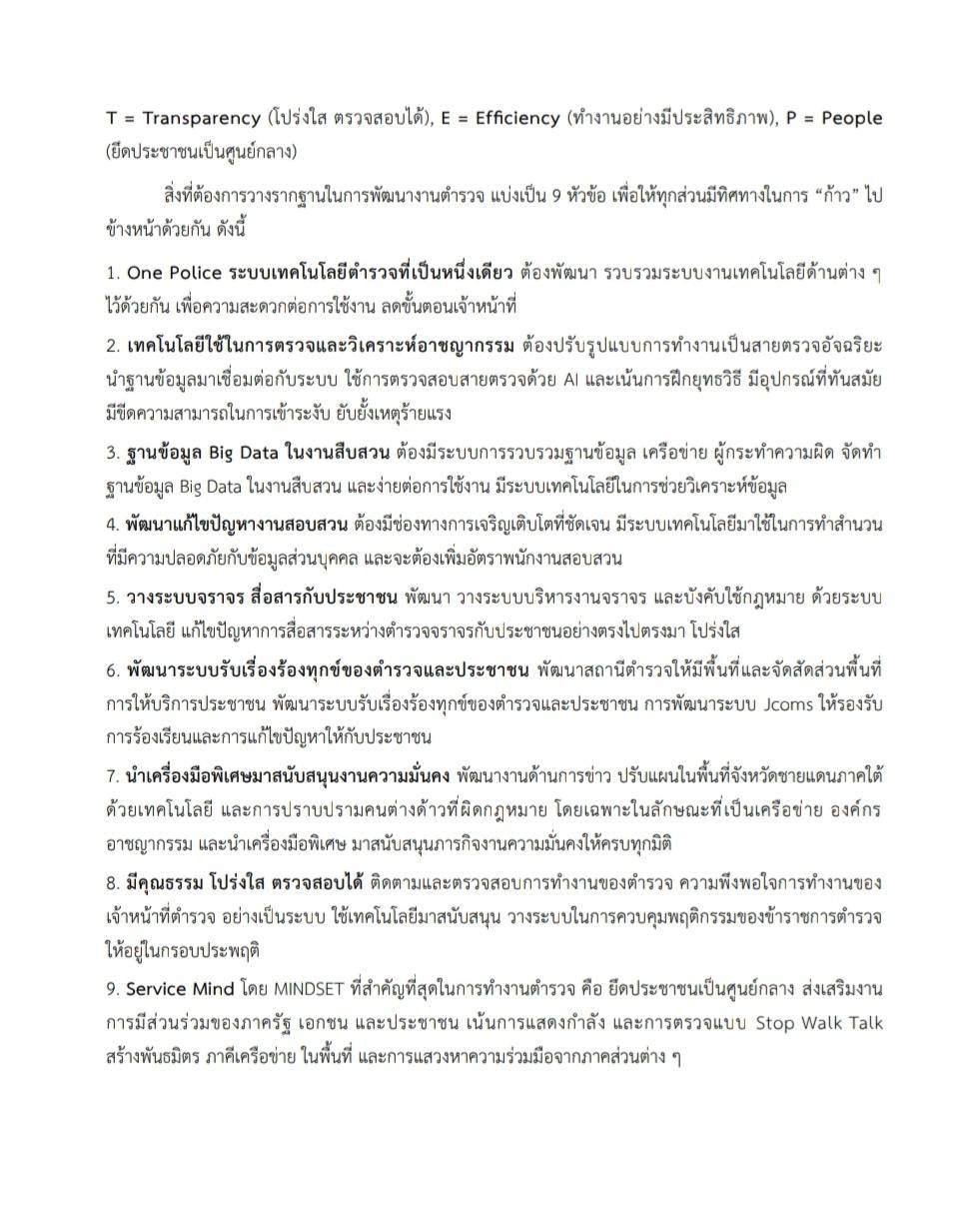 - เทคโนโลยีใช้ในการตรวจและวิเคราะห์อาชญากรรม ต้องปรับรูปแบบการทำงานเป็นสายตรวจอัจฉริยะ นำฐานข้อมูลมาเชื่อมต่อกับระบบ ใช้การตรวจสอบสายตรวจด้วย AI และเน้นการฝึกยุทธวิธี มีอุปกรณ์ที่ทันสมัย มีขีดความสามารถในการเข้าระงับ ยับยั้งเหตุร้ายแรง