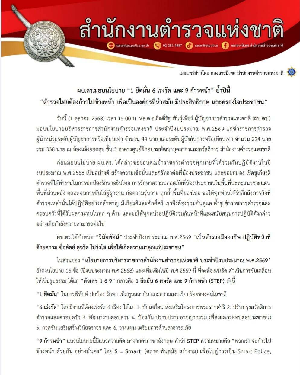 ในส่วนของนโยบายการบริหารราชการสำนักงานตำรวจแห่งชาติ ประจำปีงบประมาณ พ.ศ.2569 ยังคงนโยบาย 15 ข้อ (ปีงบประมาณ พ.ศ.2568) และเพิ่มเติมในปี พ.ศ.2569 นี้ ที่จะต้องเร่งรัด ดำเนินการขับเคลื่อนให้เป็นรูปธรรม ได้แก่ “ตัวเลข 1 6 9” กล่าวคือ 1 ยึดมั่น 6 เร่งรัด และ 9 ก้าวหน้า (STEP) ดังนี้