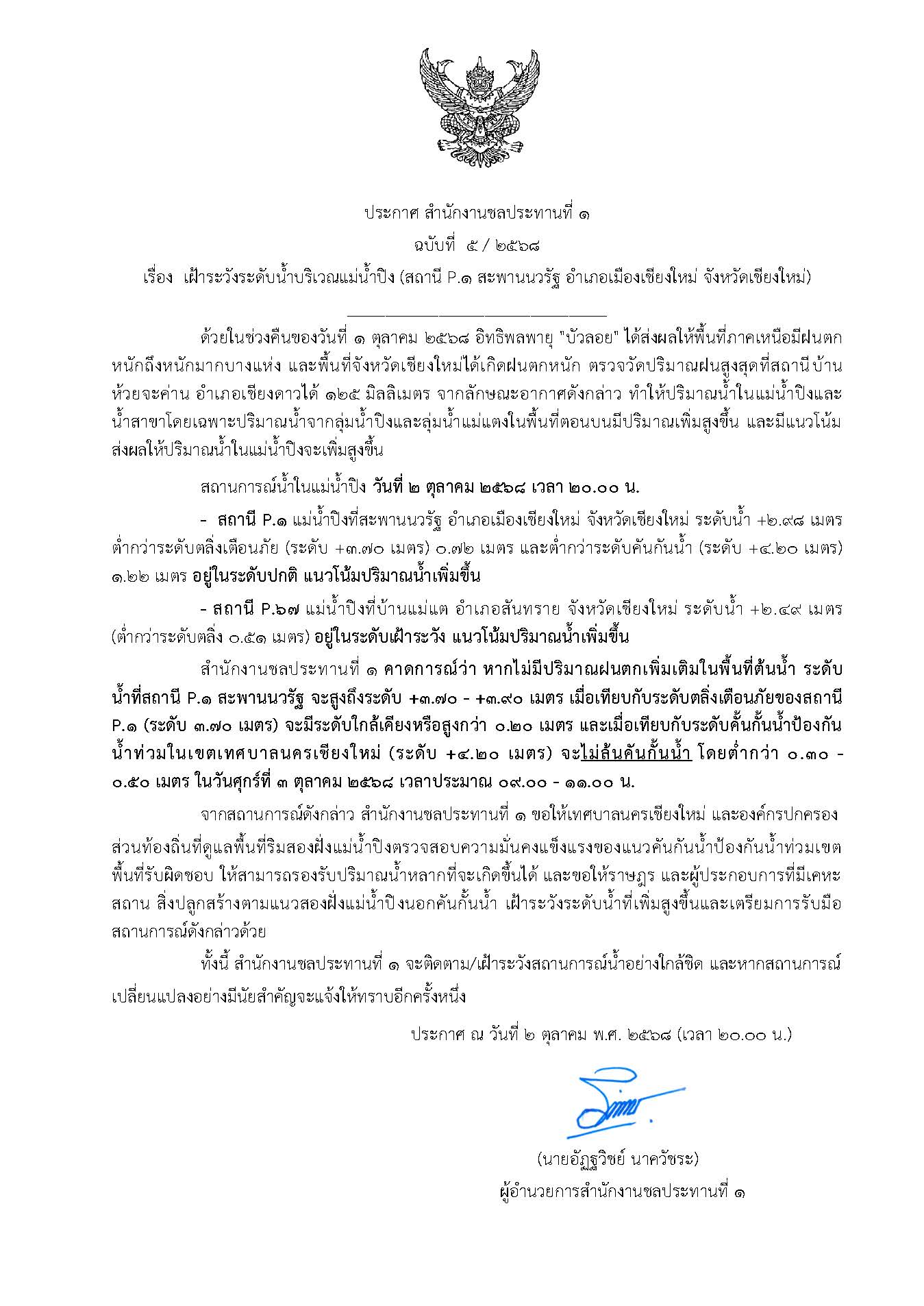 ฉบับที่ 5 / 2568 เรื่อง เฝ้าระวังระดับน้ำบริเวณแม่น้ำปิ้ง (สถานี P.1 สะพานนวรัฐ อำเภอเมืองเชียงใหม่ จังหวัดเชียงใหม่)