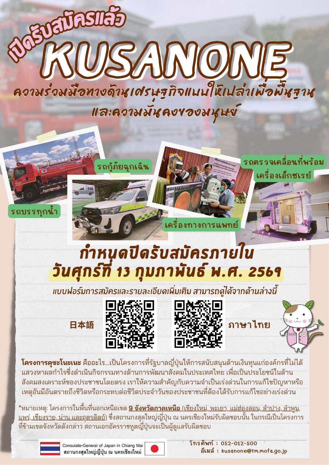 รัฐบาลญี่ปุ่น โดยสถานกงสุลใหญ่ญี่ปุ่น ณ นครเชียงใหม่ ประกาศเปิดรับสมัครข้อเสนอโครงการภายใต้ “โครงการความร่วมมือทางด้านเศรษฐกิจแบบให้เปล่าเพื่อพื้นฐานและความมั่นคงของมนุษย์” หรือ “โครงการคุซะโนะเนะ” (Grant Assistance for Grassroots Human Security Projects: KUSANONE) ประจำปีงบประมาณ (ญี่ปุ่น) พ.ศ. 2569 เพื่อส่งเสริมการพัฒนาในระดับชุมชนและยกระดับคุณภาพชีวิตของประชาชนในพื้นที่ภาคเหนือ โดยมี กำหนดปิดรับสมัครในวันศุกร์ที่ 13 กุมภาพันธ์ พ.ศ. 2569