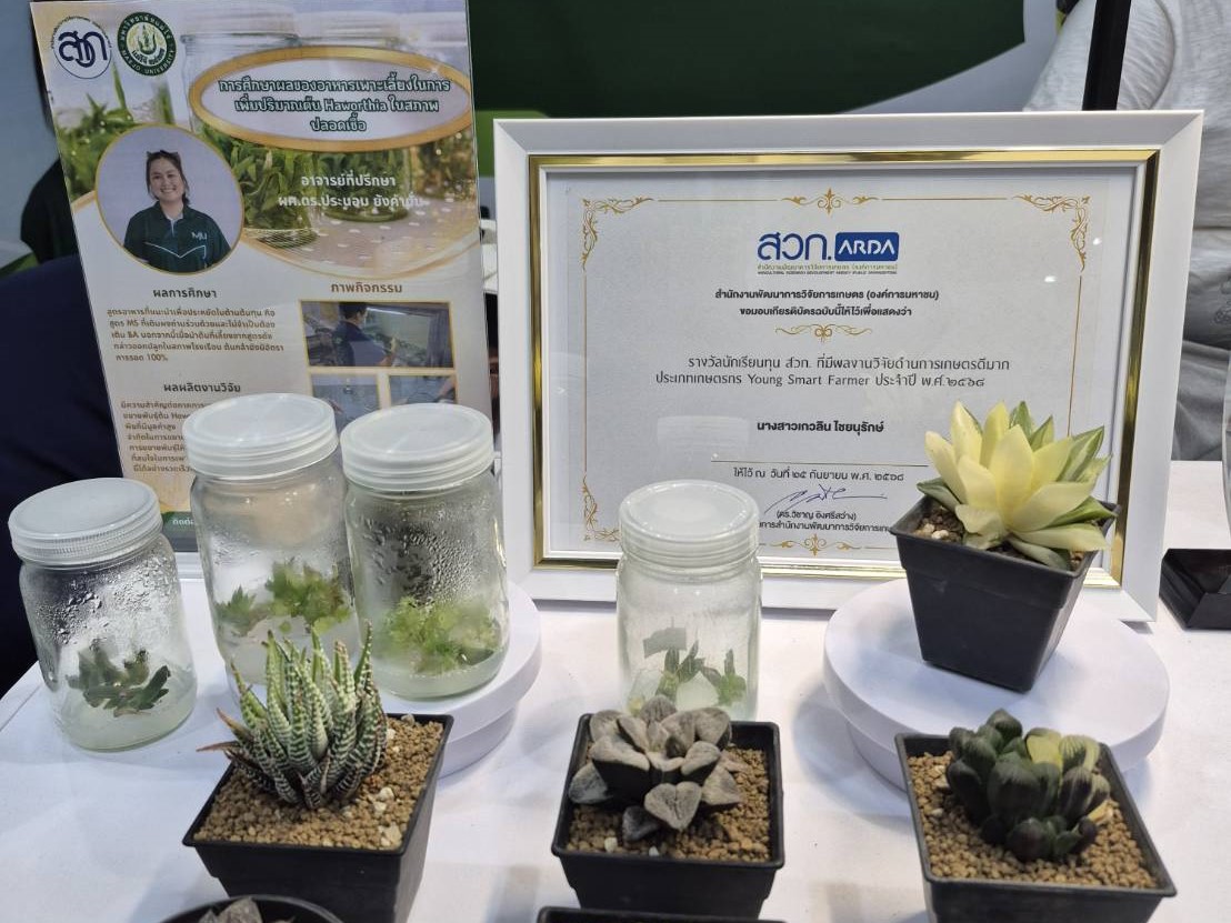 นางสาวเกวลิน ไชยนุรักษ์ รางวัล นักเรียนทุนสวก.ที่มี ผลงานวิจัยด้านการเกษตรดีมาก ประเภท Young Smart Farmer จากผลงาน “การศึกษาผลของอาหารเพาะเลี้ยงในการ เพิ่มปริมาณต้น Haworthia ในสภาพปลอดเชื้อ” โดยมี ผู้ช่วยศาสตราจารย์ ดร.ประนอม ยังคำมั่น คณะผลิตกรรมการเกษตร เป็นอาจารย์ที่ปรึกษางานวิจัย