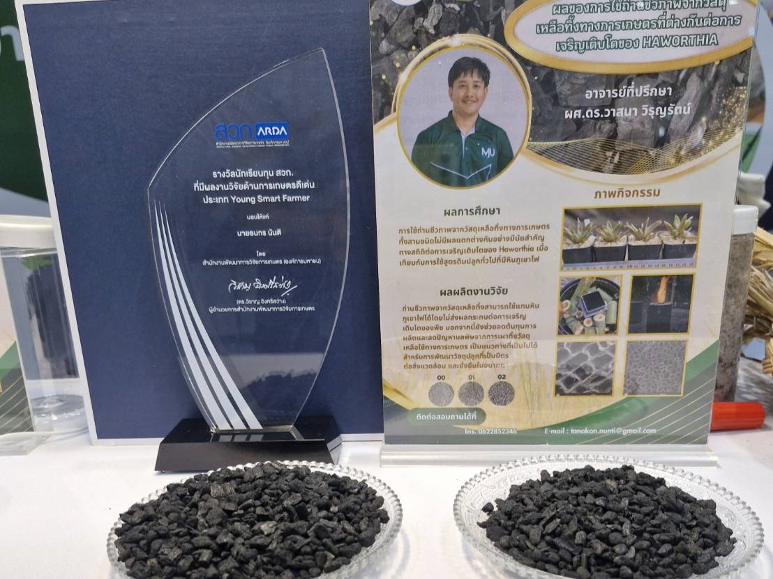 นายธนกร นันติ ได้รับรางวัลนักเรียนทุน สวก. ที่มี ผลงานวิจัยด้านการเกษตรดีเด่น ประเภท Young Smart Farmer จากผลงาน “ผลของการใช้ถ่านชีวภาพจากเศษวัสดุเหลือทิ้งทางการเกษตรที่แตกต่างกันต่อการ เจริญเติบโตของ HAWORTHIA” โดยมี ผู้ช่วยศาสตราจารย์ ดร.วาสนา วิรุญรัตน์ คณะผลิตกรรมการเกษตร เป็นอาจารย์ที่ปรึกษางานวิจัย