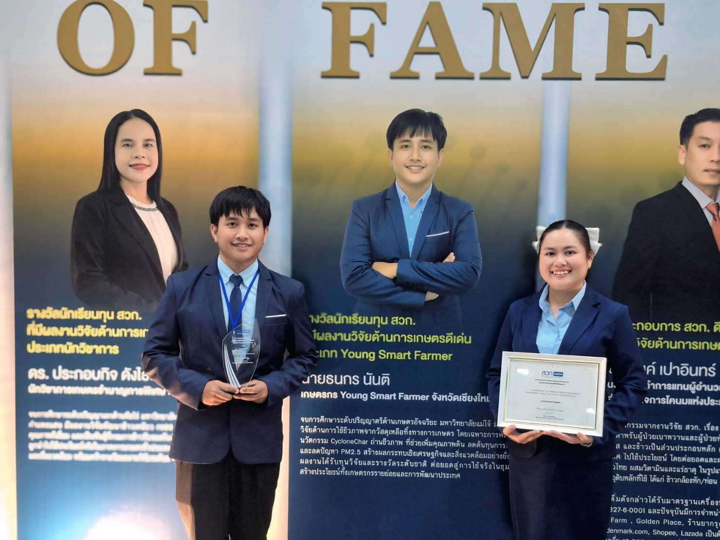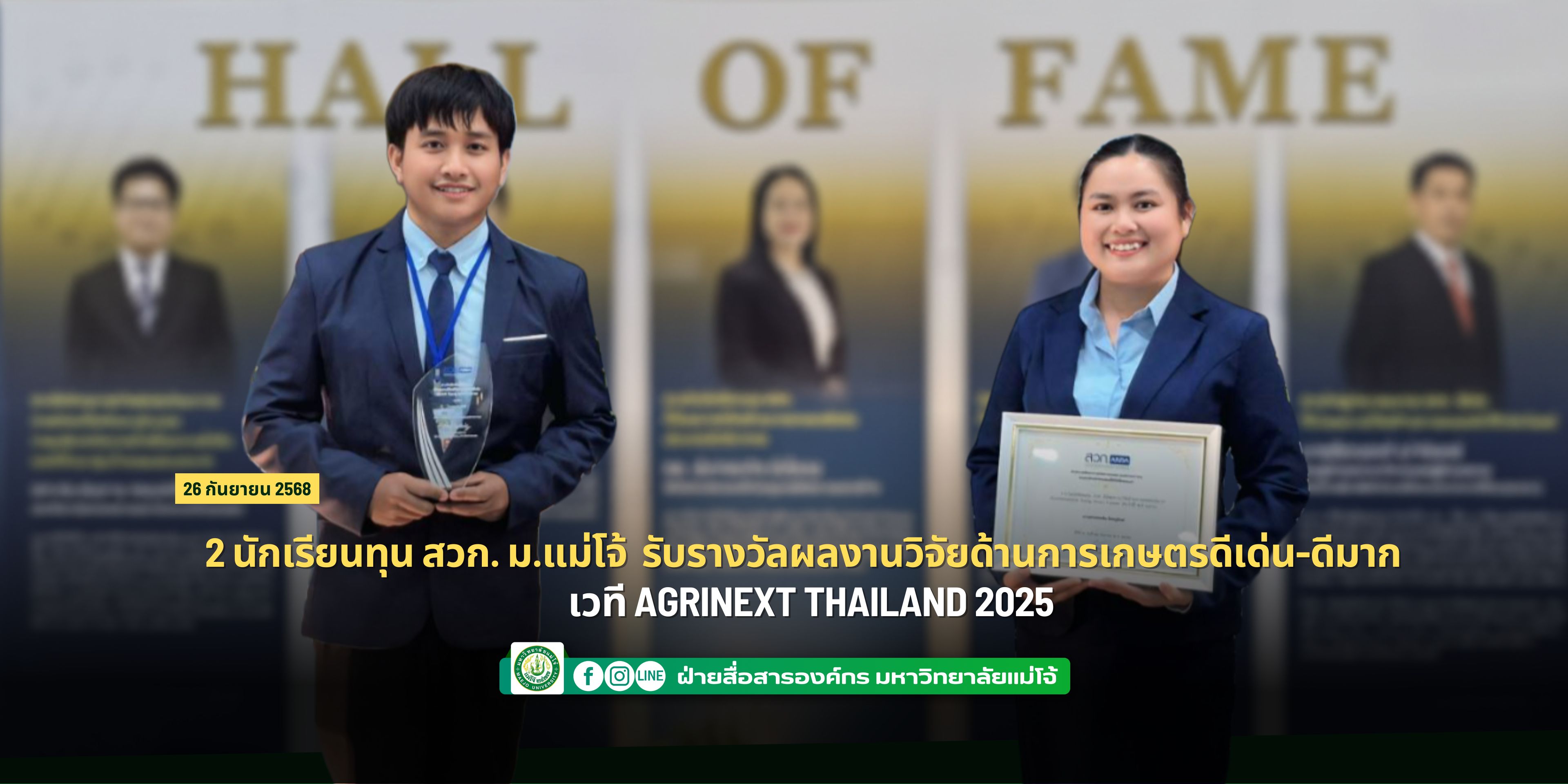 2 นักศึกษา สาขาวิชาเกษตรอัจฉริยะ คณะสัตวศาสตร์และเทคโนโลยี มหาวิทยาลัยแม่โจ้ ภายใต้การสนับสนุนของสำนักงานพัฒนาการวิจัยการเกษตร (สวก.) ได้รับรางวัลนักเรียนทุน_สวก. ที่มีผลงานวิจัยด้านการเกษตรดีเด่น และ ดีมาก ในงานประชุมวิชาการและจัดแสดงผลงานวิจัย นวัตกรรมเกษตรอัจฉริยะผลิกโฉมการเกษตรไทยสู่ความยั่งยืนและการแข่งขันในเวทีโลก AGRINEXT THAILAND 2025 และงาน FARM EXPO 2025 ระหว่างวันที่ 25 – 28 กันยายน 2568 ณ อิมแพค เอ็กซิบิชั่น ฮอลล์ 4 เมืองทองธานี จังหวัดนนทบุรี