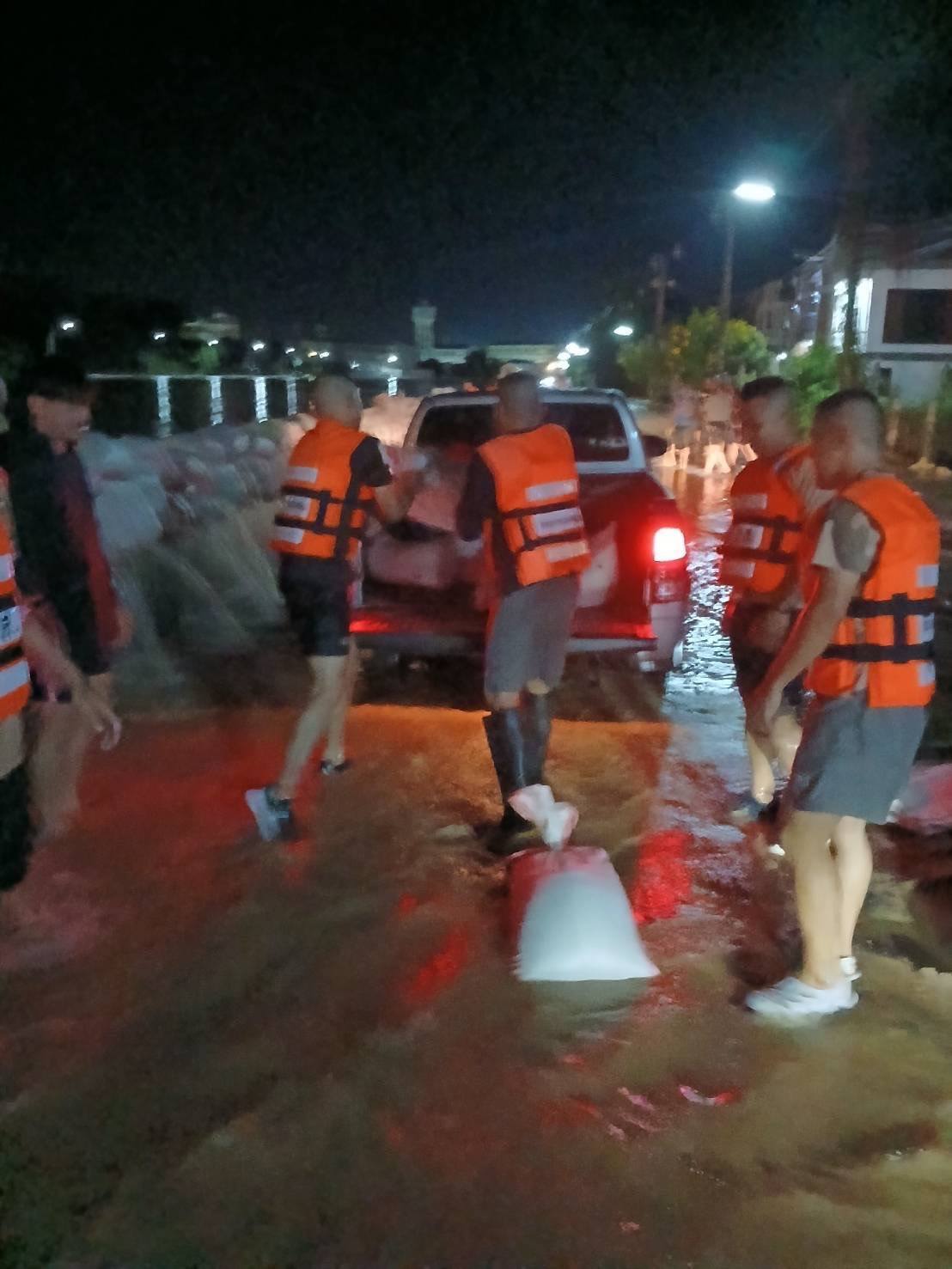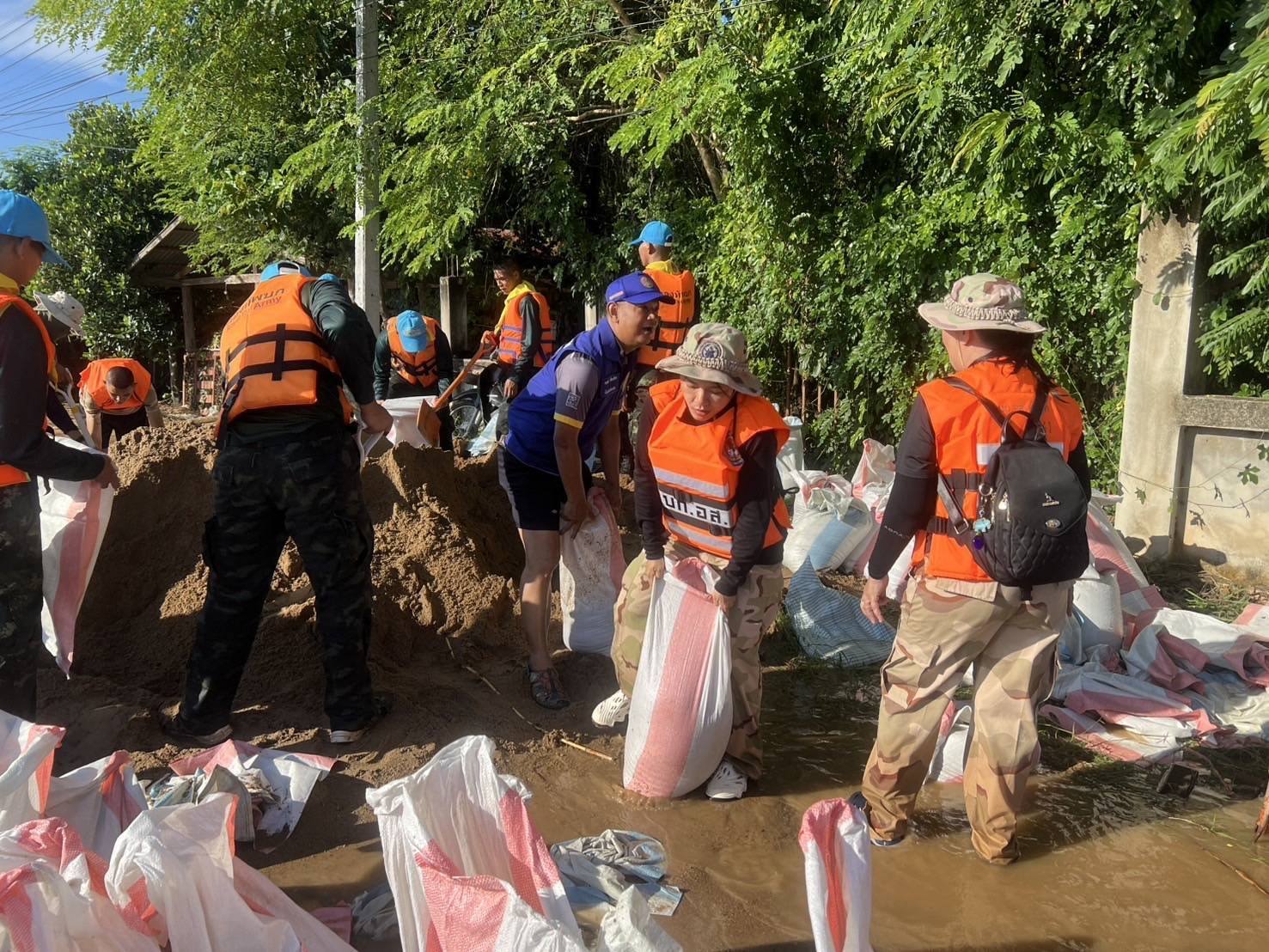 กองบัญชาการช่วยรบที่ 3 ระดมกำลังพลจิตอาสาจากหน่วยขึ้นตรง พร้อม กองอำนวยการรักษาความมั่นคงภายในจังหวัดสุโขทัย เร่งวางกระสอบทรายอุดรอยรั่วพนังกั้นน้ำแตกในเมืองสุโขทัย พร้อมช่วยเหลือพื้นที่ประสบอุทกภัยเมืองสุโขทัย