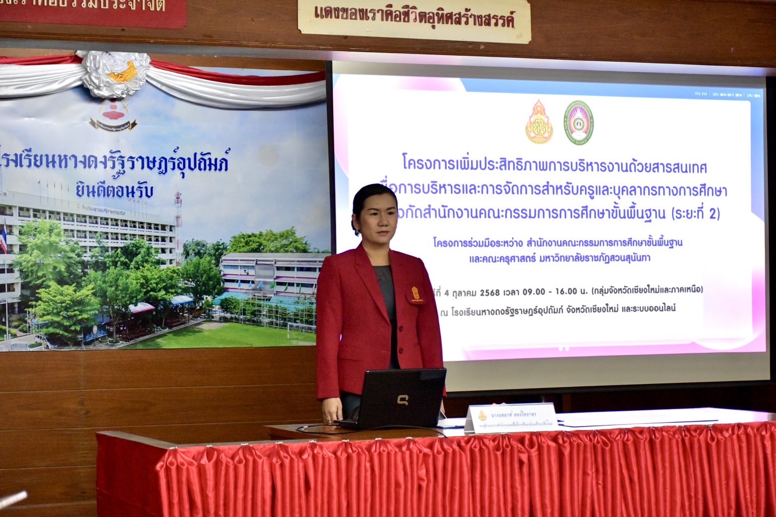 วันที่ 4 ตุลาคม พ.ศ. 2568 มหาวิทยาลัยราชภัฏสวนสุนันทา ร่วมกับโรงเรียนหางดงรัฐราษฎร์อุปถัมภ์ จัดการอบรมเชิงปฏิบัติการเพิ่มประสิทธิภาพการบริหารงานด้วยสารสนเทศ เพื่อการบริหารและการจัดการสำหรับครูและบุคลากรทางการศึกษา สังกัดสำนักงานคณะกรรมการการศึกษาขั้นพื้นฐาน (ระยะที่ 2) โดยนายเทอดเกียรติ ยามโสภา  ผู้อำนวยการสำนักงานเขตพื้นที่การศึกษามัธยมศึกษาเชียงใหม่ มอบหมายให้ นางนพมาศ ทองวิทยาพร รองผู้อำนวยการสำนักงานเขตพื้นที่การศึกษามัธยมศึกษาเชียงใหม่ เป็นประธานในพิธีเปิดการอบรม และ รองศาสตราจารย์ ดร. ทับทิมทอง อาจารย์สาขาวิชาเทคโนโลยีทางการศึกษา คณะครุศาสตร์ มหาวิทยาลัยราชภัฏสวนสุนันทา กล่าวรายงานวัตถุประสงค์ของโครงการฯ พร้อมด้วยนางฐิติพร ไขแสง ศึกษานิเทศก์ชำนาญการพิเศษ สพม.เชียงใหม่ คณะวิทยากรจากคณะครุศาสตร์ มหาวิทยาลัยราชภัฏสวนสุนันทา รองผู้อำนวยการโรงเรียนและคณะครูโรงเรียนหางดงรัฐราษฎร์อุปถัมภ์ เข้าร่วมพิธีเปิด ณ ห้องโสตทัศนศึกษา 1 โรงเรียนหางดงรัฐราษฎร์อุปถัมภ์