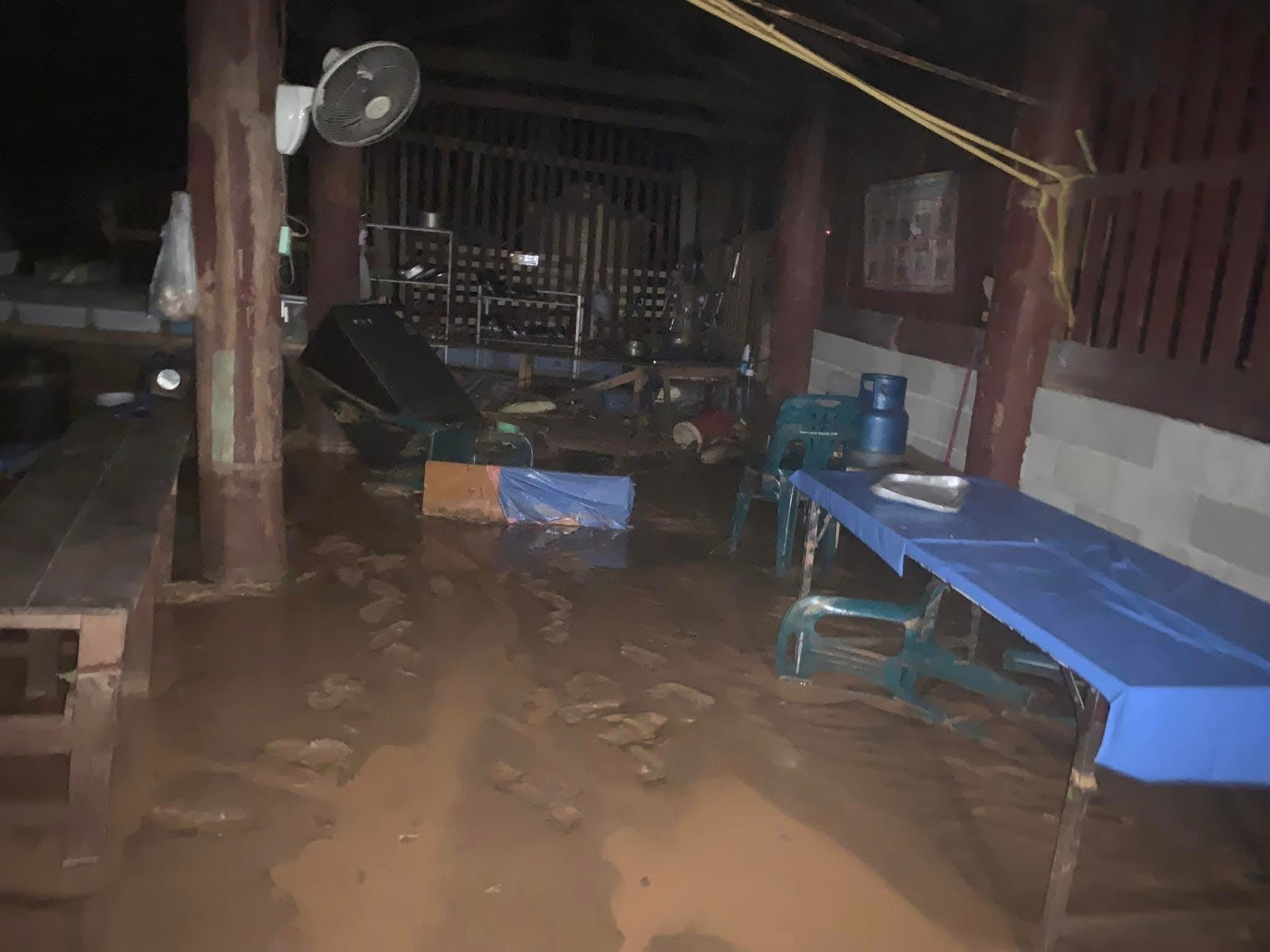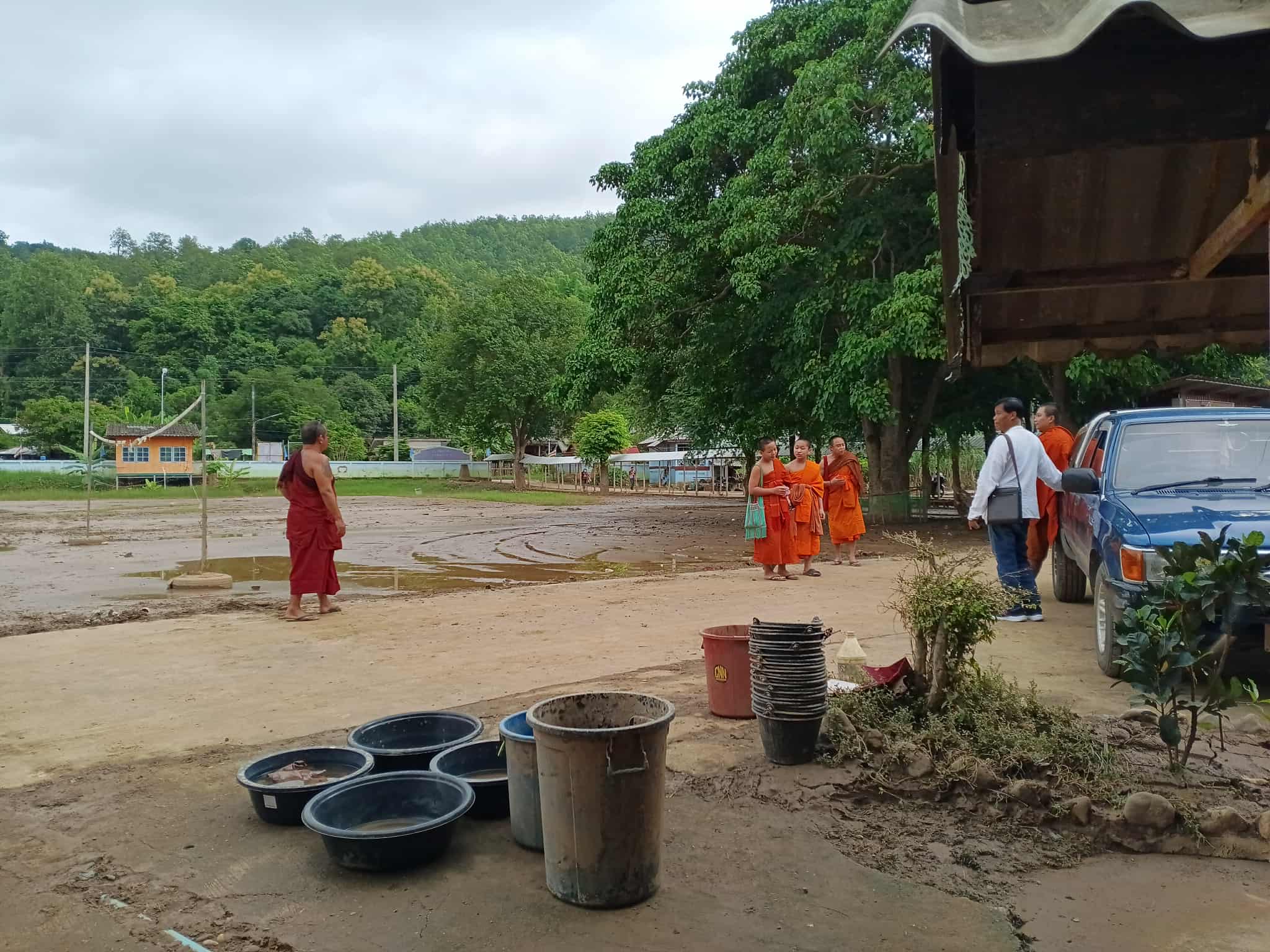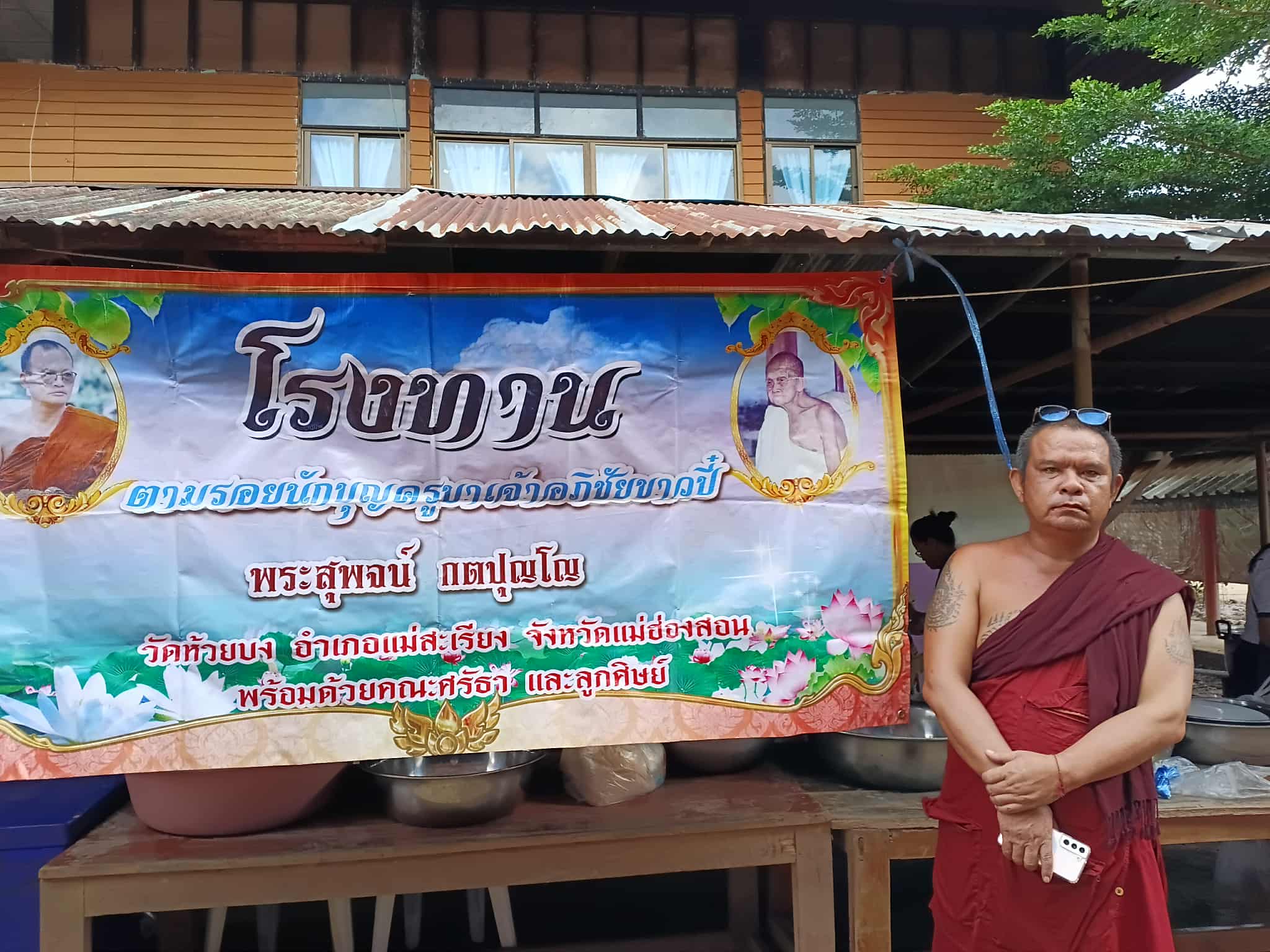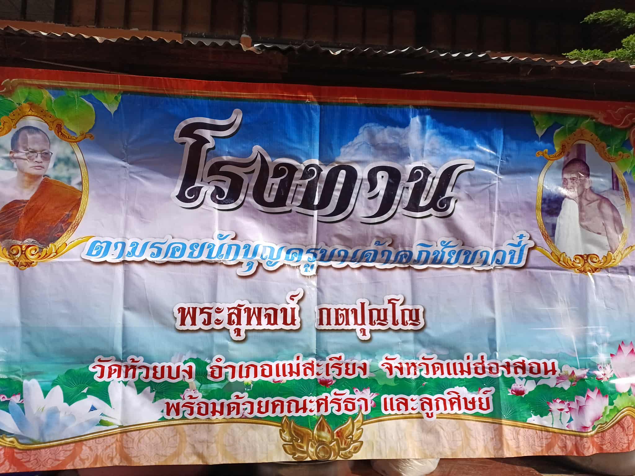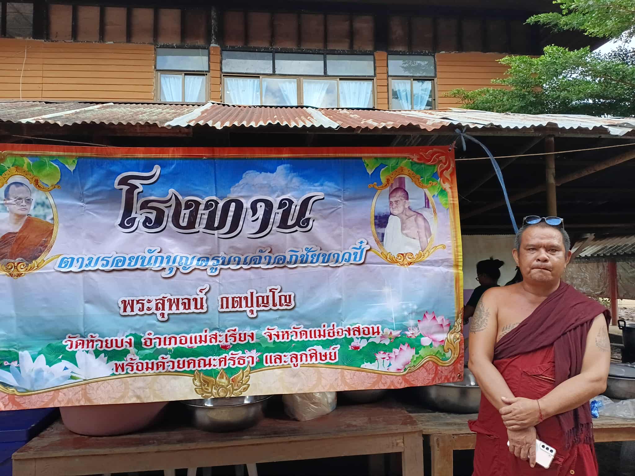 พระสุพจน์ กตปุญโญ เจ้าอาวาสสำนักสงฆ์บ้านห้วยบง กล่าวว่า หลังจากเกิดพายุบัวลอย และ อาตมาภาพทราบข่าวจากสื่อที่เป็นลูกศิษย์ว่ามีเหตุการณ์น้ำป่าไหลหลาก รวมถึงน้ำยวมไหลบ่าเข้าท่วมโรงเรียน ทำให้ทรัพย์สินต่างๆได้รับความเสียหาย มีแต่ความเศร้าโศกเสียใจไปทุกหย่อมหญ้า ทั้งในอำเภอแม่สะเรียง และอำเภอสบเมย จึงได้ประกาศบอกบุญแก่คณะศรัทธาศิษย์ยานุศิษย์ทั้งหลายที่อยากร่วมทำบุญโรงทานเลี้ยงก๋วยเตี๋ยวให้แก่น้องๆนักเรียนเด็กหอพักและผู้คนและหน่วยงานต่างๆที่มาร่วมทำความสะอาดที่ โรงเรียนบ้านแม่สวด และสถานที่ได้รับความเสียหาย ทั้งนี้มีผู้มีจิตศรัทธานำของมาบริจาค ตามเจตนาและกำลังศรัทธา ประกอบด้วย เส้นก๋วยเตี๋ยว พืชผักต่างๆ จึงได้ร่วมกันจัดโรงทานไปเลี้ยงในวันนี้ และยังจะนำไปเลี้ยงในที่เดือดร้อนในสถานที่อื่นๆในอำเภอแม่สะเรียงอีกต่อไป