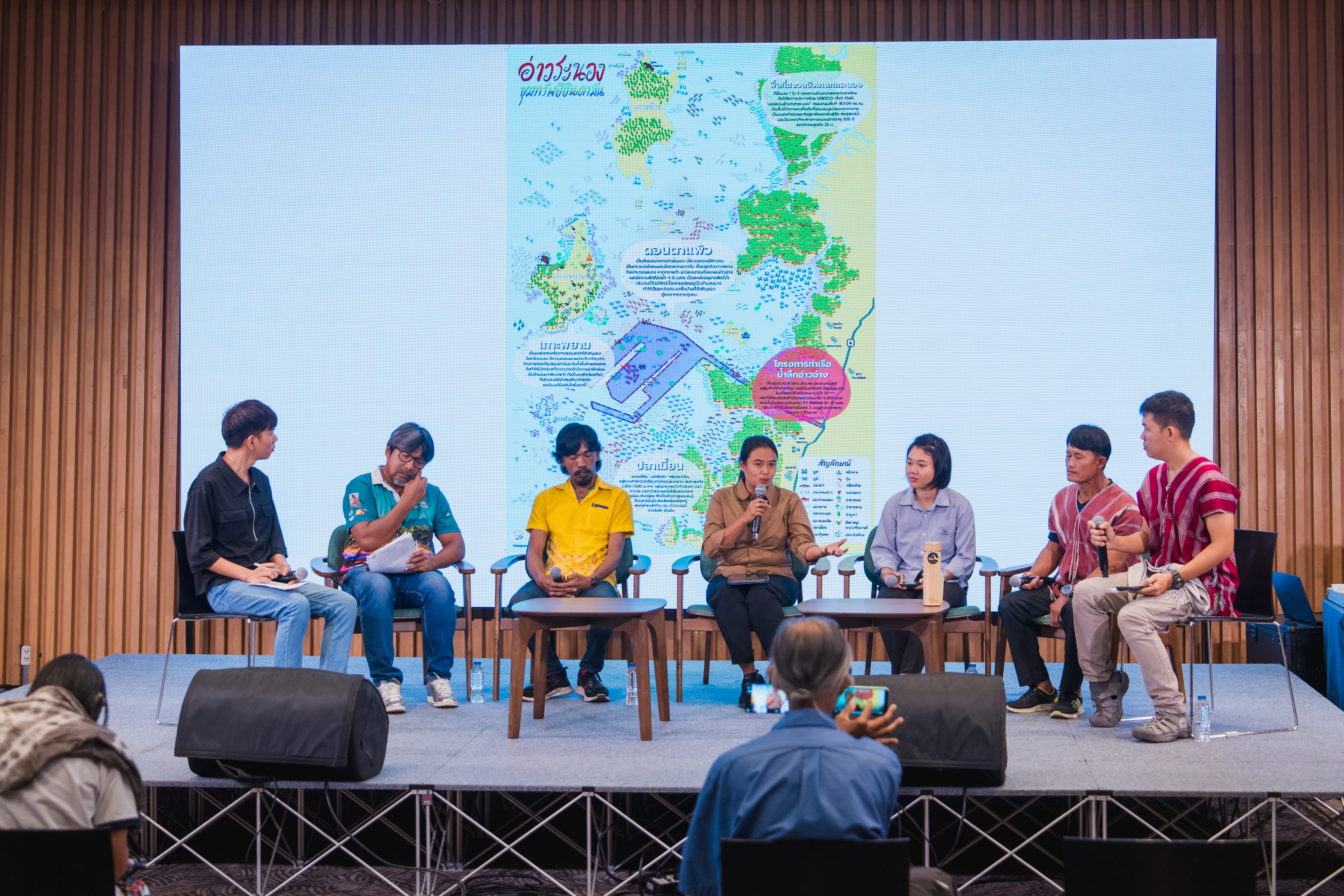 แน่นอนว่าเรื่องทั้งหมดไม่ได้ถูกกล่าวอ้างอย่างเลื่อนลอย ในช่วงสุดท้ายของวงคุยของเวทีเสวนาบ้านใหม่ใกล้ฉันฯ มีผู้ที่เป็นประจักษ์พยาน หรือผู้ที่เผชิญกับความเสี่ยงในการไล่รื้อที่อยู่อาศัย นำคุยโดย ‘ธนกฤต โต้งฟ้า’ ผู้ประสานฝ่ายงานรณรงค์เอิร์ธไรท์ อินเตอร์เนชันแนล พูดถึงกรณีอย่างเหมืองแร่ในภาคเหนือ จังหวัดแม่ฮ่องสอน คาร์บอนเครดิตที่จังหวัดภูเก็ต และแลนด์บริดจ์ที่กำลังก่อสร้างอยู่
