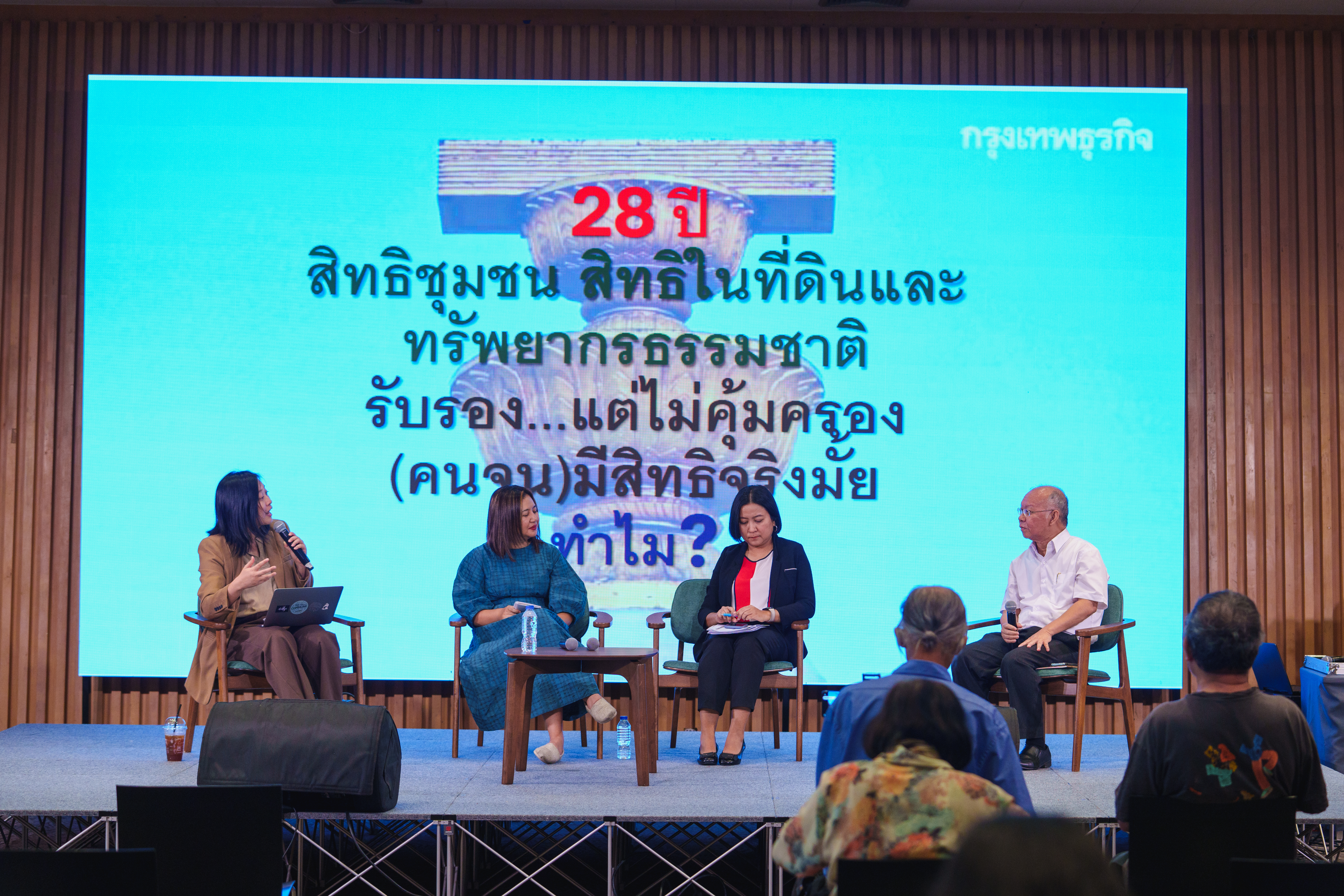 ‘สุมิตรชัย หัตถสาร’ ผู้อำนวยการศูนย์พิทักษ์และฟื้นฟูสิทธิชุมชนท้องถิ่น (CPCR) ได้ตั้งคำถามถึงสิทธิชุมชน สิทธิในที่ดิน และทรัพยากรธรรมชาติที่กล่าวอ้างถึงการรับรอง แต่ไม่คุ้มครองสิทธิของผู้คน และคนจนมีสิทธินั้นจริงหรือไม่ เนื่องด้วยที่ผ่านมารัฐบาลไทยไม่สามารถทำตามกติการะหว่างประเทศได้อย่างมีประสิทธิภาพ จากรายงานในปี 2568 ที่รัฐบาลประกาศนโยบายหนึ่งเรื่องการทวงคืนผืนป่า และนำเรื่องส่งสู่สหประชาชาติ (UN) แต่ถูกตั้งคำถามกลับถึงแผนที่รัฐบาลไทยวางไว้ด้วย เพราะต้องการจะปลูกป่าจากที่ดินของประชาชน ทั้งที่ที่ดินยังเป็นสิทธิมนุษยชนและหัวใจสำคัญของการดำเนินชีวิต ปัจจุบันที่ดินของรัฐมีอยู่ 60% ที่ดินของเอกชนที่มีกฎหมายรับรองสิทธิมี 39% ทำให้อดตั้งคำถามไม่ได้ว่าเราจะเดินเข้าสู่ความเป็นกฎหมายทางสากลได้ในวันไหน และอาจต้องใช้เวลาอย่างยาวนานเพื่อจะนำไปสู่การเปลี่ยนแปลงที่ดีกว่า