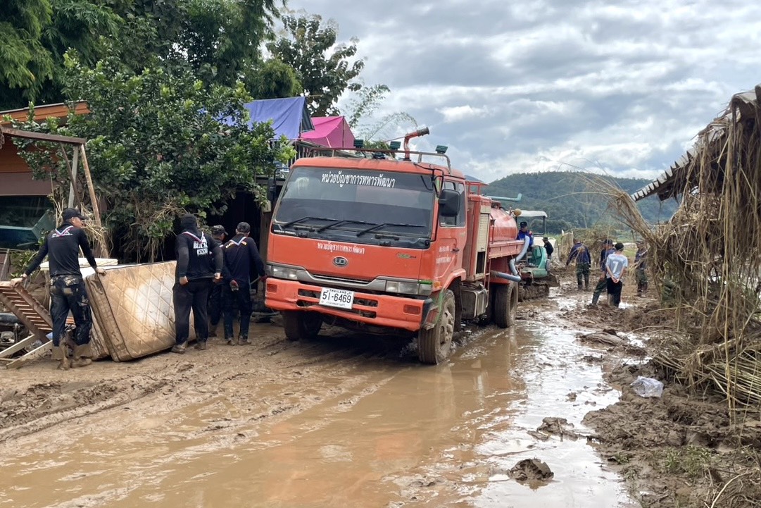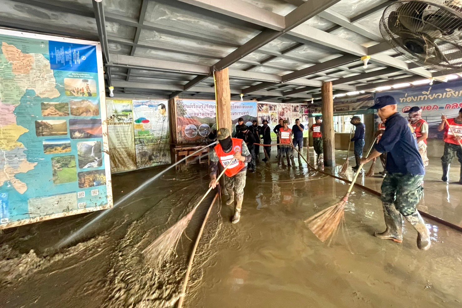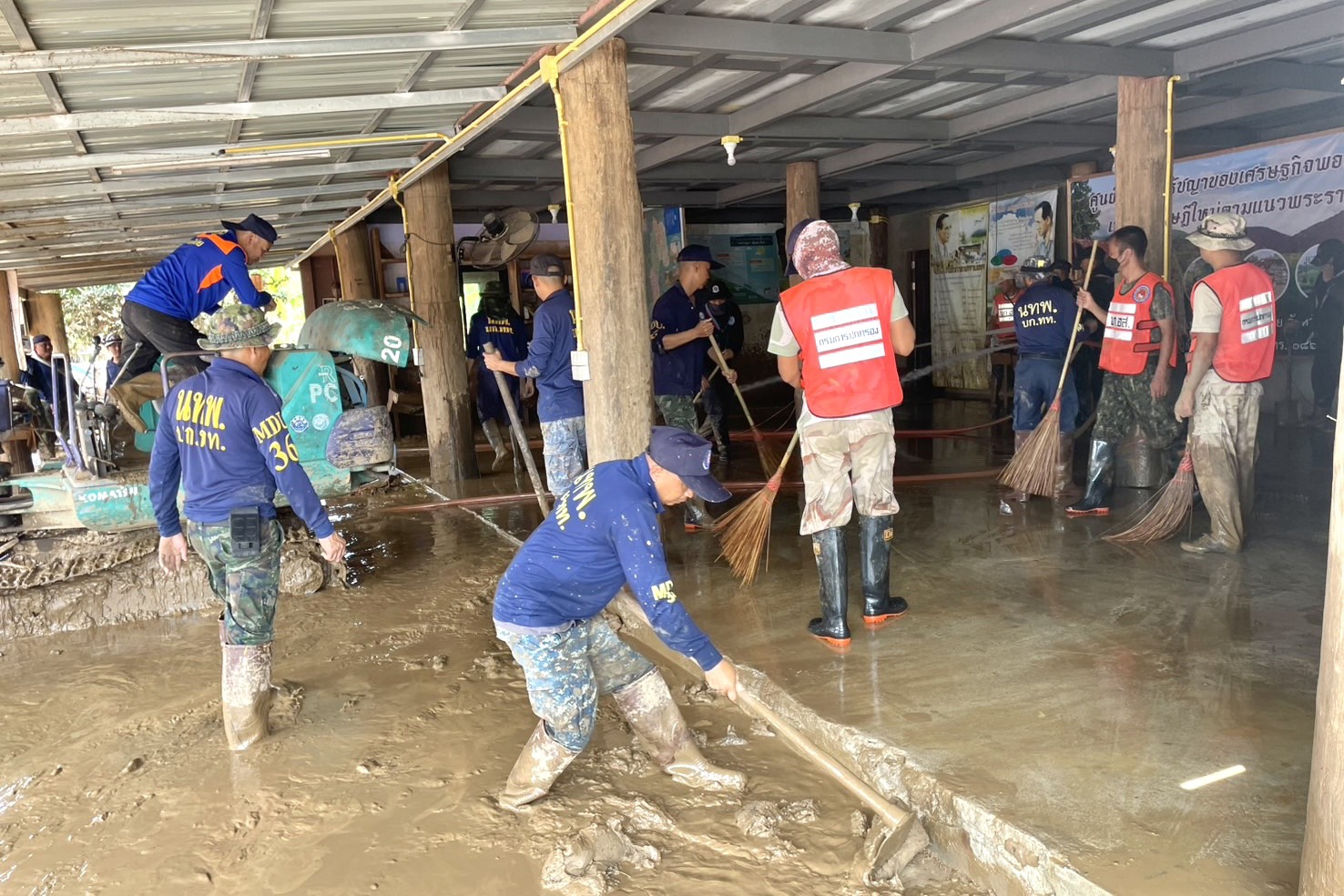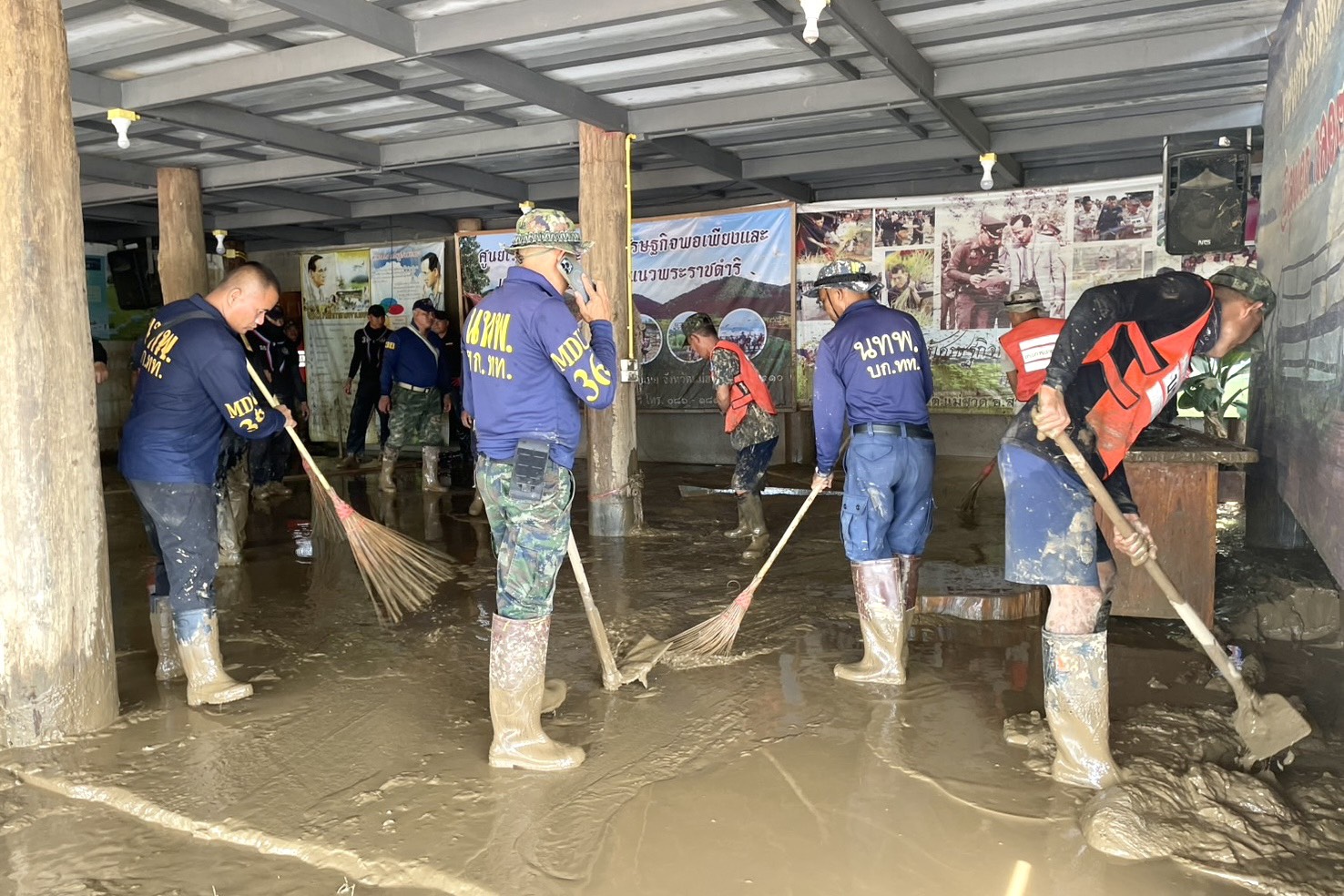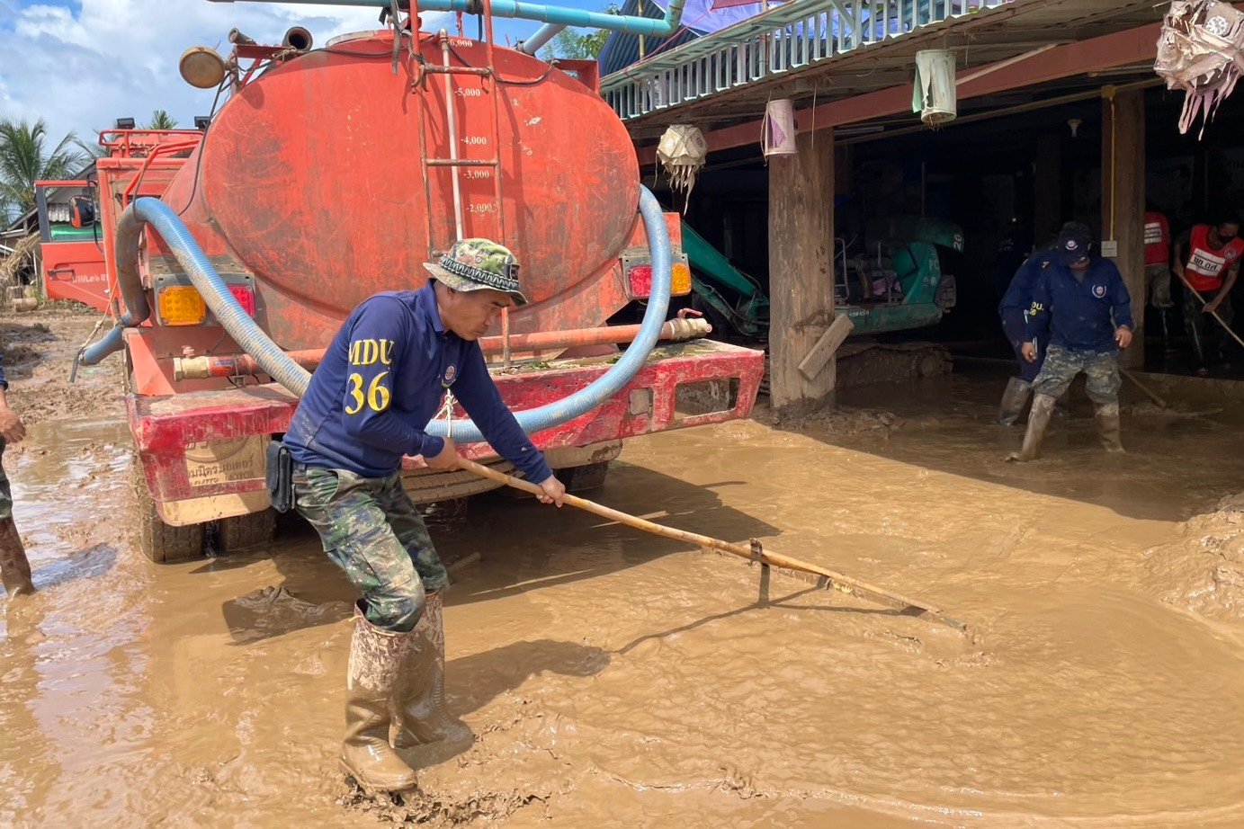 เมื่อวันที่ 7 ต.ค. 68 บก.ทท. (นทพ.) โดย พ.อ. ราชพล ทองอารีย์ ผบ.นพค.36 สนภ.3 นทพ. จัดชุดบรรเทาสาธารณภัยเคลื่อนที่เร็ว นพค.36 สนภ.3 นทพ. จำนวน 10 นาย พร้อมรถยนต์ตรวจการณ์ จำนวน 2 คัน และ รยบ.น้ำ ขนาด 6,000 ลิตร จำนวน 2 คัน ร่วมกับอำเภอสบเมย ช่วยเหลืออุทุกภัยจากเหตุพายุบัวลอย ในพื้นที่บ.แม่สวด ม.1 ต.แม่สวด อ.สบเมย จ.แม่ฮ่องสอน โดยดำเนินการฟื้นฟูศูนย์การเรียนรู้เศรษฐกิจพอเพียงฯ นอกหน่วยฯ และบ้านเรือนประชาชนที่ได้รับผลกระทบจากเหตุอุทกภัย โดยการขนย้ายสิ่งของ ตักดินโคลนที่ทับถมออก เตรียมล้างทำความสะอาดบ้านเรือน ให้กับประชาชนผู้ประสบภัย ในพื้นที่ตำบลแม่สวด อ.สบเมย เพื่อคืนสภาพปกติให้แก่ประชาชนในพื้นที่โดยเร็วที่สุด