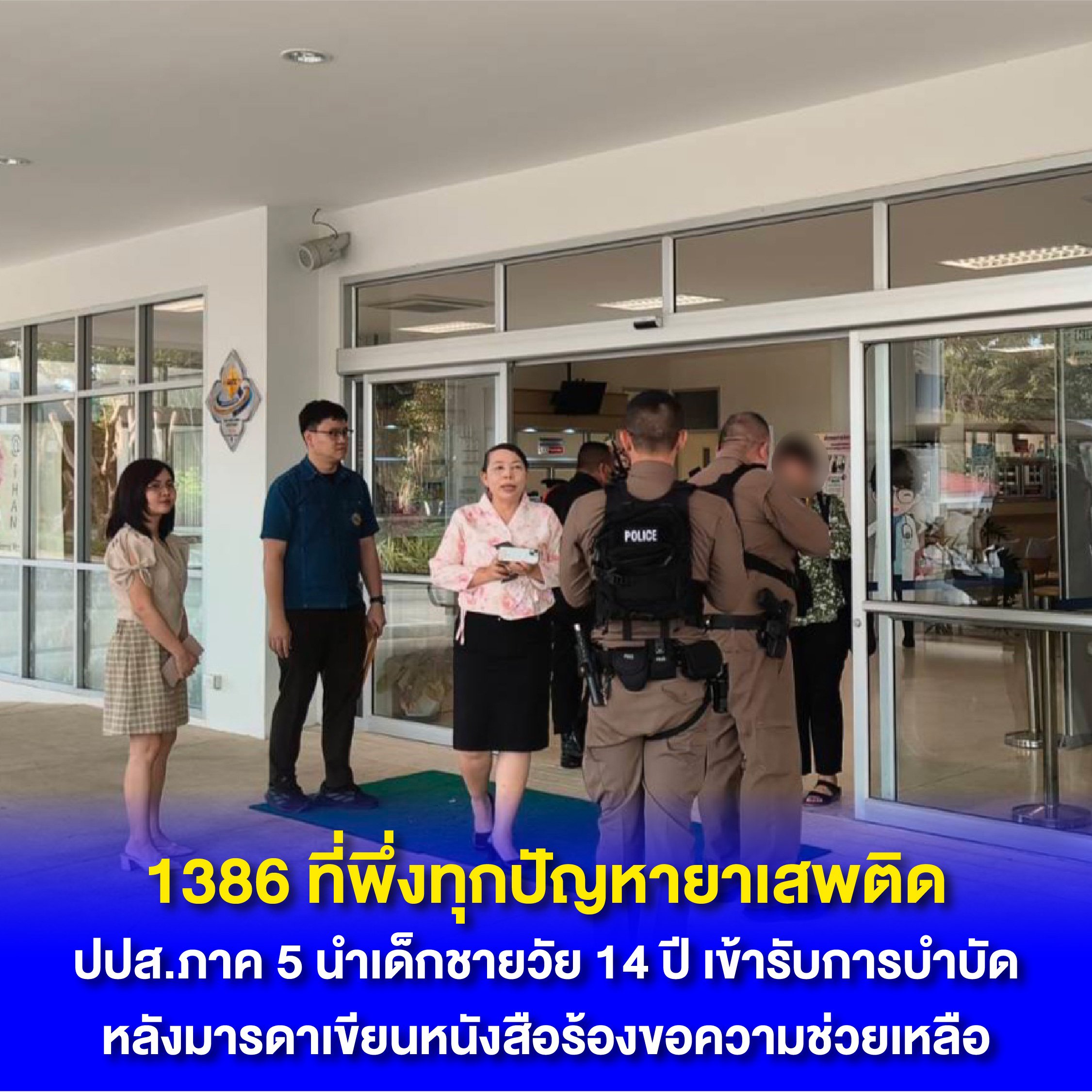 1386 ที่พึ่งทุกปัญหายาเสพติด ปปส.ภาค 5 นำเด็กชายวัย 14 ปี เข้ารับการบำบัด หลังมารดาเขียนหนังสือร้องขอความช่วยเหลือ