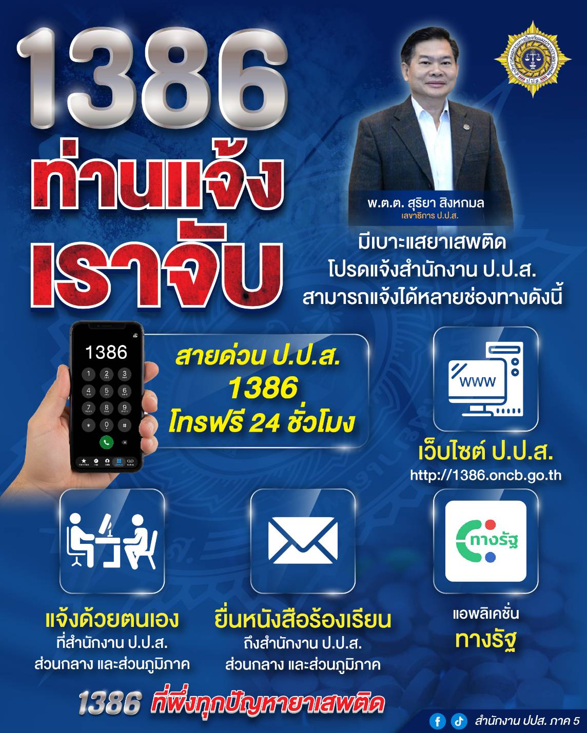 ทั้งนี้ 1386 เป็นช่องทางการรับเรื่องร้องเรียนยาเสพติดของ สำนักงาน ป.ป.ส. โดยพันตำรวจตรี สุริยา สิงหกมล เลขาธิการ ป.ป.ส. มุ่งหวังให้ 1386 เป็นที่พึ่งทุกปัญหายาเสพติด ดำเนินการเชิงรุกตามนโยบายเร่งด่วนของรัฐบาล ภายใต้การนำของ นายอนุทิน ชาญวีรกูล นายกรัฐมนตรี และ พลตำรวจโท รุทธพล เนาวรัตน์ รัฐมนตรีว่าการกระทรวงยุติธรรม ที่มุ่งแก้ไขปัญหายาเสพติดในทุกมิติ