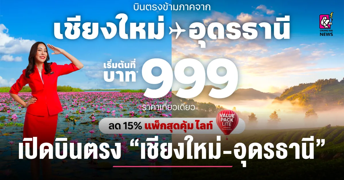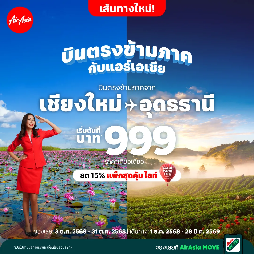 แอร์เอเชียเปิดบินตรงข้ามภาค “เชียงใหม่-อุดรธานี” เริ่มต้น 999 บาทต่อเที่ยวบิน! เชื่อมเหนือ-อีสานบินสะดวกยิ่งขึ้น จองได้เลย..เริ่มบิน 1 ธ.ค. 2568 นี้