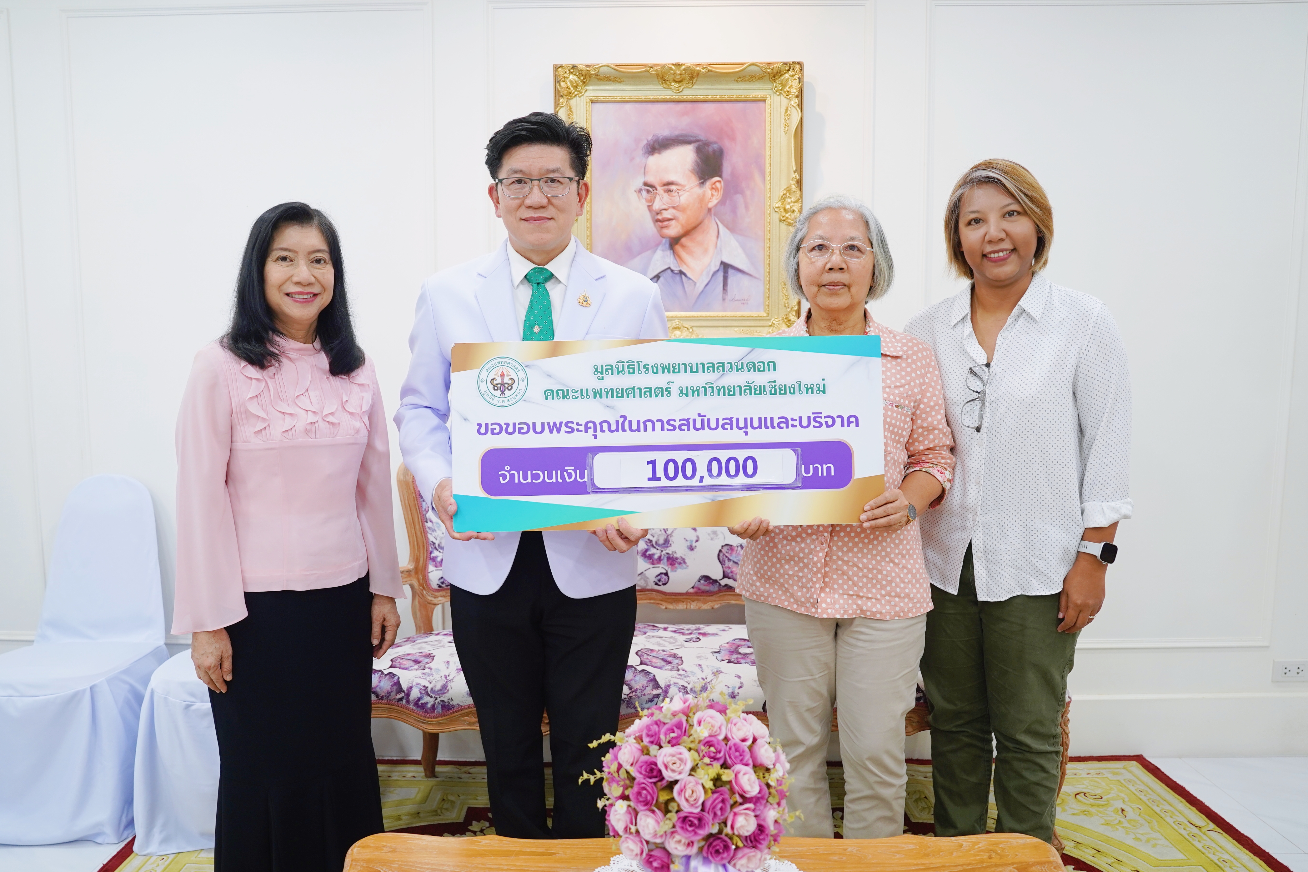 รศ.นพ.นเรนทร์ โชติรสนิรมิต คณบดีคณะแพทยศาสตร์ มหาวิทยาลัยเชียงใหม่ พร้อมด้วย คุณพัชรา อุบลศรี ที่ปรึกษาประธานมูลนิธิโรงพยาบาลสวนดอก รับมอบเงินบริจาคจำนวน 100,000 บาท จาก คุณประเมิน ธรรมาธิวัฒน์ พร้อมครอบครัว สมทบทุนมูลนิธิโรงพยาบาลสวนดอก กิจกรรมคอนเสิร์ตการกุศลสวนดอกร้อยดวงใจ เพื่อปรับปรุงไอซียูผ่าตัดหัวใจและผ่าตัดสมอง