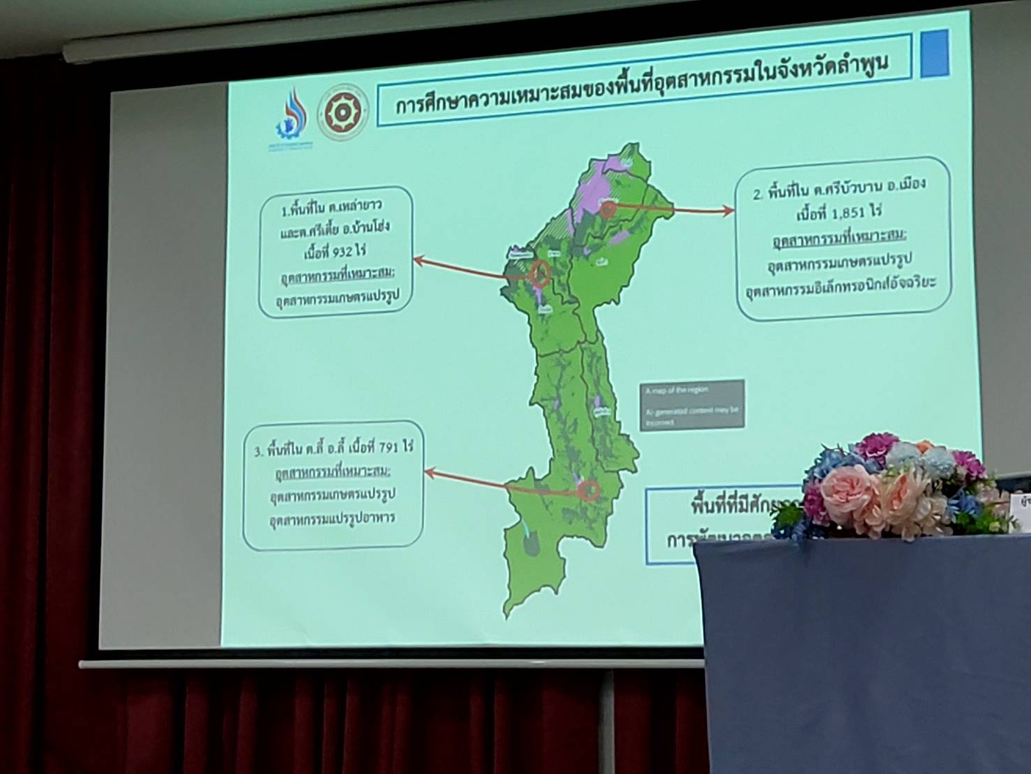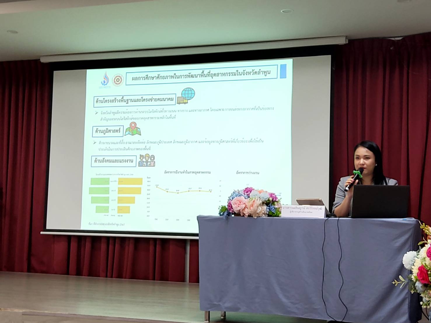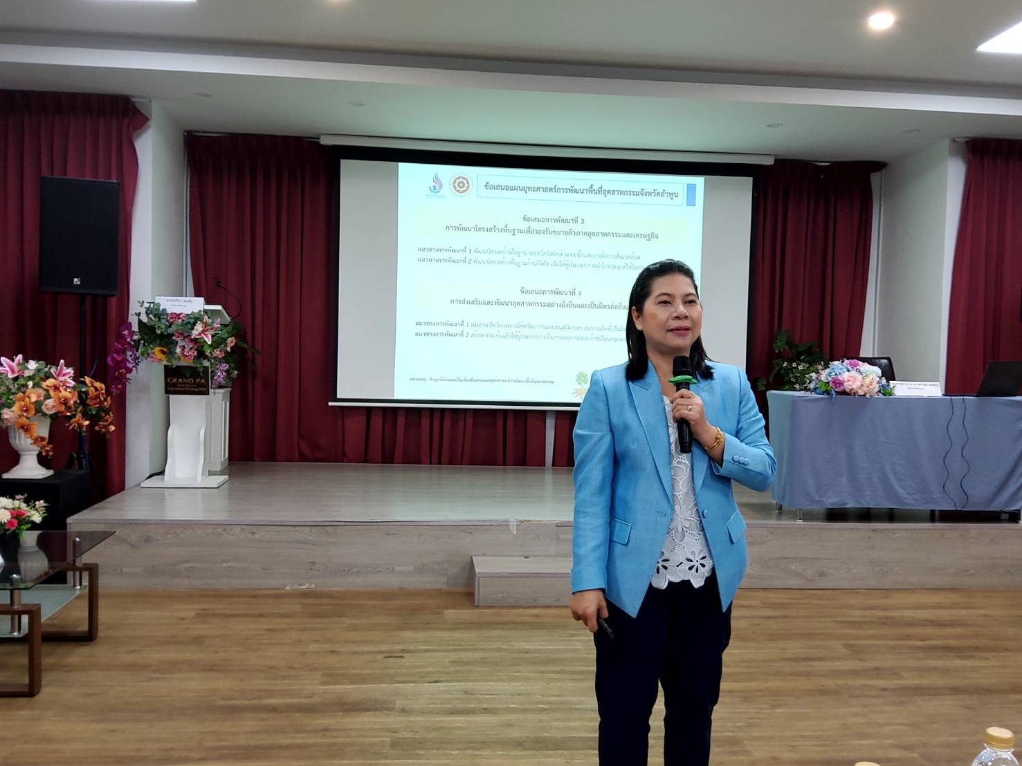 - การชี้แจงรายละเอียดและการดำเนินงานโครงการ และข้อเสนอแผนยุทธศาสตร์การพัฒนาพื้นที่อุตสาหกรรมจังหวัดลำพูน โดย รองศาสตราจารย์ ดอกเตอร์ จุฑารัตน์ ชมพันธุ์ ผู้จัดการโครงการฯ