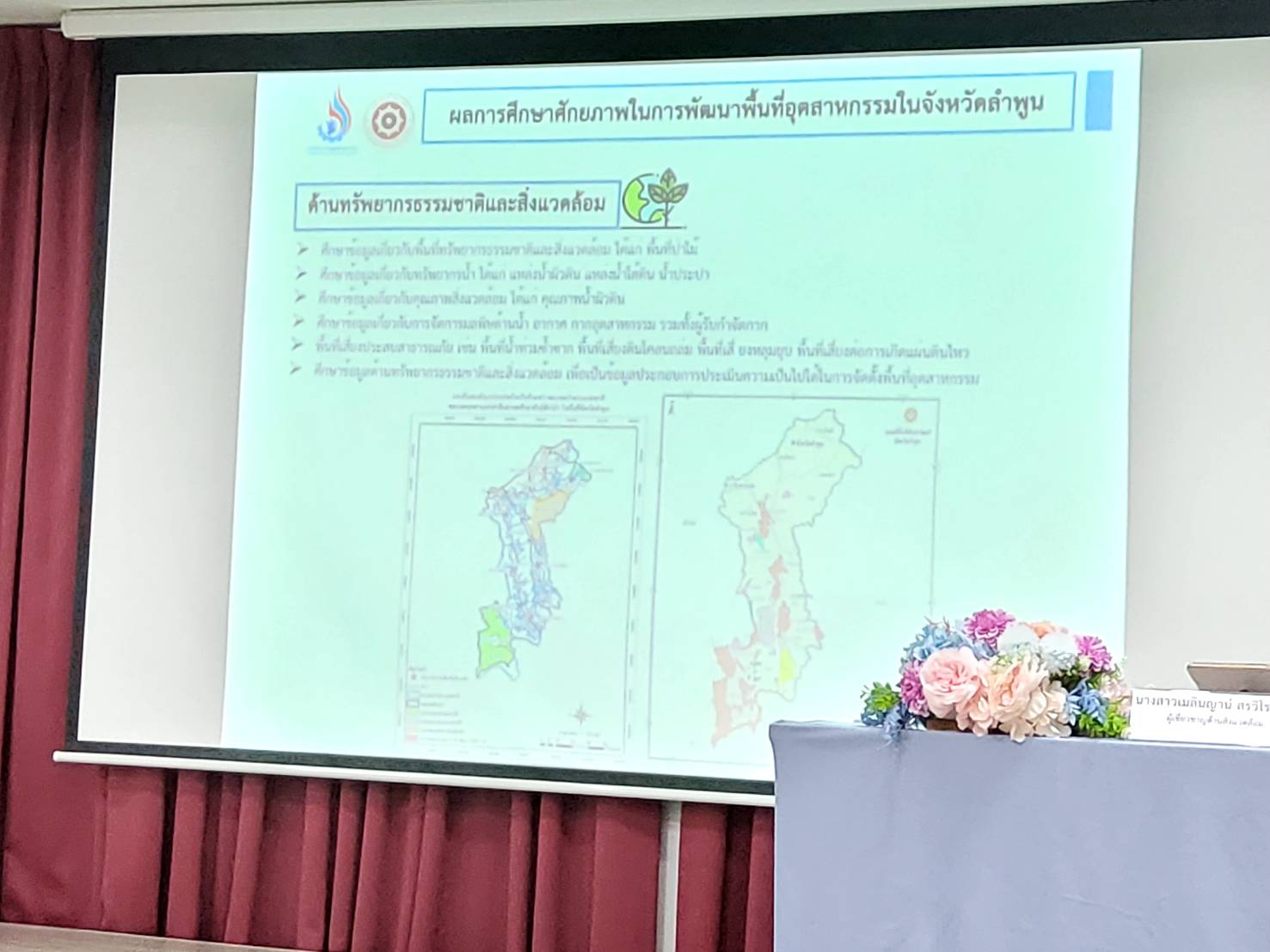 - การนำเสนอผลการศึกษาศักยภาพในการพัฒนาพื้นที่อุตสาหกรรม และผลการศึกษาและวิเคราะห์ประมาทอุตสาหกรรมที่ควรจัดตั้งในพื้นที่อุตสาหกรรมจังหวัดลำพูน โดย นางสาวเมลินญาน์ สรวิโรจน์วุฒิ ผู้เชี่ยวชาญด้านสิ่งแวดล้อม