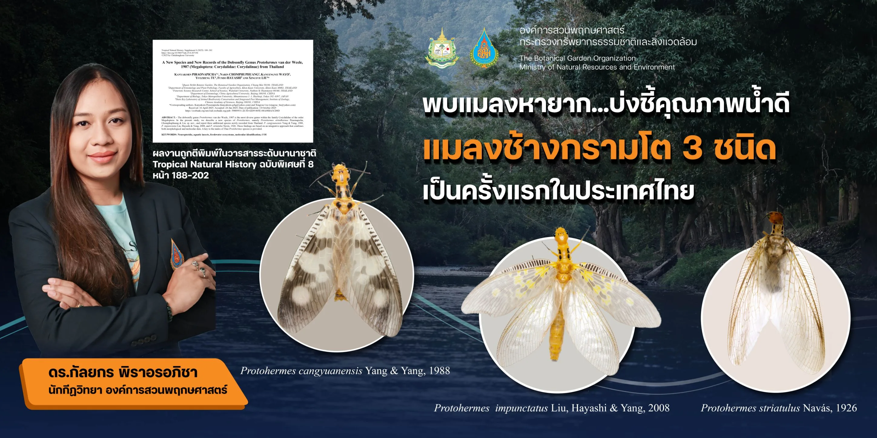 ดร.กัลยกร พิราอรอภิชา นักกีฏวิทยา องค์การสวนพฤกษศาสตร์ และคณะนักวิจัยทั้งไทยและต่างประเทศ ร่วมกันค้นพบ แมลงช้างกรามโต (Dobsonfly) ทั้ง 3 ชนิด จากภาคเหนือของประเทศไทยเป็นครั้งแรก ซึ่งผลงานวิจัยดังกล่าวได้รับการตีพิมพ์ในวารสารวิชาการระดับนานาชาติ Tropical Natural History (ฉบับพิเศษที่ 8 หน้า 188–202)