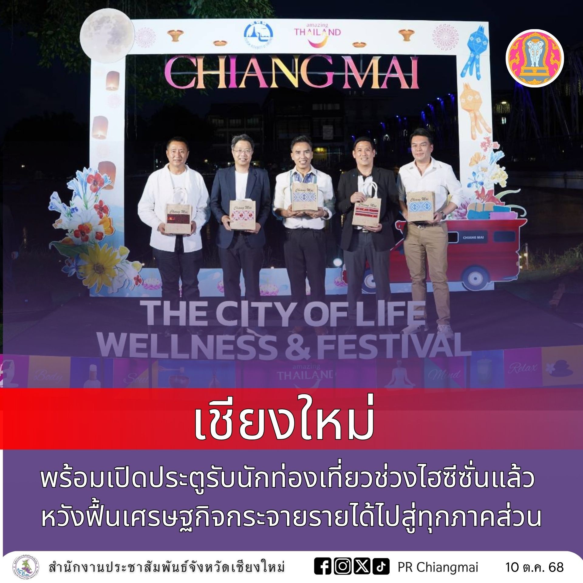 นายวีรพงศ์ ฤทธิ์รอด รองผู้ว่าราชการจังหวัดเชียงใหม่ ได้กล่าวขอบคุณภาคการท่องเที่ยวทุกหน่วยงานที่ได้สรรสร้างกิจกรรมดีๆ หลายอย่างขึ้นมา พร้อมทั้งร่วมกันกำหนดทิศทางการขับเคลื่อนด้านการท่องเที่ยวของจังหวัดเชียงใหม่ เพื่อฟื้นเศรษฐกิจให้จังหวัดเชียงใหม่ภายหลังที่ประสบกับสาธารณภัยต่างๆ มานานนับปี จนสามารถผ่านมาได้และกำลังจะก้าวเข้าสู่ช่วงเวลาของการเปิดประตูของฤดูกาลไฮซีซั่นของจังหวัดเชียงใหม่ ซึ่งหลังจากนี้พี่น้องภาคการท่องเที่ยว ผู้ประกอบการก็จะได้ยิ้ม พร้อมรับนักท่องเที่ยว โดยเชื่อว่าในปี 2569 เราจะก้าวเข้าสู่ความมั่งคั่งไปด้วยกัน บนความร่วมมือของทุกภาคส่วนและนำไปสู่การกระจายรายได้ไปยังภาคส่วนต่างๆ ทั้งคนทำงานทั่วไป ภาคอุตสาหกรรม ภาคการเกษตร ล้วนได้รับประโยชน์จากการที่การท่องเที่ยวของเชียงใหม่กำลังเติบโตขึ้น