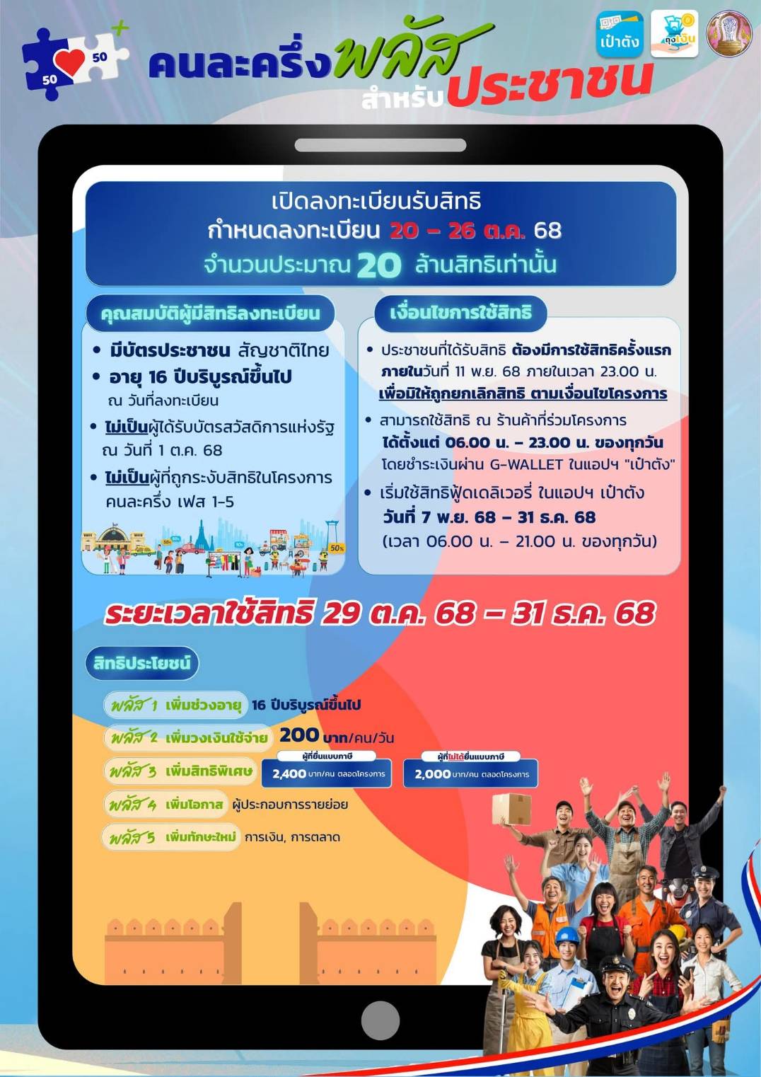 • 29 ต.ค. – 31 ธ.ค. 68: ใช้สิทธิ “คนละครึ่งพลัส”