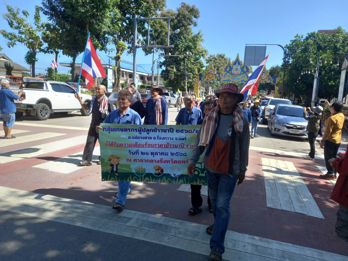 ชาวนา ต.แม่ยางตาล อ.ร้องกวาง เดือดบุกศาลากลาง จ.แพร่ ให้จังหวัดช่วยจี้รัฐบาลช่วยเหลือด่วน ราคาข้าวสดราคาตกเหลือ 6.80 บาท ขอให้รัฐช่วยเหลือพยุงราคาเป็น 11 บาท หรือให้อยู่ได้ทึ่ 8-9 บาท ขึ้นไป