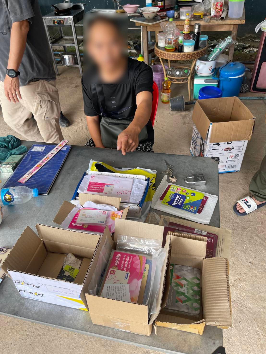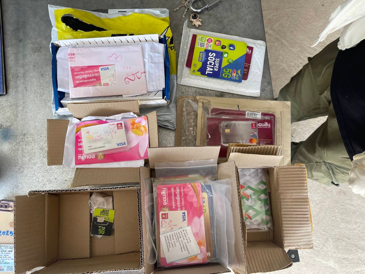 ผลการตรวจสอบ พบของกลางประกอบด้วย บัญชีธนาคารออมสิน 12 เล่ม บัญชีธนาคารกสิกรไทย 4 เล่ม บัญชีธนาคารกรุงเทพ 1 เล่ม บัตรเอทีเอ็มธนาคารออมสิน 12 บัตร บัตรเอทีเอ็มธนาคารกสิกรไทย 6 บัตร บัตรเอทีเอ็มธนาคารกรุงเทพ 1 บัตร ซิมการ์ดโทรศัพท์มือถือเครือข่าย AIS 20 อัน บรรจุอยู่ในกล่องพัสดุทั้ง 6 กล่องที่ถูกตรวจยึดได้ และตรวจยึดโทรศัพท์มือถือยี่ห้อไอโฟน 8 พลัส ของผู้ต้องหาไว้เพื่อตรวจสอบขยายผล