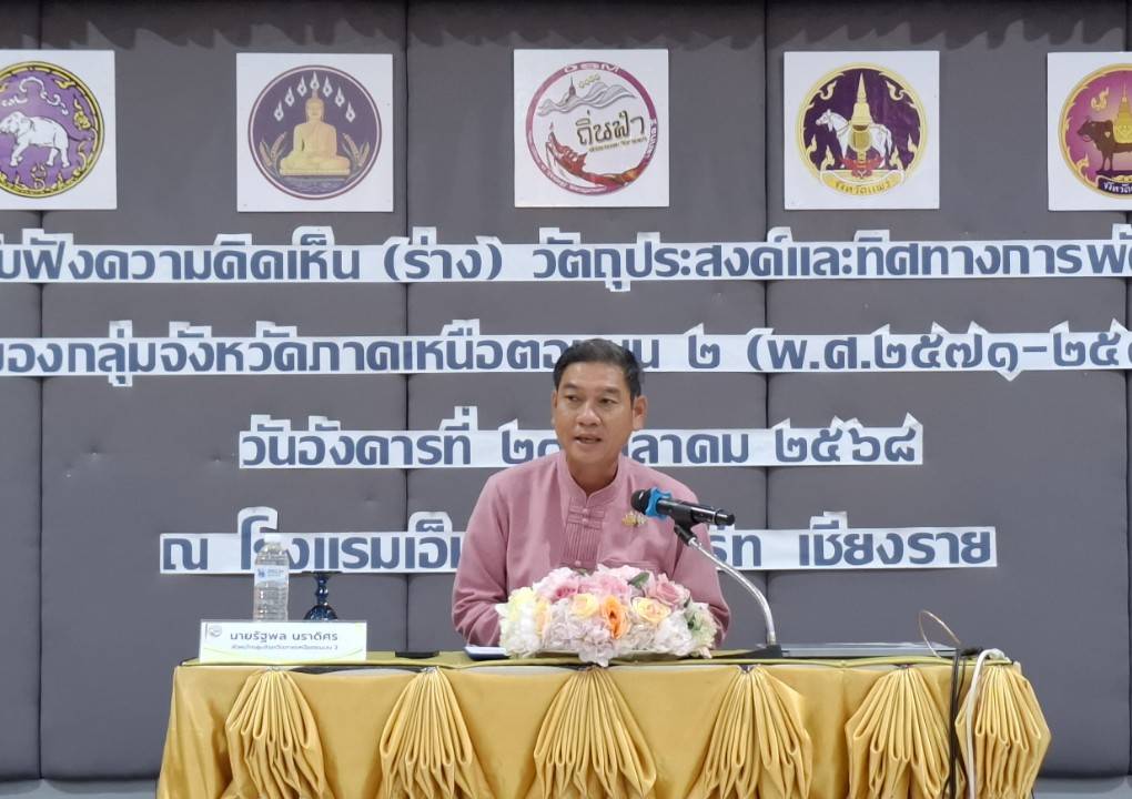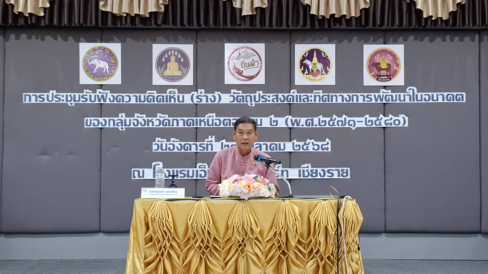 วันอังคารที่ 21 ตุลาคม 2568 เวลา 09.00 น. นายรัฐพล นราดิศร ผู้ว่าราชการจังหวัดเชียงราย หัวหน้ากลุ่มจังหวัดภาคเหนือตอนบน 2 เป็นประธานเปิดการประชุมรับฟังความคิดเห็น (ร่าง) วัตถุประสงค์และทิศทางการพัฒนาในอนาคตของกลุ่มจังหวัดภาคเหนือตอนบน 2 (พ.ศ.2571 – 2580) ในประเด็นสถานการณ์การพัฒนาของกลุ่มจังหวัด/ปัจจัยและแนวโน้มที่คาดว่าจะส่งผลต่อการพัฒนากลุ่มจังหวัดภาคเหนือตอนบน 2 เพื่อให้ทุกภาคส่วนมีส่วนร่วมในการพัฒนากลุ่มจังหวัด บนพื้นฐานศักภาพ โอกาส และบริบทการเปลี่ยนแปลง ตลอดจนตอบสนองความต้องการของประชาชนในพื้นที่กลุ่มจังหวัด เพื่อให้เกิดการพัฒนาอย่างเท่าเทียมตามศักภาพในพื้นที่