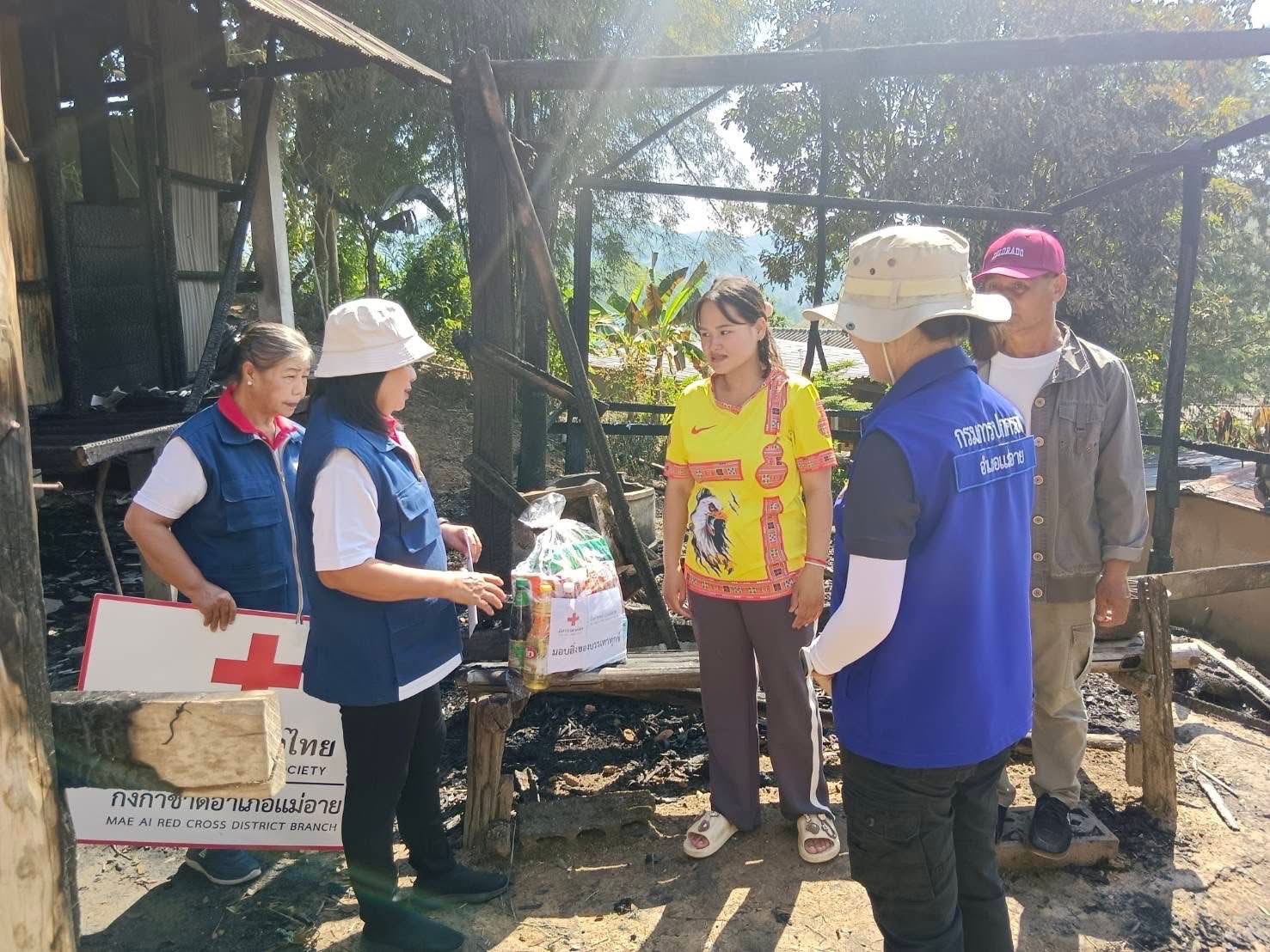 วันที่ 21 ตุลาคม 2568 เวลา 13.30 น. นางสลีลญา คำภาแก้ว นายอำเภอแม่อาย/นายกกิ่งกาชาดอำเภอแม่อาย มอบหมายให้นางเรียม ดวงจันทร์คำ รองนายกกิ่งกาชาดอำเภอแม่อาย พร้อมด้วยคณะกรรมการกิ่งกาชาดอำเภอแม่อาย และนางสาวระพีพรรณ ลัดดาธนพงษ์ ปลัดอำเภอแม่อาย เยี่ยมให้กำลังใจและมอบเงินช่วยเหลือผู้ประสบเหตุอัคคีภัย (เมื่อวันที่ 20 ตุลาคม 2568 ที่ผ่านมา) พร้อมมอบถุงยังชีพ ให้แก่ครอบครัวของ นายปะสี จะทอ อายุ 63 ปี โดยมีนางสาววนิดา จะทอ (ลูกสาว ) เป็นผู้รับมอบ ณ บ้านเลขที่ 7/ช หมู่ที่ 13 (หย่อมบ้านป่าแขม) ตำบลท่าตอน อำเภอแม่อาย