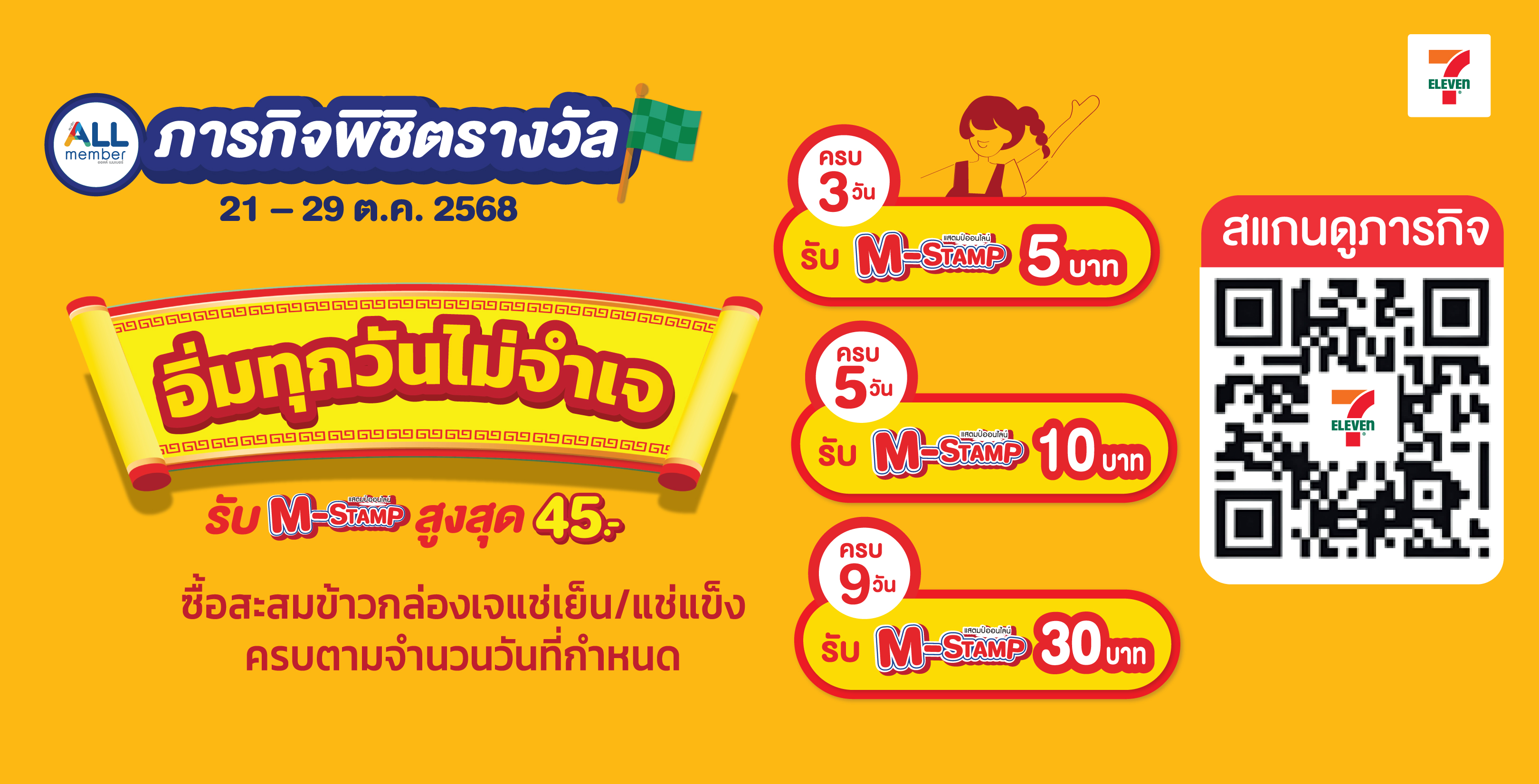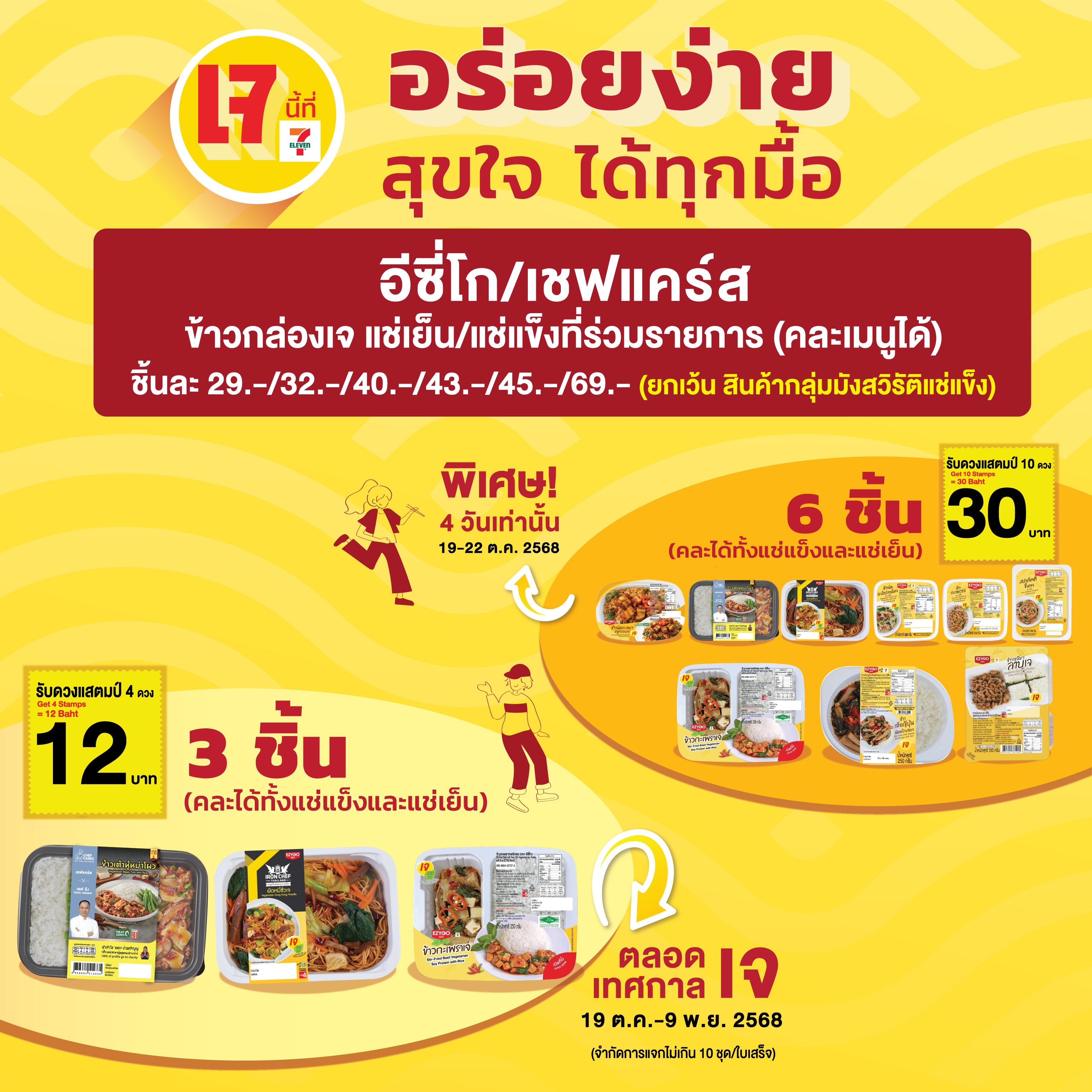 ขอเชิญชวนลูกค้า ต้อนรับเทศกาลเจปี 2568 ซึ่งจัดขึ้นในช่วง วันที่ 19-29 ตุลาคม 2568 นี้ ไปพร้อมกับเซเว่น อีเลฟเว่น ที่จัดเต็มเมนูเจหลากหลายสไตล์ ไม่ว่าจะเมนูคาว หวาน หรือของว่าง ก็อร่อยง่าย สุขใจ และสะดวกสุด ๆ พร้อมโปรโมชั่นสุดคุ้มให้ Joy ได้ทุกวัน ที่ร้านเซเว่น อีเลฟเว่น และ 7Delivery ทุกสาขาทั่วประเทศ ตลอด 24 ชั่วโมง