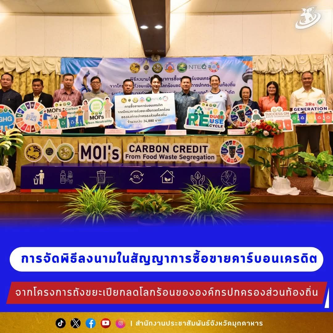เมื่อวันที่ 22 ตุลาคม 2568 เวลา 11:00 น. ณ ห้องมุจลินทร์ ชั้น 3 โรงแรมมุกดาหาร แกรนด์ โฮเทล อำเภอเมือง จังหวัดมุกดาหาร นายวรญาณ บุญณราช ผู้ว่าราชการจังหวัดมุกดาหาร เป็นประธานในพิธีและร่วมลงนามในสัญญาการซื้อขายคาร์บอนเครดิต จากโครงการขยะเปียกลดโลกร้อนขององค์กรปกครองส่วนท้องถิ่น