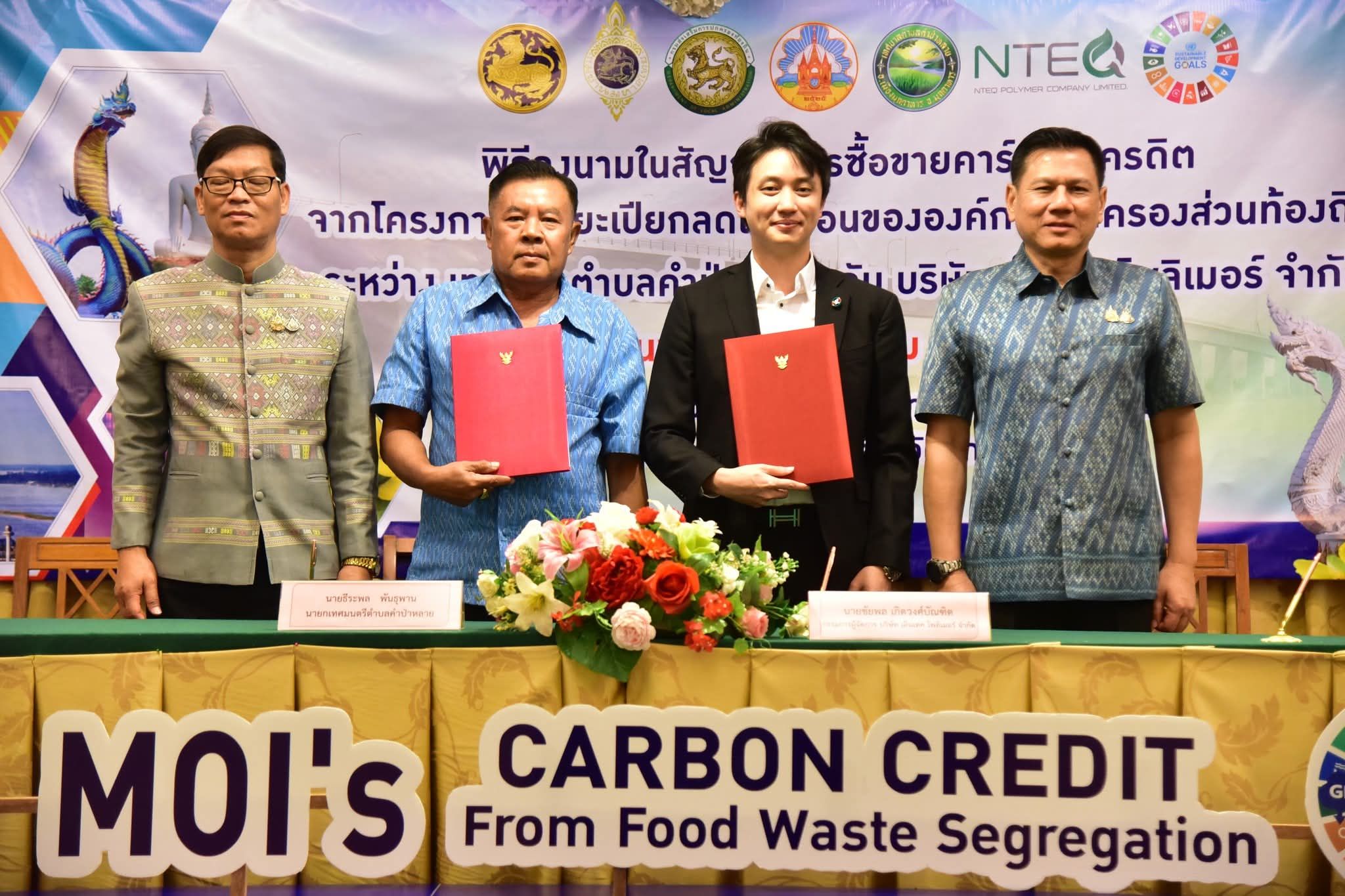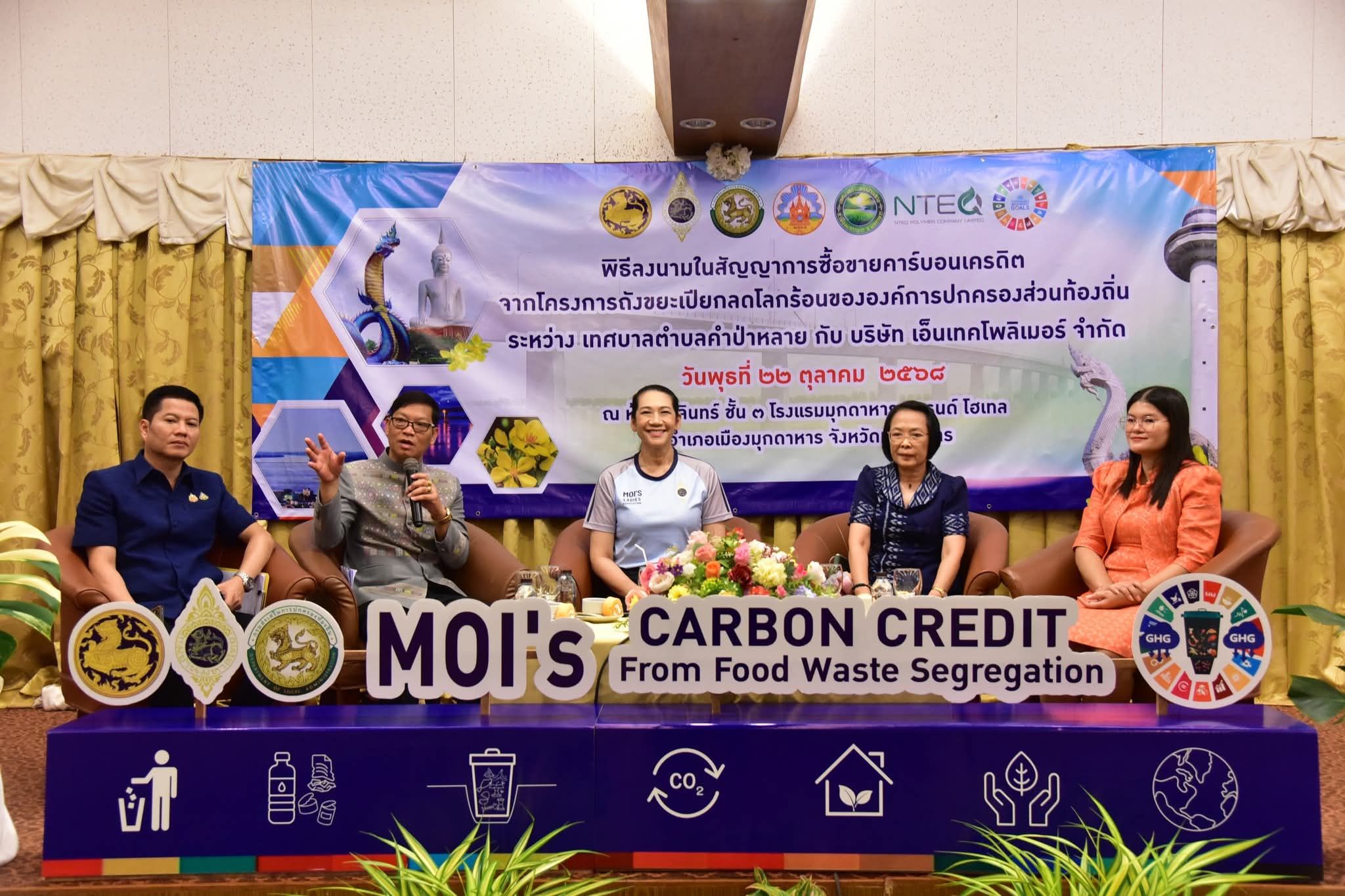 สำนักงานส่งเสริมการปกครองท้องถิ่นจังหวัดมุกดาหารได้รับการประสานจากบริษัท เอ็นเทค โพลิเมอร์ จำกัด ซึ่งตระหนักถึงความสำคัญของการลดโลกร้อนและการปล่อยก๊าซเรือนกระจก ตามนโยบายของรัฐบาล จึงมีความประสงค์ที่จะดำเนินการซื้อขายคาร์บอนเครดิตที่ได้รับการรับรองจากองค์การบริหารจัดการก๊าซเรือนกระจกในพื้นที่ เขตเทศบาลตำบลคำป่าหลาย จำนวน 149.52 ตันคาร์บอนไดออกไซต์เทียบเท่า โดยมีการตกลงราคาซื้อขาย ระหว่างเทศบาลตำบลคำป่าหลายกับบริษัท เอ็นเทค โพลิเมอร์ จำกัด ในราคาปริมาณ ตันละ 250 บาท/ตัน รวมเป็นเงินทั้งสิ้น จำนวน 34,880 บาท ซึ่งจังหวัดมุกดาหารได้จัดพิธีลงนามในสัญญาซื้อขายอย่างเป็นทางการในวันนี้ เพื่อประชาสัมพันธ์ความสำเร็จของโครงการถังขยะเปียก ลดโลกร้อน และส่งเสริมให้เกิดการซื้อขายคาร์บอนเครดิตระหว่างภาคเอกชนและองค์กรปกครองส่วนท้องถิ่นอื่นๆ ในจังหวัดต่อไป.