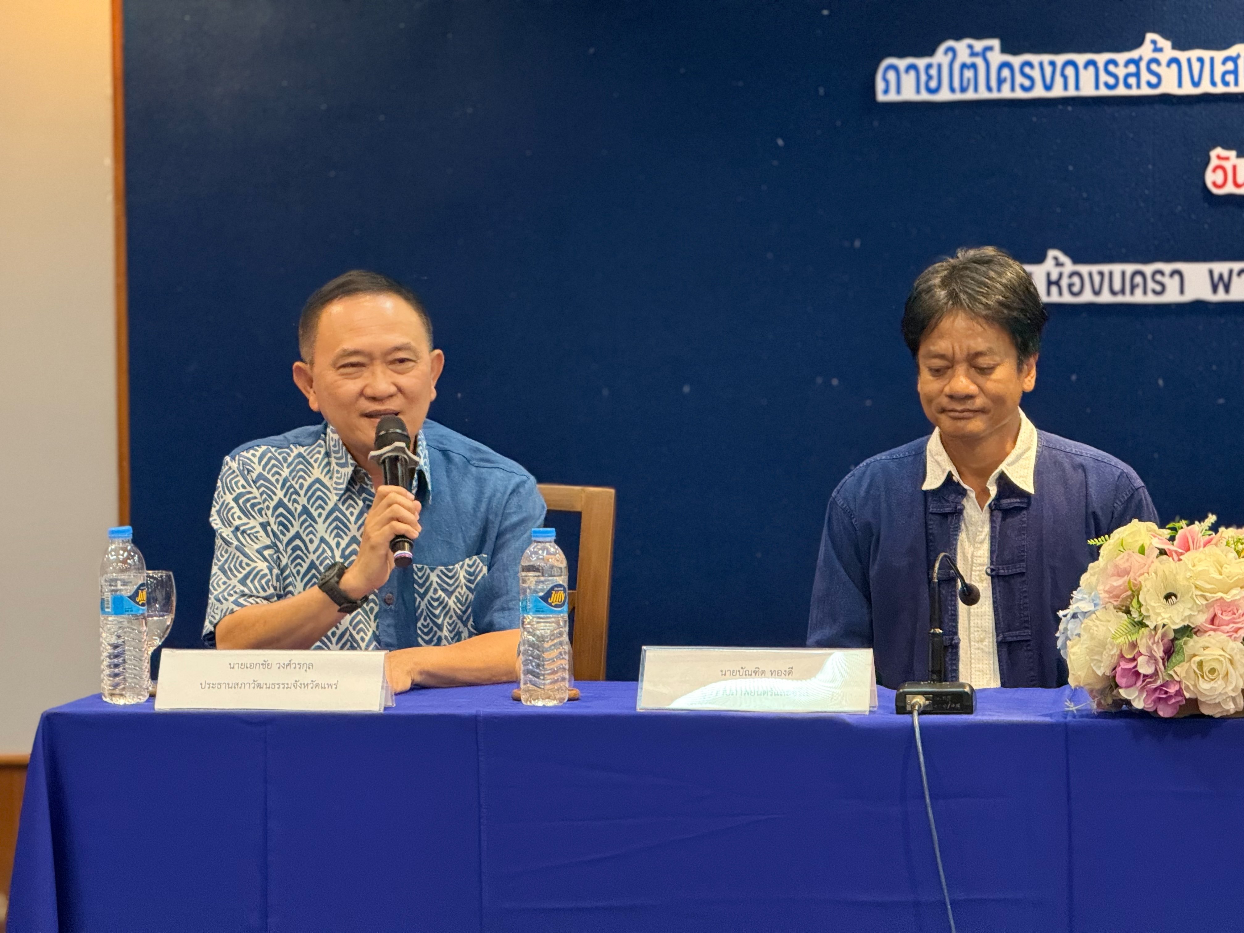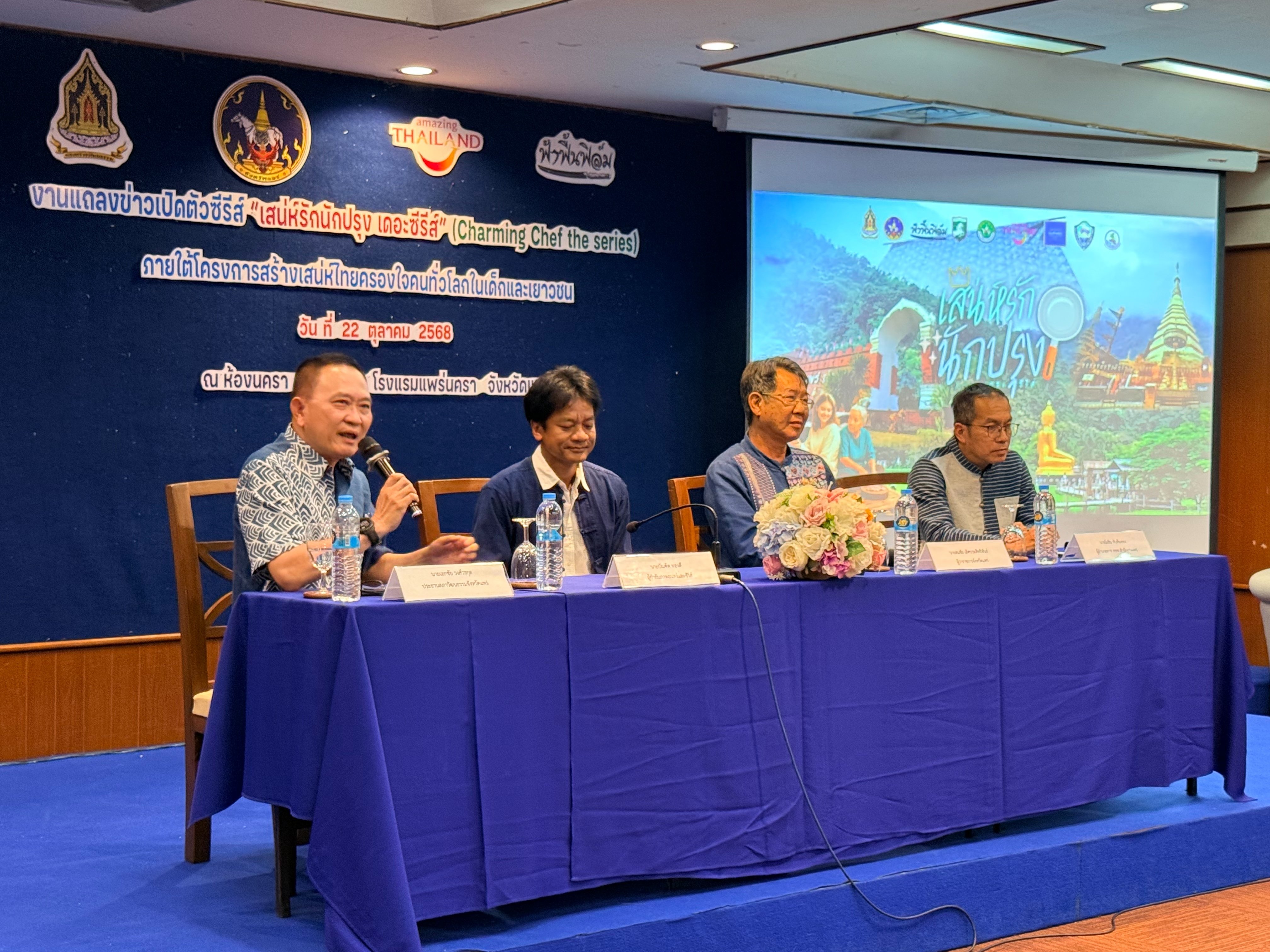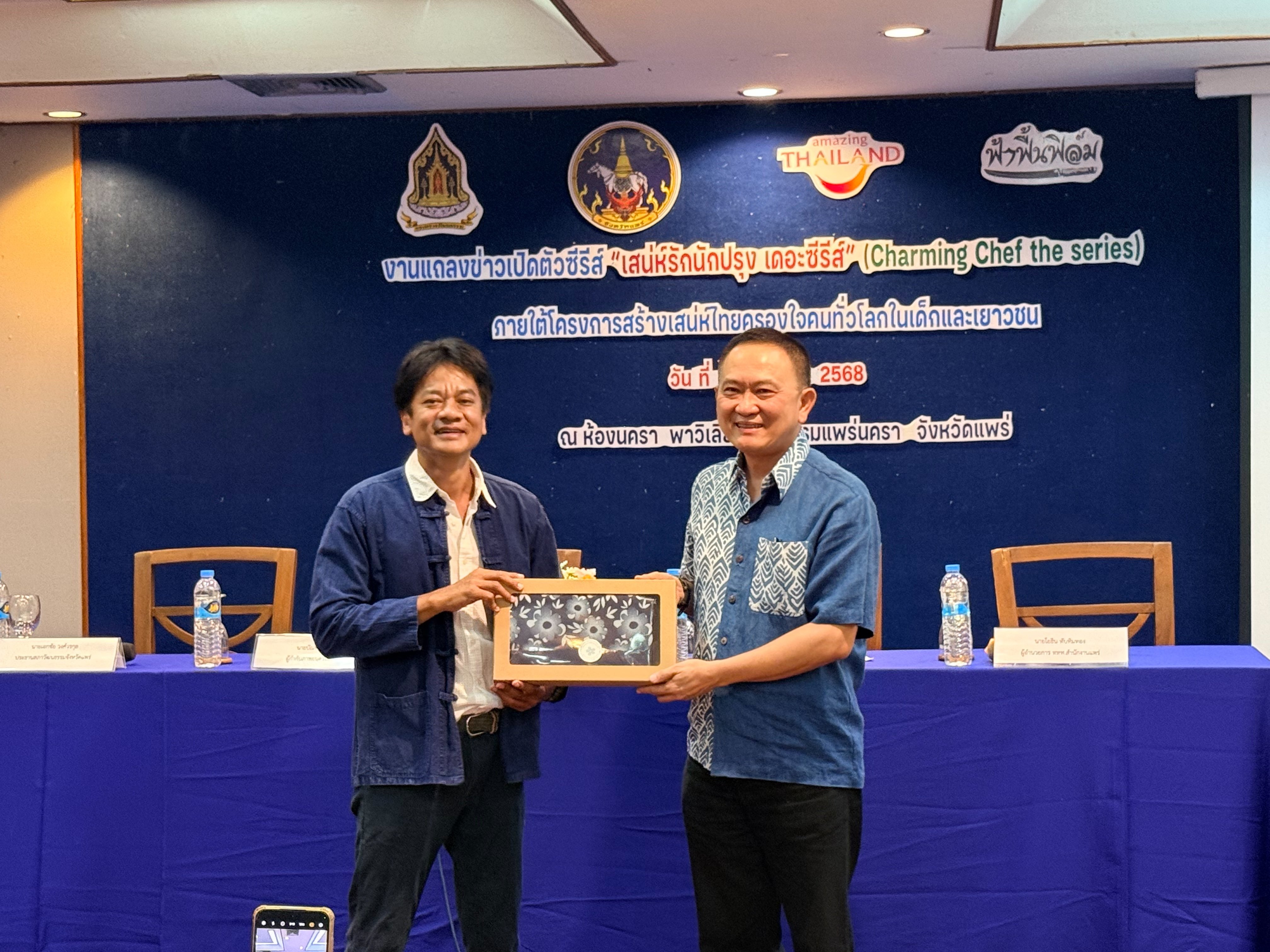 เมือเย็นวันที่ 22 ตุลาคม 2568 เวลา 16.00 น. ที่ห้องนคราพาวิเลียน ชั้น 2 โรงแรมแพร่นครา อำเภอเมืองแพร่ จังหวัดแพร่ นายสมชัย เลิศประสิทธิพันธ์ ผู้ว่าราชการจังหวัดแพร่ พร้อมด้วยนายบัณฑิต ทองดี ผู้กำกับภาพยนตร์และซีรีส์ นายเอกชัย วงศ์วรกุล ประธานสาภาวัฒนธรรมจังหวัดแพร่ และนายโยธิน ทับทิมทอง ผู้อำนวยการ ททท.สำนักงานแพร่ ร่วมกันแถลงข่าวเปิดตัวซีรี่ส์ “เสน่ห์รักนักปรุง เดอะซีรีส์” (Charming Chef the Series) ภายใต้โครงการ “สร้างเสน่ห์ไทยครองใจคนทั่วโลกในเด็กและเยาวชน” โดยบริษัท ฟ้าฟื้น ฟิล์ม จำกัด ได้รับการสนับสนุนงบประมาณจากสำนักงานปลัดกระทรวงวัฒนธรรม ในการผลิตและเผยแพร่สื่อสร้างภาพลักษณ์ประเทศไทยผ่านศิลปะ วัฒนธรรม และภูมิปัญญาท้องถิ่น เพื่ออนุรักษ์ ฟื้นฟู และต่อยอดศิลปะวัฒนธรรมไทย สร้างคุณค่าและเพิ่มมูลค่าทางเศรษฐกิจจากภูมิปัญญาท้องถิ่น ตลอดจนปลูกฝังค่านิยม จิตสำนึก และวิถีชีวิตที่ดีงามของสังคมไทย พร้อมเปิดโอกาสให้เยาวชนและผู้เชี่ยวชาญในวงการสร้างสรรค์มีส่วนร่วมในการเผยแพร่วัฒนธรรมไทยสู่เวทีโลก