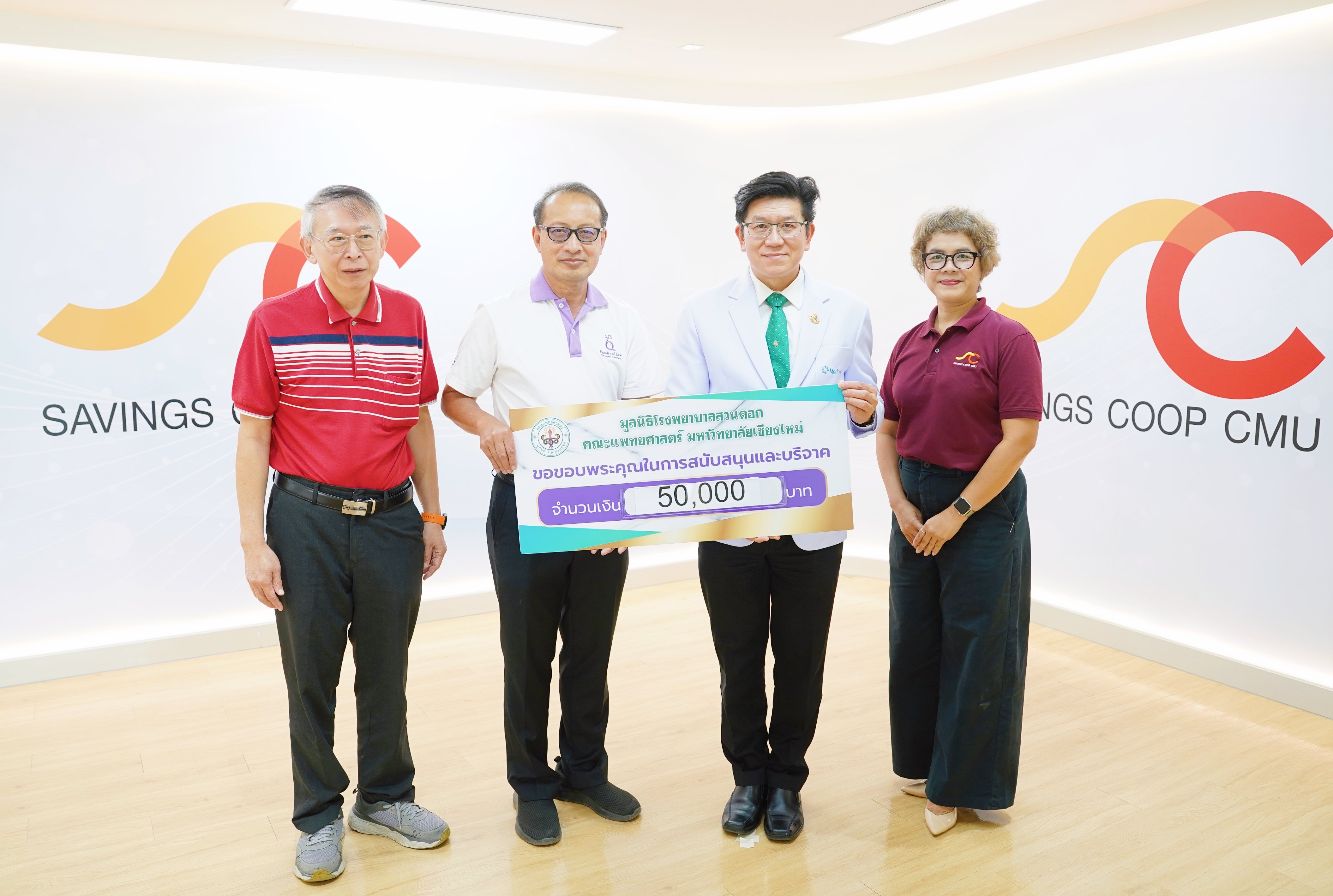 รศ.นพ.นเรนทร์ โชติรสนิรมิต คณบดีคณะแพทยศาสตร์ มหาวิทยาลัยเชียงใหม่ รับมอบเงินบริจาคจำนวน 50,000 บาท จาก คณะกรรมการดำเนินการ สหกรณ์ออมทรัพย์มหาวิทยาลัยเชียงใหม่ จำกัด เนื่องในโอกาส “วันมหิดล” สมทบทุนราชสมาทร เพื่อผู้ป่วยยากไร้ โรงพยาบาลมหาราชนครเชียงใหม่