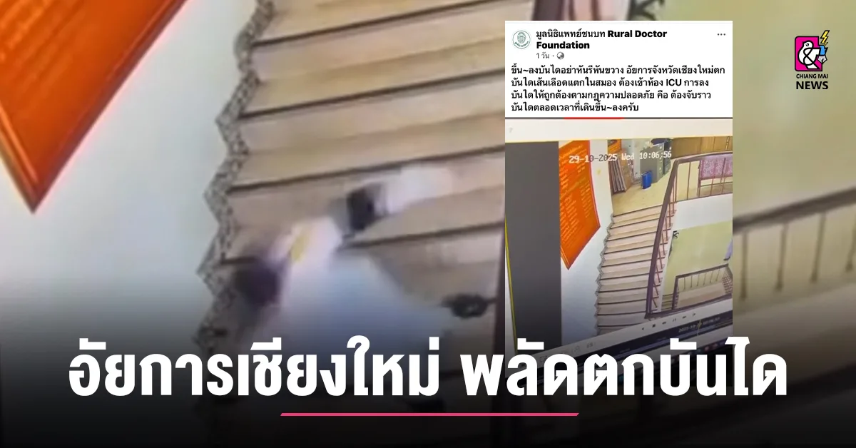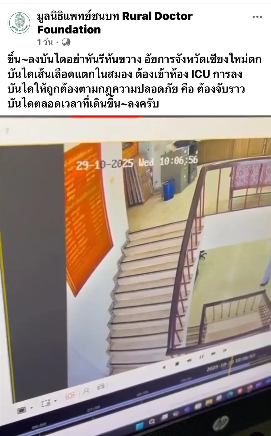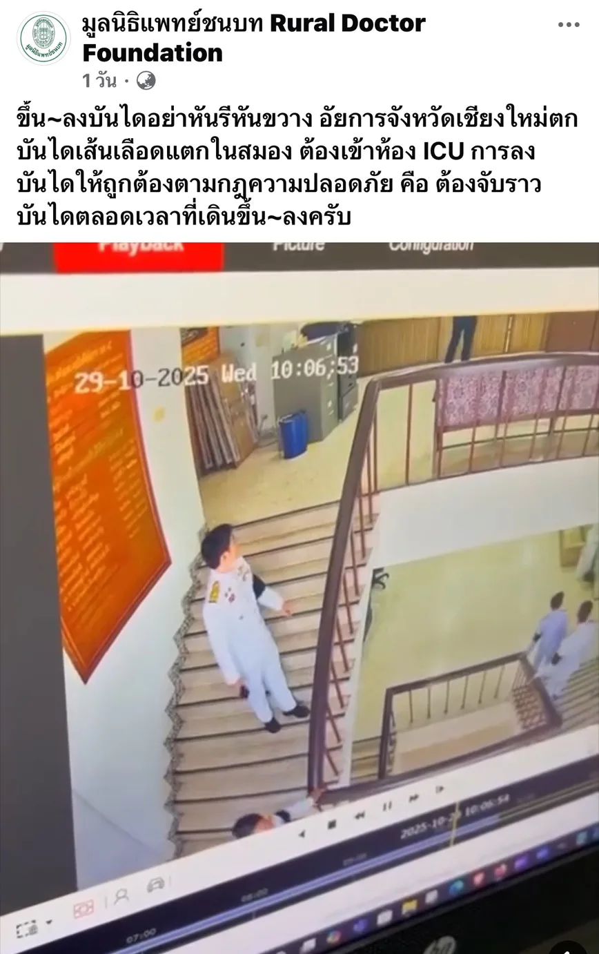 วันที่ 31 ต.ค.2568 มีรายงานว่า จากเพจ มูลนิธิแพทย์ชนบท Rural Doctor Forndation ได้โพสต์ข้อความและคลิป เหตุการณ์ “ขึ้น~ลงบันไดอย่าหันรีหันขวาง อัยการจังหวัดเชียงใหม่ตกบันไดเส้นเลือดแตกในสมอง ต้องเข้าห้อง ICU การลงบันไดให้ถูกต้องตามกฎความปลอดภัย คือ ต้องจับราวบันไดตลอดเวลาที่เดินขึ้น~ลงครับ”