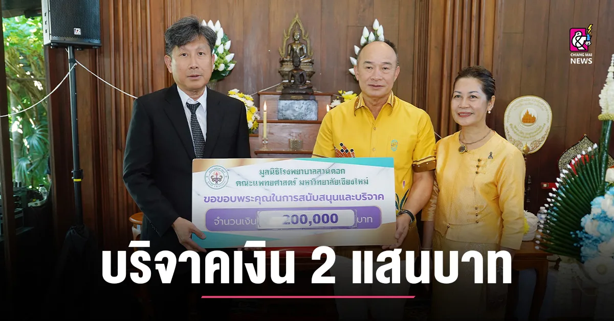 จาก พล.ต.อ.ประจวบ วงศ์สุข ที่ปรึกษา รัฐมนตรีว่าการกระทรวงการท่องเที่ยวและกีฬา, อดีตรองผู้บัญชาการตำรวจแห่งชาติ และผศ.พรพิมล วงศ์สุข รองอธิการบดี มหาวิทยาลัยราชภัฏเชียงใหม่ สมทบทุนมูลนิธิโรงพยาบาลสวนดอก เพื่อเครื่องเลเซอร์สำหรับผ่าตัด หู คอ จมูก และกล่องเสียง