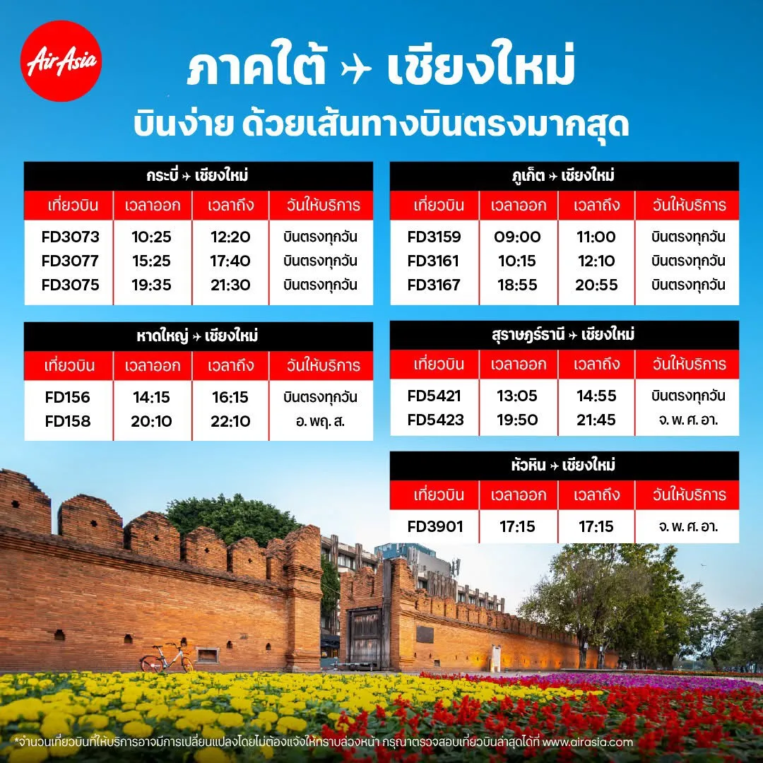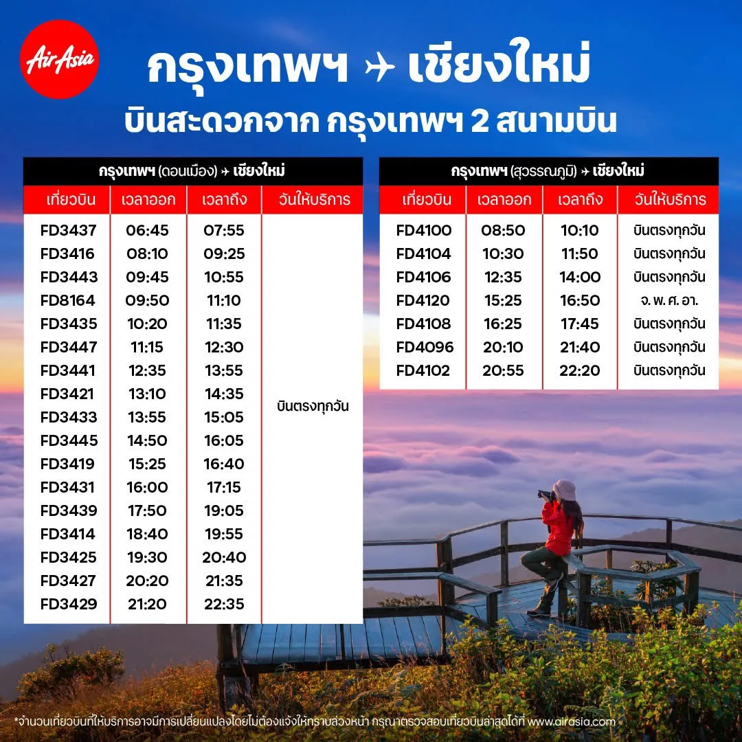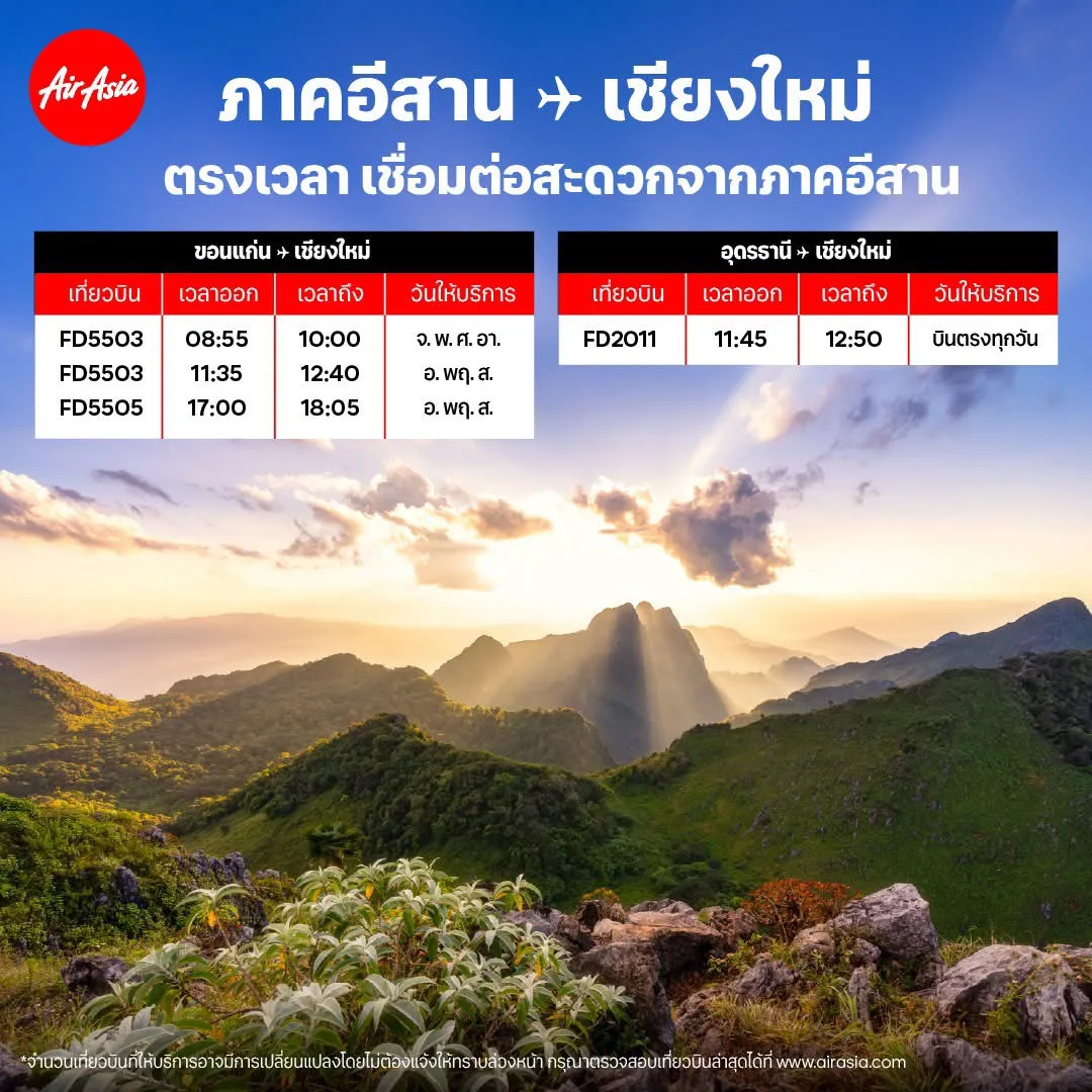 เชียงใหม่ 15 พฤศจิกายน 2568 แอร์เอเชียชวนจาวเชียงใหม่ บินม่วนใจ๋กับแอร์เอเชีย ส่งท้ายปี กับ 13 เส้นทางบินทั้งในและต่างประเทศมากที่สุด พร้อมราคาโปรโมชั่นเริ่มต้นที่ 999 บาทต่อเที่ยวบิน ม่วนบินตรงข้ามภาค “เชียงใหม่-อุดรธานี” 4 เที่ยวบินต่อสัปดาห์ ทุกวันจันทร์ พุธ ศุกร์และอาทิตย์ เริ่มบิน 1 ธันวาคม 2568 เริ่มจองได้แล้วตั้งแต่วันนี้ ถึงวันที่ 30 พฤศจิการยน 2568 เพื่อใช้เดินทางได้ตั้งแต่วันที่ 1 ธันวาคม 2568 – วันที่ 28 มีนาคม 2569